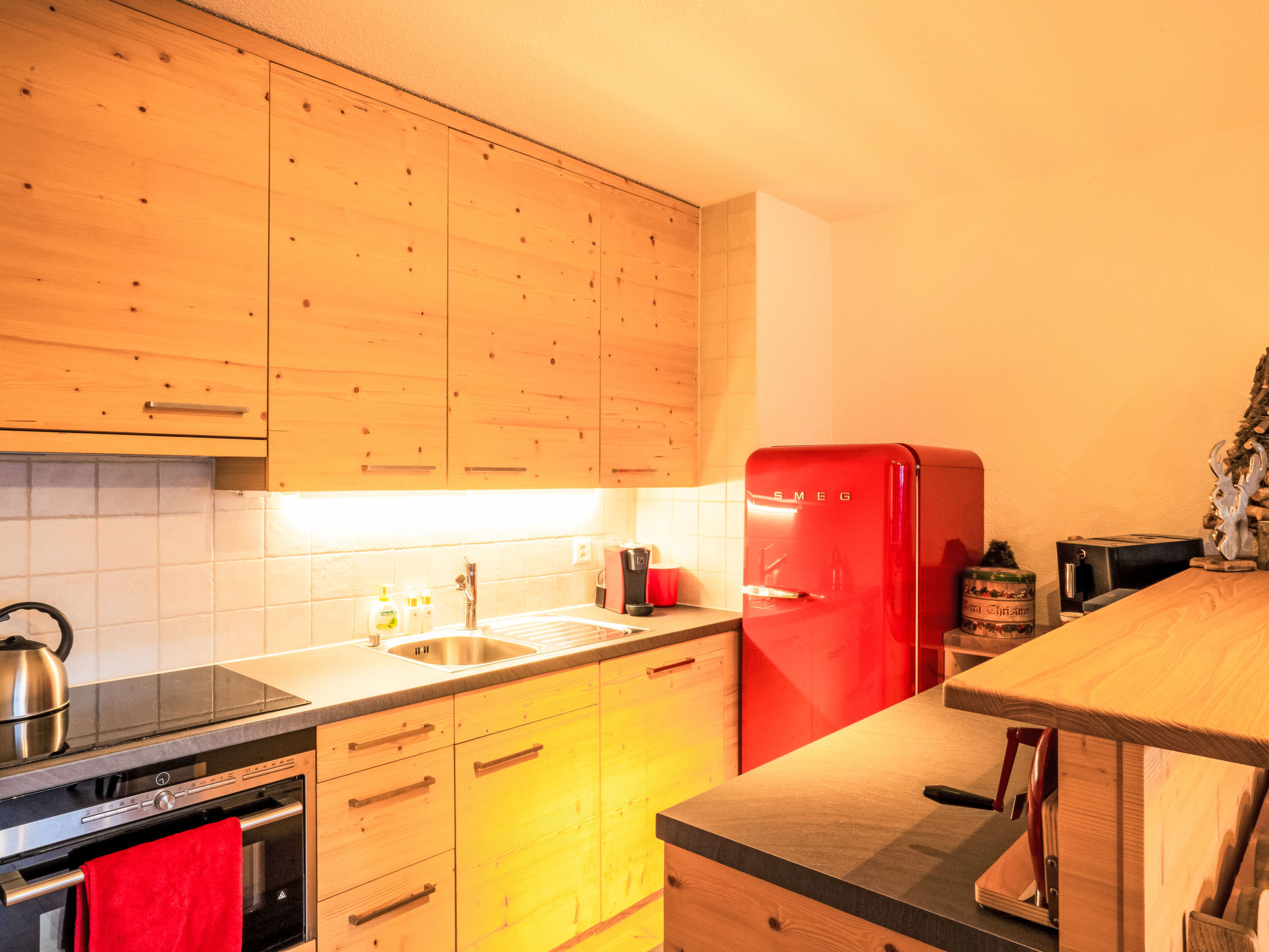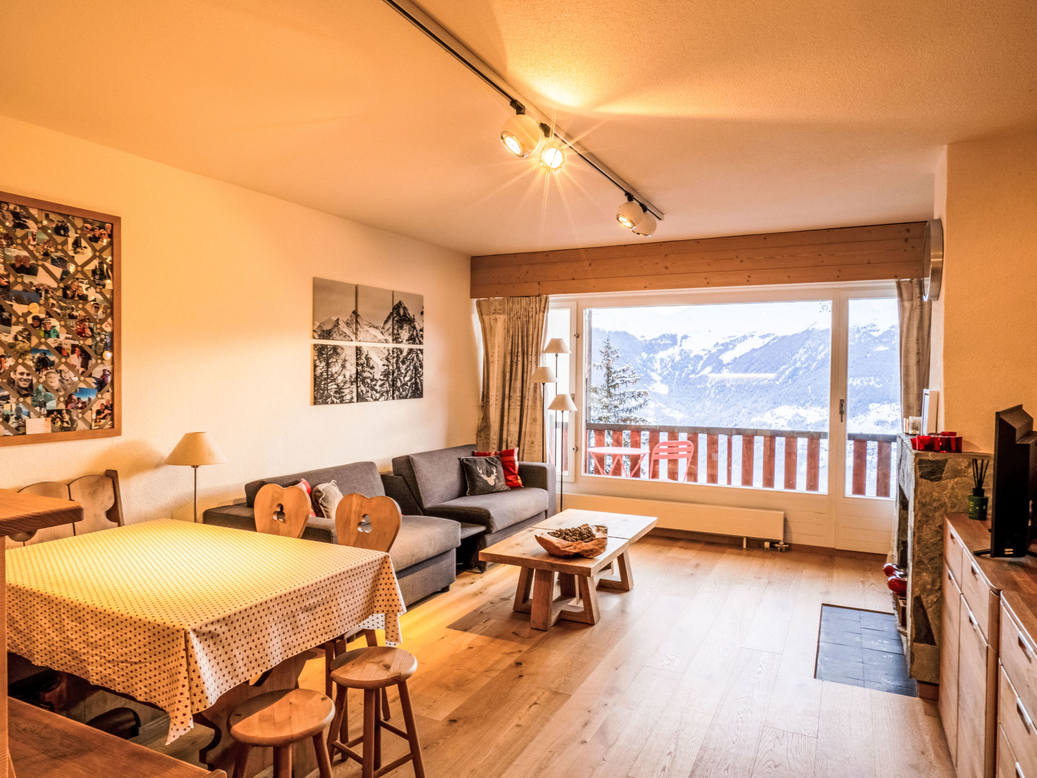 "Hameau A4", 2-room apartment on the ground floor. Fully renovated, comfortable and tasteful furnishings: living/dining room. Exit to the balcony, east facing position. 1 room with 2 beds (90 cm, length 190 cm), 1 x 2 bunk beds (90 cm, length 190 cm). Open kitchen (oven, dishwasher, 4 ceramic glass hob hotplates). Bath/WC. Balcony. Balcony furniture. Very beautiful view of the mountains and the valley. Please note: non-smokers only.