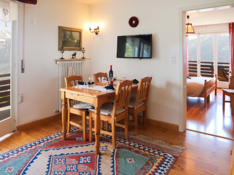 "Europa Est 2 / APT 83", 3-room apartment 58 m2 on 3rd floor. Living/dining room with cable TV. Exit to the balcony, east facing position. 1 room with 1 french bed (160 cm, length 200 cm). Exit to the balcony, south facing position. 1 room with 1 x 2 bunk beds (90 cm, length 200 cm). Kitchen (4 hot plates, oven, toaster, kettle, electric coffee machine, Capsules for coffee machine (Nespresso) extra, raclette grill). Bathroom, sep. WC. Small balcony 7 m2, small balcony 4 m2. Balcony furniture. Very beautiful view of the mountains, the valley and the countryside. Facilities: hair dryer. Internet (WiFi, free). Garage space n E2 at 80 m, height 200 cm, width 220 cm. Please note: non-smokers only.