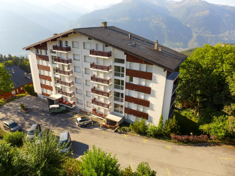 Apartment house "Europa 2 Est / Ouest". Below Montana, in the district of Combaz, 1.4 km from the centre of Montana, in a quiet position, 2.1 km from the lake, 1.3 km from the skiing area, in a cul-de-sac, south facing position. In the house: lift, storage room for skis, central heating system. Parking (limited number of spaces) at the house, communal covered parking at the house at 80 m. Shop 1.4 km, supermarket 1.5 km, restaurant 1.4 km, bakery 700 m, bus stop "Comba" 400 m, railway station "Funiculaire Montana Gare" 1.3 km, bathing lake "Moubra" 2.4 km, lake Grenon 2.1 km. Golf course (18 hole) 3.6 km, skisport facilities 1.3 km, ice rink 2 km. Well-known lakes can easily be reached: Lac de la Moubra 2.4 km. Please note: ski bus (free of charge).