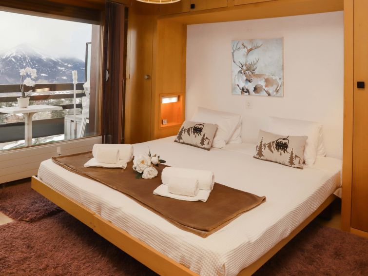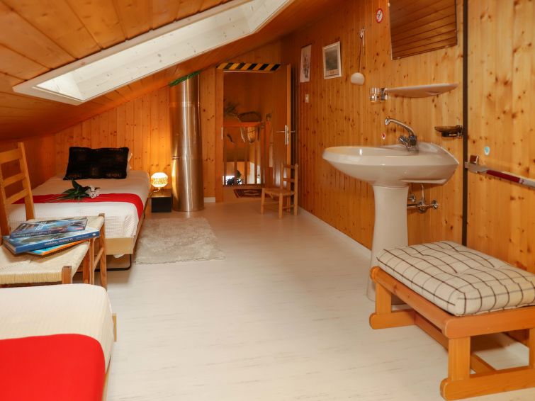 "Muverans I C3", 4-room apartment 60 m2 on 3rd floor. Beautiful furnishings: living/dining room with open-hearth fireplace (only for decoration), cable TV. Exit to the balcony, south facing position and south-east facing position. 1 room with 2 beds. Exit to the balcony, north facing position and west facing position. Kitchen (4 hot plates, oven, dishwasher, microwave, freezer, electric coffee machine, Capsules for coffee machine (Nespresso) extra, raclette grill, fondue Set (cheese)). Bath/WC, shower. Upper floor: 1 room with sloping ceilings, ceiling height 60 - 150 cm with rooflight with 2 beds. Interconnecting room with sloping ceilings with rooflight with 2 beds. Balcony furniture, electric barbecue, deck chairs (2). Beautiful view of the mountains and the resort. Facilities: Internet (WiFi, free). Parking space n 28 (roofed), height 200 cm, width 295 cm. Please note: non-smokers only.