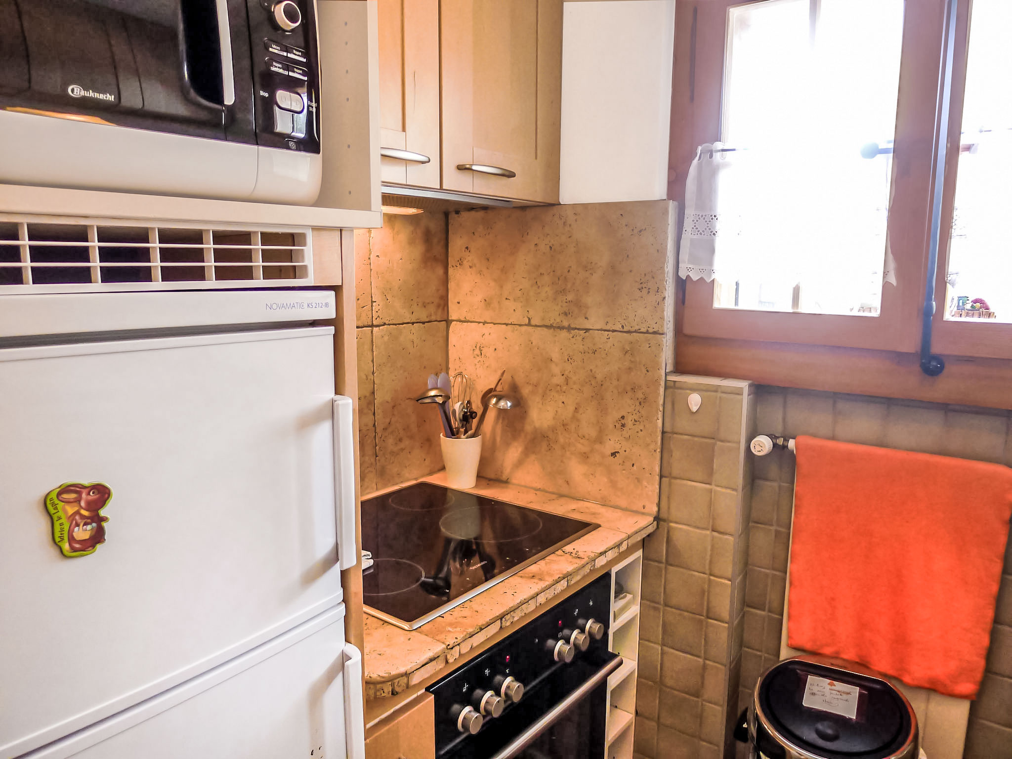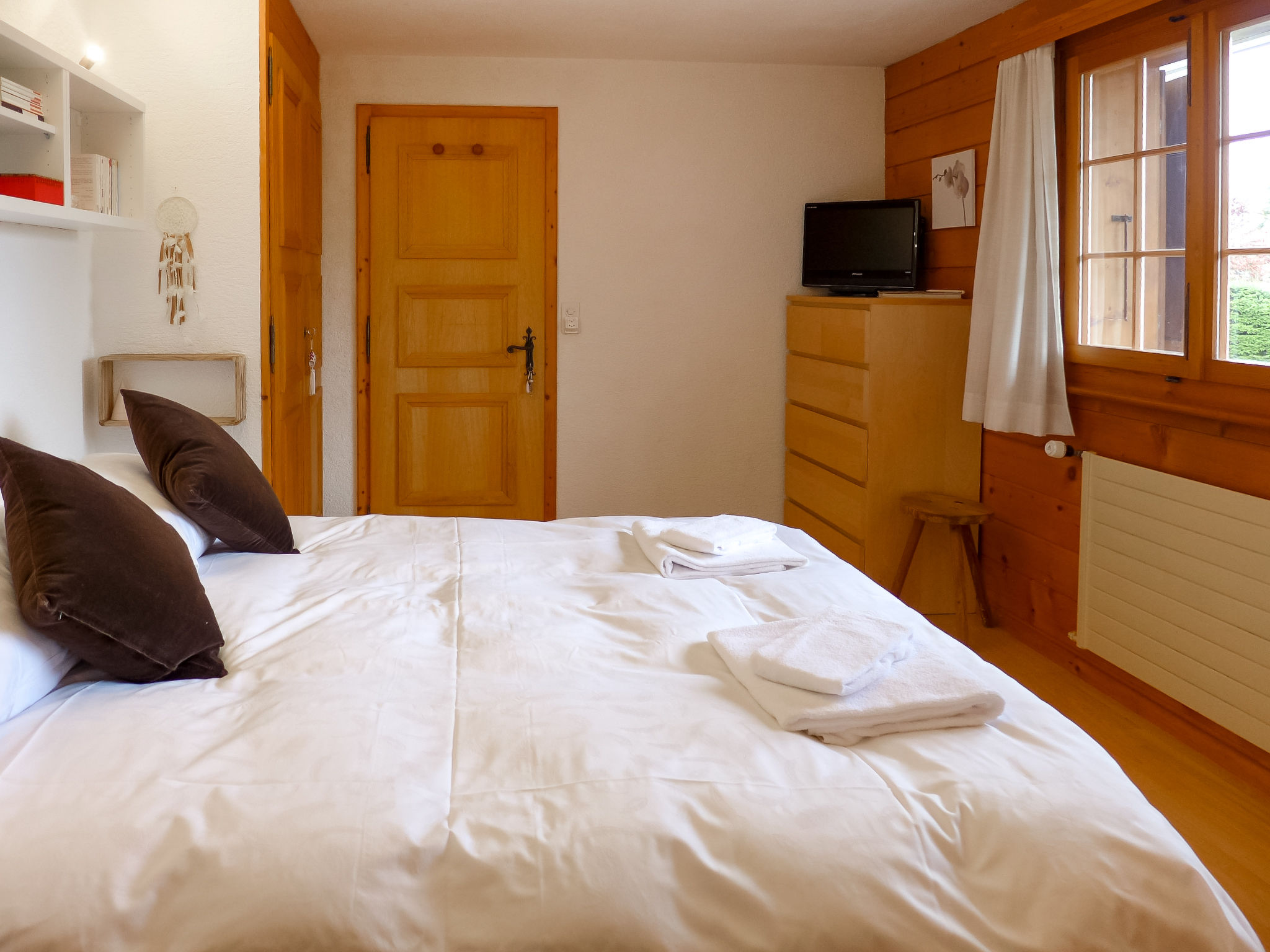 "Les Seracs 1", 2-room apartment 45 m2, on the upper ground floor, south facing position. Comfortable and beautiful furnishings: living/dining room with 1 double sofabed, Scandinavian wood stove and satellite TV (flat screen). Exit to the terrace. 1 room with 1 french bed. Small kitchen (oven, dishwasher, 4 ceramic glass hob hotplates, kettle, microwave, freezer, raclette grill). Bathroom, sep. WC. Terrace. Terrace furniture. Partial view of the mountains. Facilities: hair dryer. Internet (WiFi, free). Parking space n 1. Please note: non-smoking house.