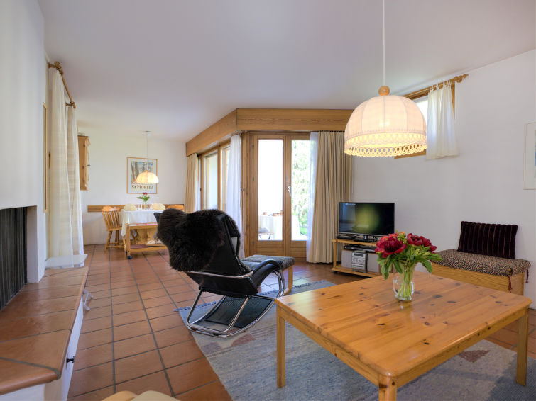 "Chesa Maurus A1", 2-room apartment 63 m2, on the ground floor. Comfortable and cosy furnishings: living/dining room with 1 double sofabed (1 x 140 cm, length 200 cm), open-hearth fireplace, satellite TV and hi-fi system. Exit to the patio, south facing position. 1 room with 1 double bed (2 x 90 cm, length 200 cm). Kitchen (oven, dishwasher, toaster, kettle, electric coffee machine, Capsules for coffee machine (Nespresso) extra, fondue Set (cheese)). Bath/WC. Patio. Terrace furniture. View of the mountains. Facilities: iron, hair dryer. Internet (WiFi, free). Garage space n 22, height 188 cm, width 200 cm. Please note: non-smokers only. Maximum 1 pet/ dog allowed.