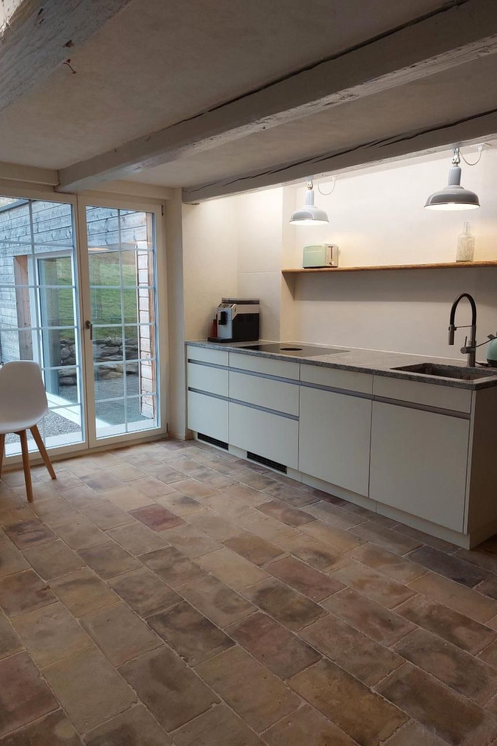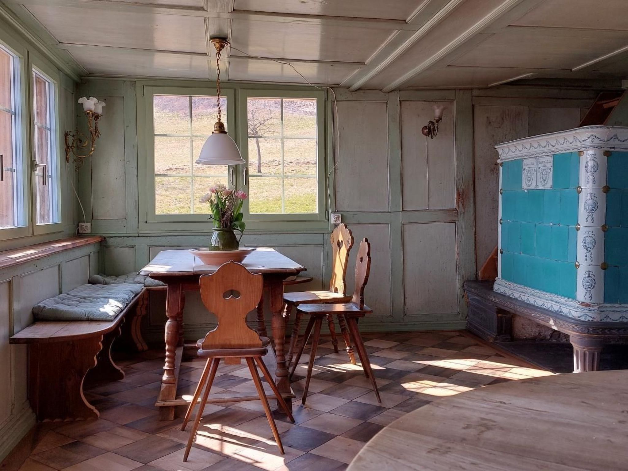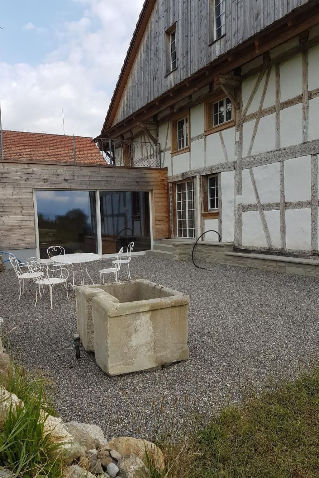 This timber-framed farmhouse, which will be renovated over several years using traditional and natural materials by spring 2022, is located just outside the city of Zurich. It is surrounded by partly old fruit trees, dry stone walls, rough pastures and agricultural land. The mown meadow garden, the large gravelled area in front of the kitchen and living room and the raised terrace invite you to relax and enjoy. The view extends from the city of Zurich across Lake Zurich to the distant mountains, some of which are still covered in snow in summer.