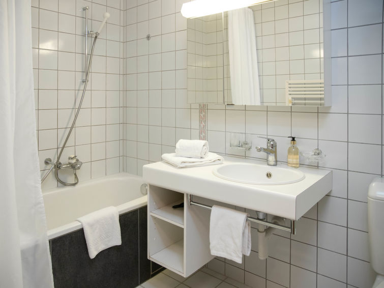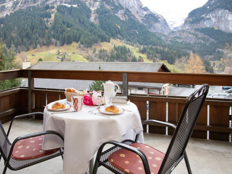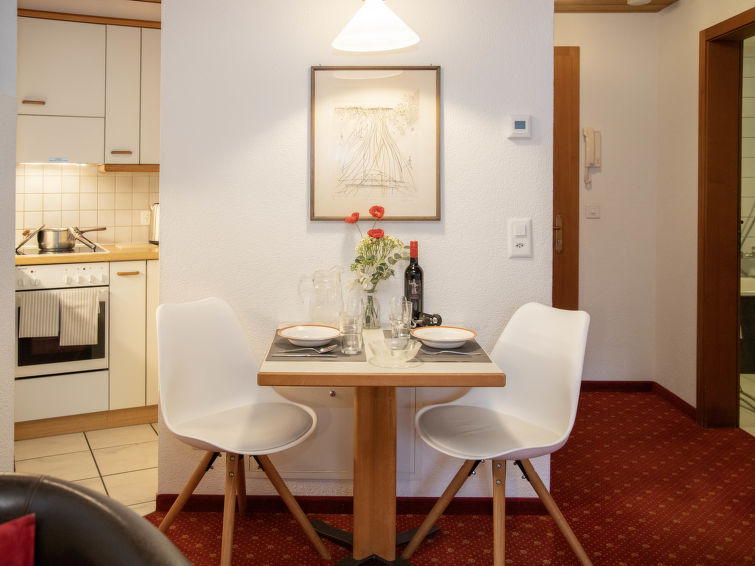 1-room apartment 27 m2 on 2nd floor, south facing position. Living/sleeping room with 2 beds and cable TV (flat screen). Open kitchen (oven, 4 ceramic glass hob hotplates, toaster, kettle, electric coffee machine) with dining table. Bath/WC. Balcony, south facing position. Balcony furniture. Beautiful view of the mountains and Eiger. Facilities: hair dryer. Internet (WiFi, free). Please note: non-smokers only. Maximum 1 pet/ dog allowed. A fondue set (meat or cheese) and a raclette oven can be borrowed from reception.
