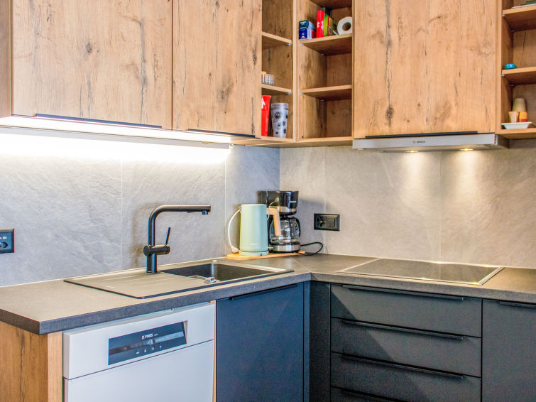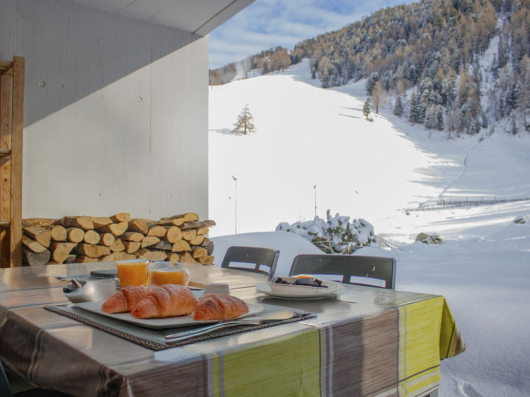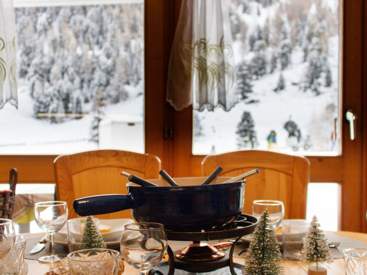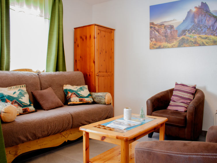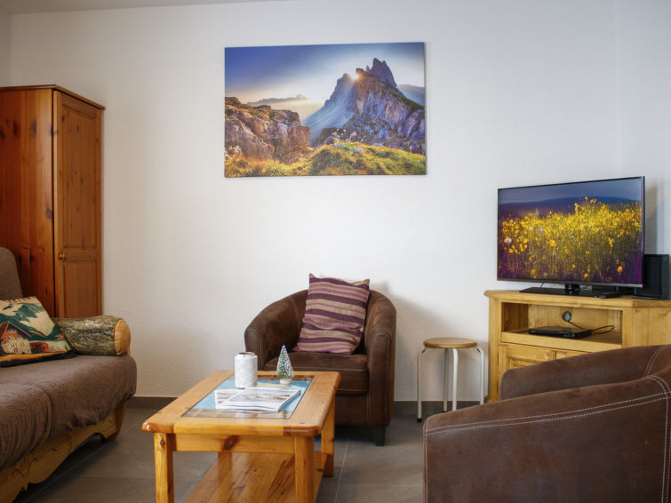 3-room apartment 85 m2 on 2 levels. Partly renovated in 2024, cosy furnishings: living/sleeping room with 1 double sofabed (160 cm, length 190 cm), Scandinavian wood stove, cable TV and DVD. Exit to the terrace, east facing position. Open kitchen (oven, dishwasher, 4 induction hot plates, toaster, kettle, microwave, raclette grill, fondue Set (cheese)). Bath/WC. Upper floor: 1 room with 2 beds (90 cm, length 200 cm). 1 room with 1 double bed. Shower/WC. Terrace, east facing position. View of the mountains. Facilities: Internet (WiFi). Parking space n 1 at 300 m. Please note: non-smokers only.
