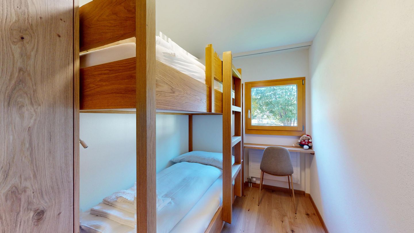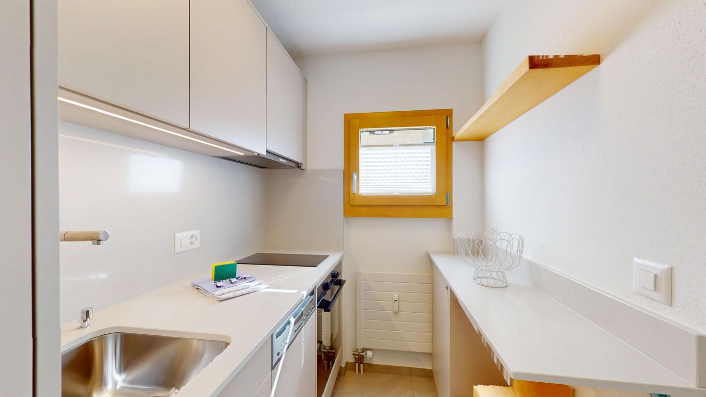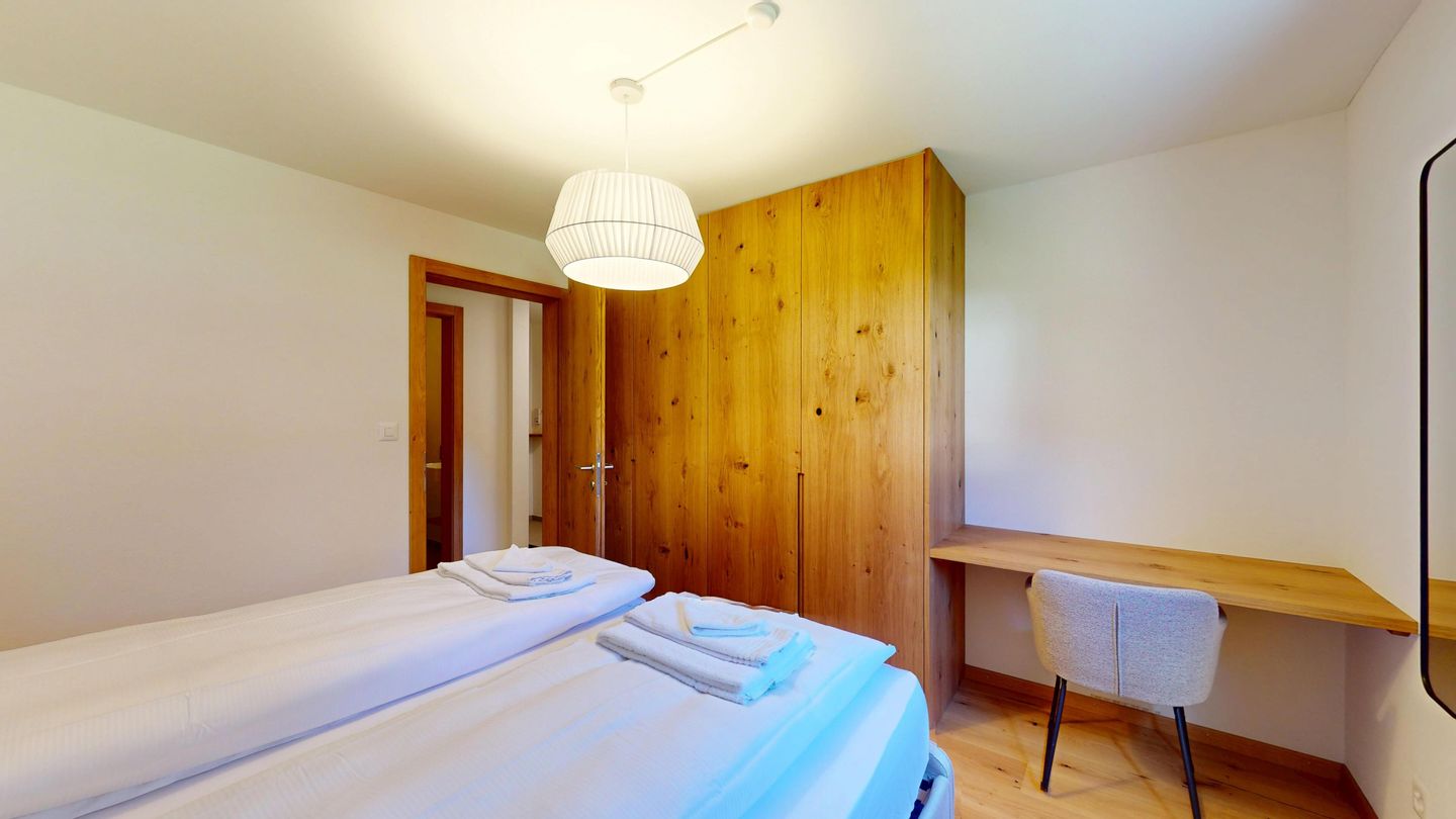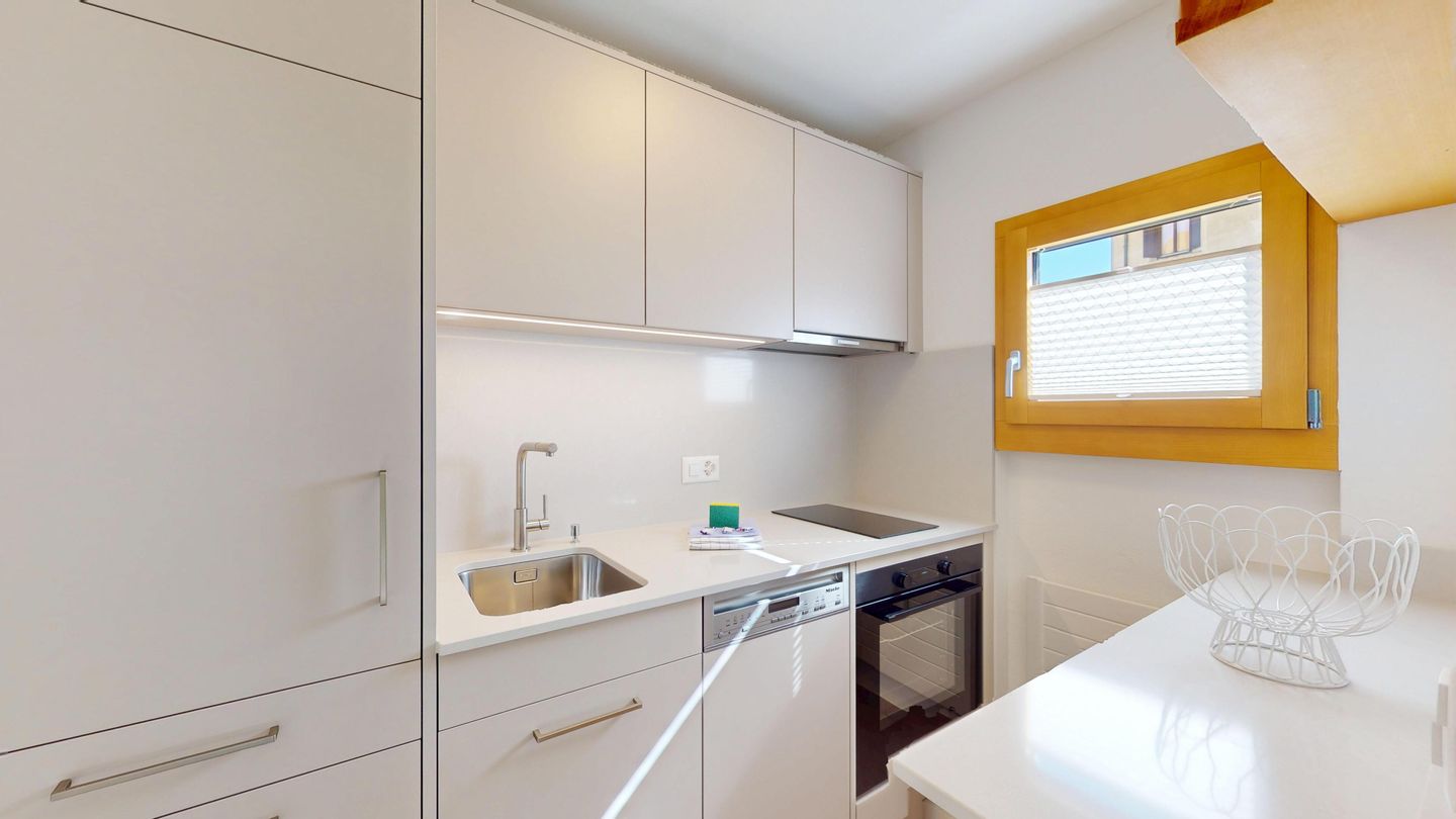 The newly and extensively renovated 3½ room apartment on the mezzanine floor offers modern comfort in a quiet location. It is ideal for families or couples. Entrance hall with cloakroom, bright living room with seating area, sofa, TV, access to the terrace with beautiful garden seating area. Modern small kitchen equipped with high-quality appliances: refrigerator with freezer compartment, dishwasher, induction hob with 2 hotplates, oven, toaster, kettle and Nespresso coffee machine. One double bedroom with a view of the garden. A second bedroom with a bunk bed. Bathroom with shower/WC, high-quality tiles and an elegant washbasin, additional guest WC. Garage parking space.