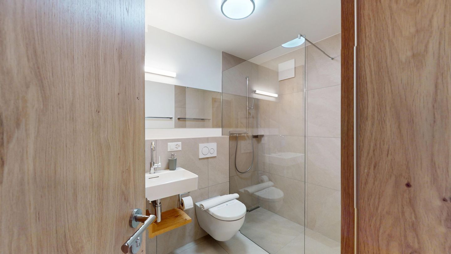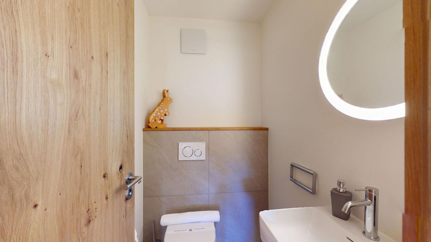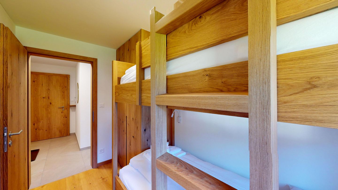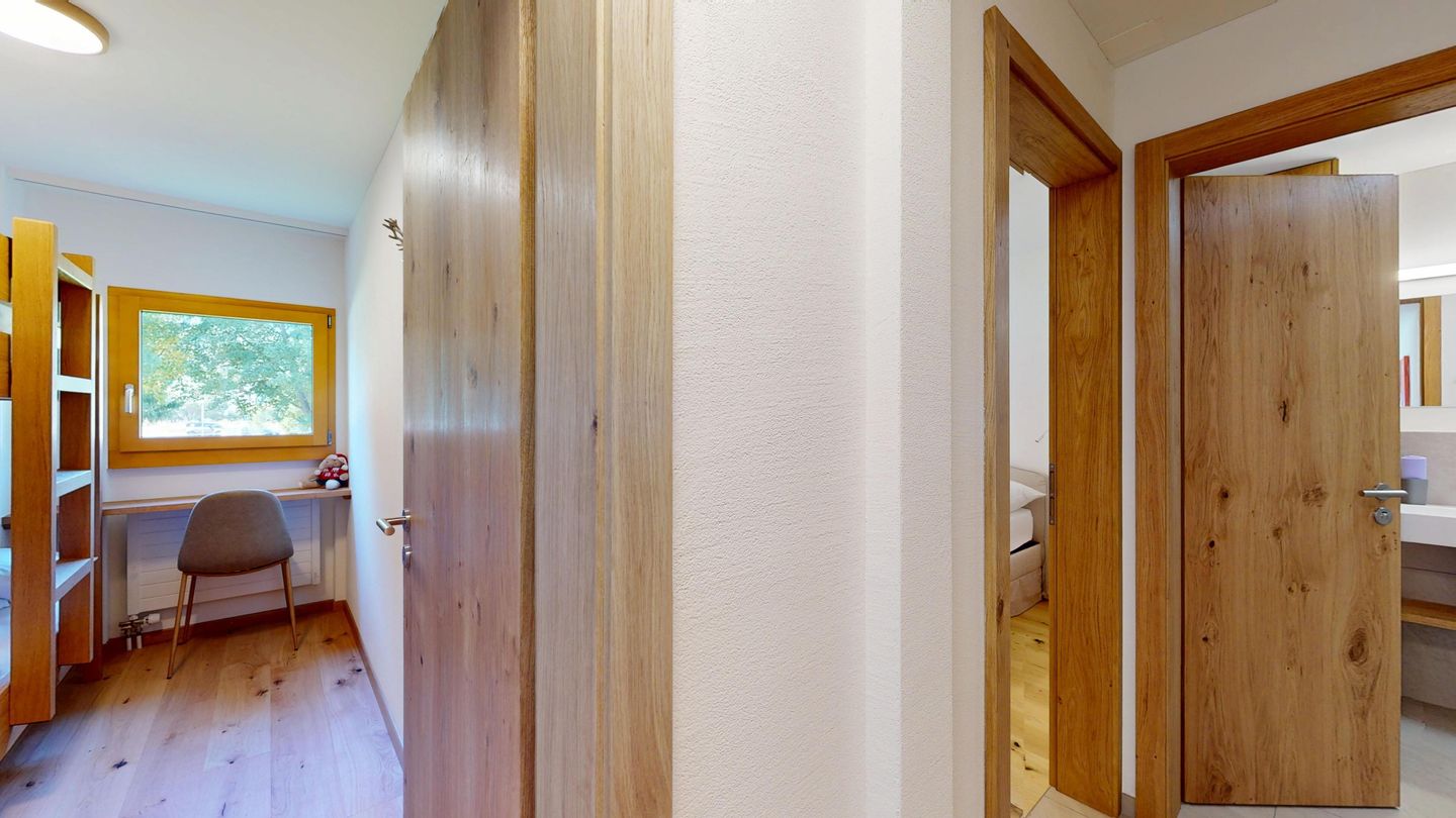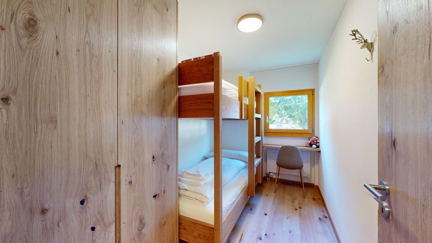 The newly and extensively renovated 3½ room apartment on the mezzanine floor offers modern comfort in a quiet location. It is ideal for families or couples. Entrance hall with cloakroom, bright living room with seating area, sofa, TV, access to the terrace with beautiful garden seating area. Modern small kitchen equipped with high-quality appliances: refrigerator with freezer compartment, dishwasher, induction hob with 2 hotplates, oven, toaster, kettle and Nespresso coffee machine. One double bedroom with a view of the garden. A second bedroom with a bunk bed. Bathroom with shower/WC, high-quality tiles and an elegant washbasin, additional guest WC. Garage parking space.