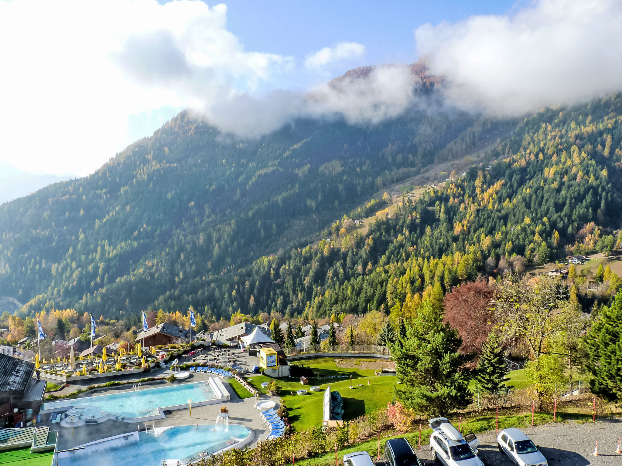 Centre thermal: The swimming pools and spa are part of the Thermal Centre and entrance fees are not included in the rental price. Prices can be found on their website. Residence "Sources, Thermalies, Eaux-Vives", 3 storeys. In the district of Mayen Blanc, in a quiet, sunny position, 1.5 km from the skiing area. For shared use: indoor pool (extra). In the complex: restaurant, bar, breakfast room, sauna, fitness room, massage, steam room, solarium, hot tub (all extra), kiosk, lift, storage room for skis, central heating system, washing machine (extra), tumble dryer (extra). Motor access to the house. Communal covered parking. Shop, bakery 900 m, bus stop 50 m, thermal baths "directement accessible" 50 m. Golf course (18 hole) 25 km, tennis 1.8 km, ski bus stop 50 m, cross country ski track 1.8 km. Please note: baby equipment on request. Ski bus (free of charge). Free ski bus service to the ski region d'Ovronnaz. Please note: Additional accommodations can be booked.