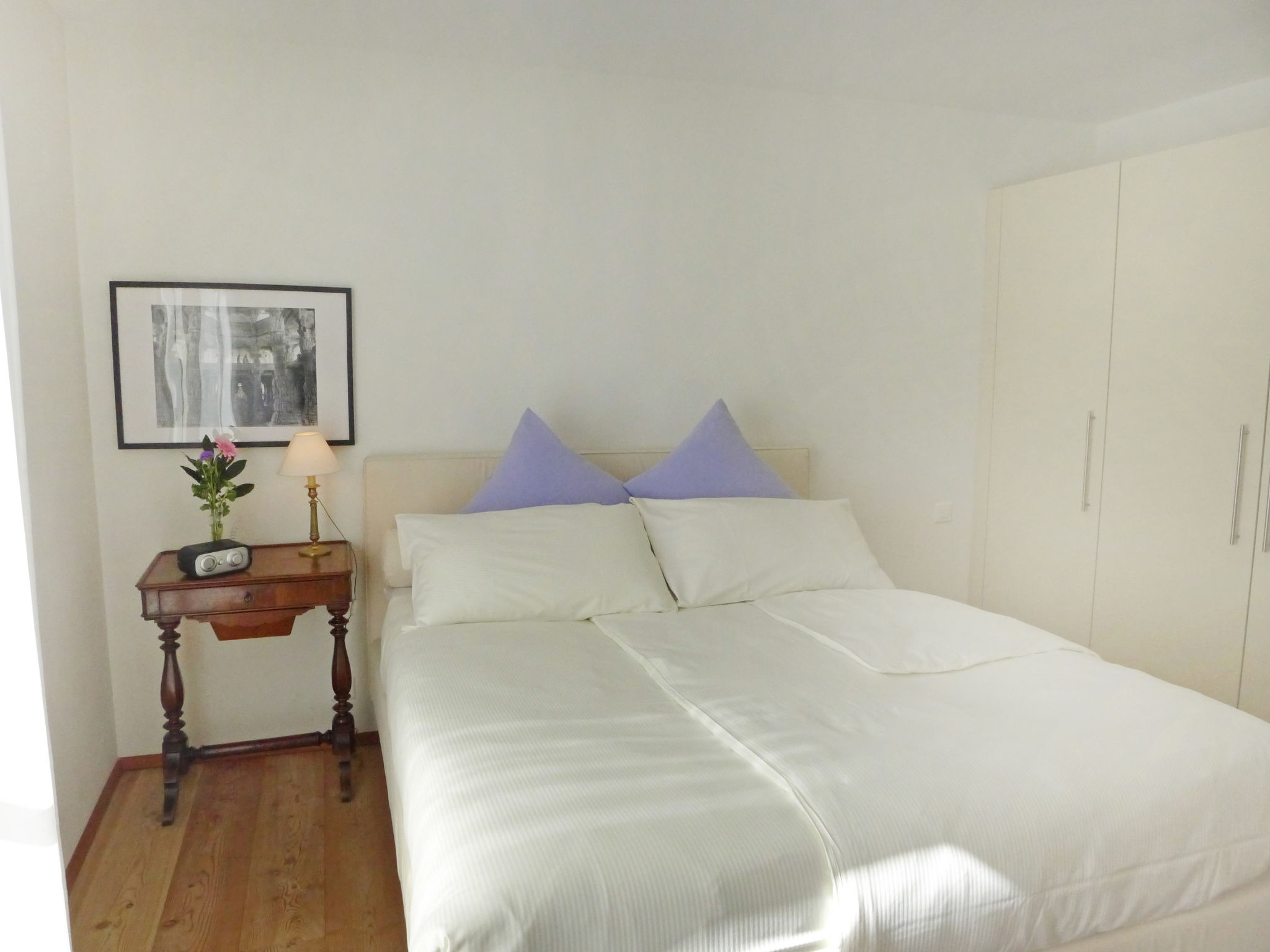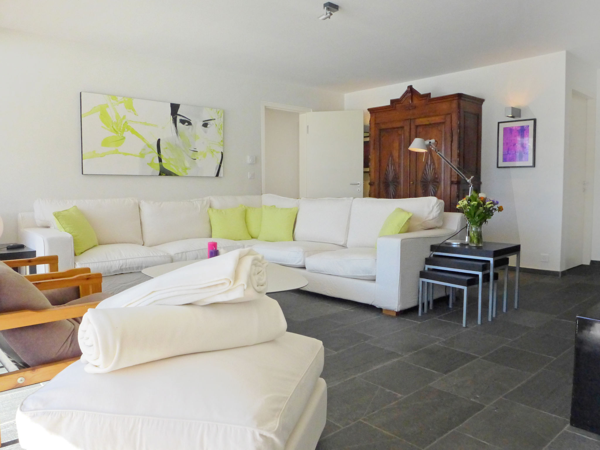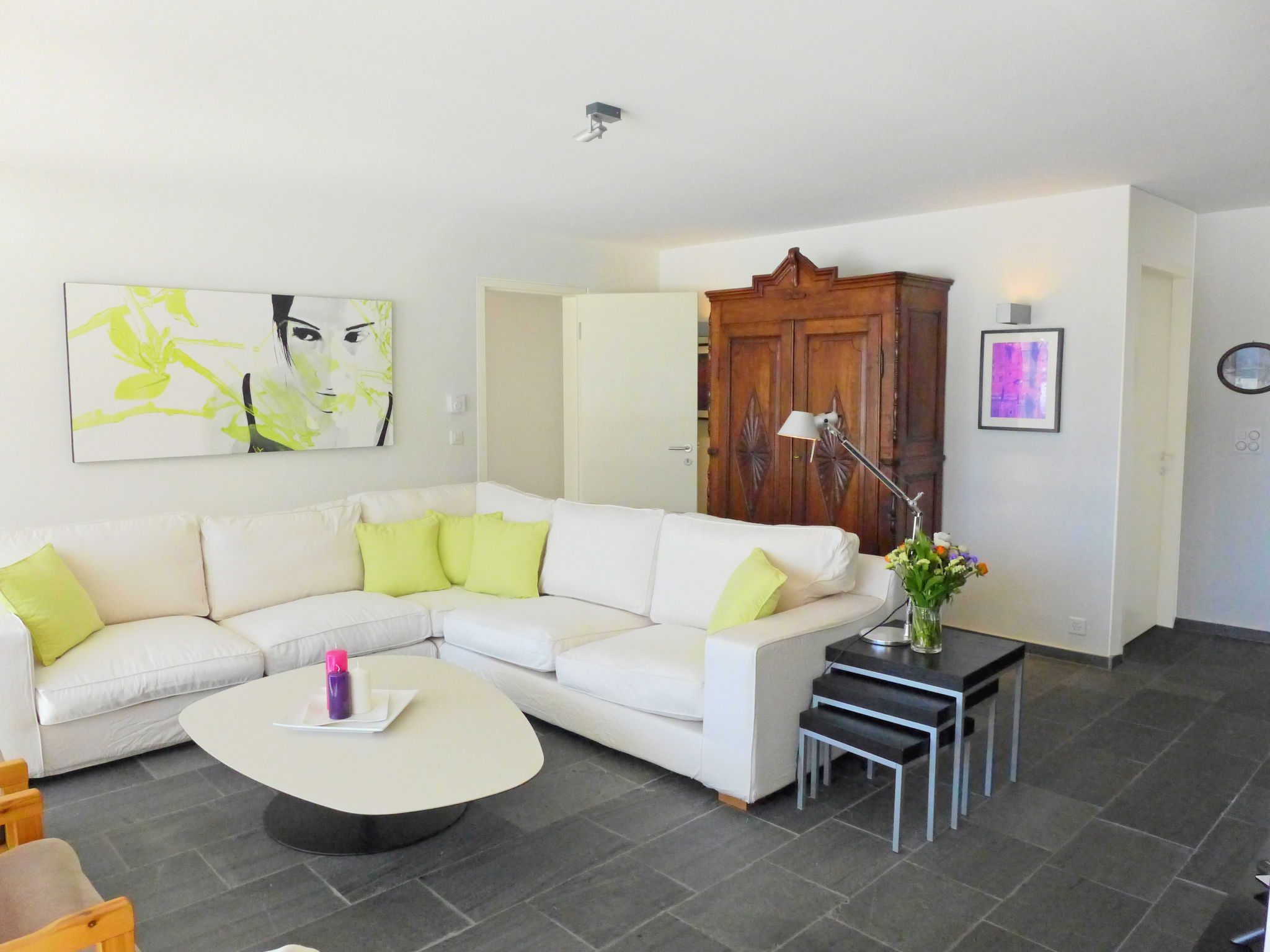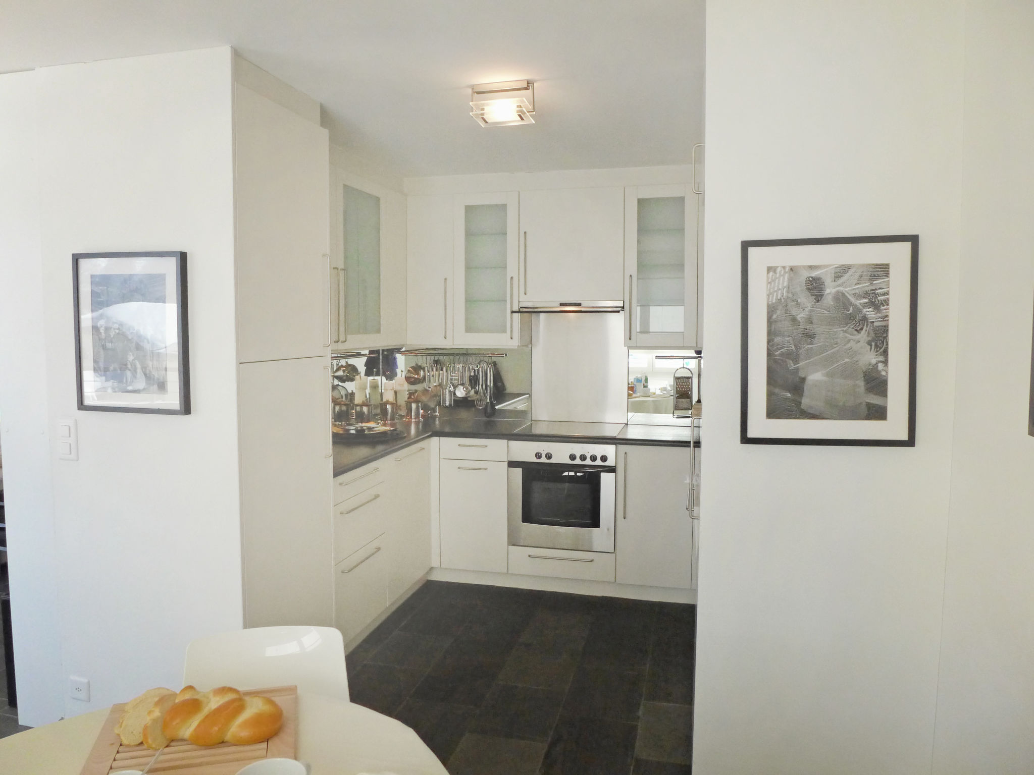 "Chesa Sur Puoz 7", 3-room apartment 95 m2 on 1st floor. Spacious and bright, comfortable and modern furnishings: living/dining room with panoramic window with TV (flat screen). Exit to the balcony. 1 double bedroom with 1 french bed (1 x 160 cm, length 200 cm). 1 room with 2 beds (95 cm, length 200 cm). Open kitchen (oven, dishwasher, 4 ceramic glass hob hotplates, freezer, electric coffee machine, Capsules for coffee machine (Nespresso) extra). Bath/bidet/WC, shower/WC. Heating. Wooden floors, natural stone floors. Terrace furniture (2). Marvellous panoramic view of the mountains and the resort. Facilities: iron, hair dryer. Internet (WiFi, free). Garage space n 14 on the property (1 car), height 235 cm, width 310 cm. Please note: non-smokers only, non-smoking house. Maximum 1 pet/ dog allowed.