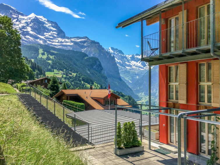 Beautiful apartment block "Schweizerheim", renovated in 2002. 2 apartments in the property. 700 m from the centre of Wengen, in a quiet, sunny position. In the house: lift, central heating system. Pre-arrival grocery service. Shop, supermarket 700 m, restaurant 400 m, bar, bakery 700 m, 10 minute walk to the centre, bus stop "Lauterbrunnen (by train)" 3.7 km, railway station "Wengen" 700 m. Cable car, skisport facilities 700 m, children's playground 400 m. Well-known lakes can easily be reached: Thunersee 13 km, Brienzersee 13 km. Please note: car-free holiday complex. Arrival via mountain railway. Additional accommodations can be booked. Arrival is only possible by train from Lauterbrunnen – 14 minutes travel time.