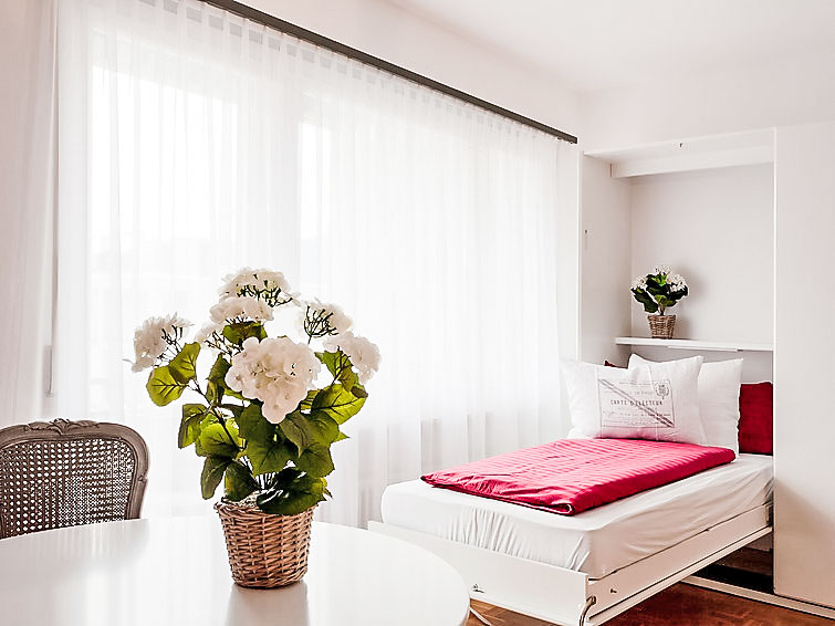 "Double Room", 1-room apartment 35 m2 on 4th floor, south facing position. Practical furnishings: living/dining room with 2 fold-away beds (90 cm, length 200 cm), satellite TV and radio. Kitchen (4 hot plates, oven, dishwasher, electric coffee machine, Capsules for coffee machine (Nespresso) extra). Bath/WC. Forced-air heating. Balcony. Terrace furniture. View. Facilities: Internet (WiFi, free). Please note: non-smokers only. Maximum 1 pet/ dog allowed. NL-00005003