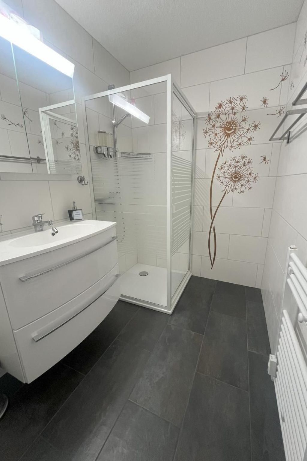 Inside the flat, you will find a bright living room with panoramic windows, a comfortable corner sofa and TV, inviting you to relax. Free WLAN. The adjoining dining area with extendable glass table and a fully equipped kitchen round off the offer. Two bedrooms, one with a double bed and one open-plan with two single beds (darkening and privacy through light-proof curtains) ensure your peace and quiet. A modern bathroom with shower (incl. shower gel and shampoo) offers additional comfort.