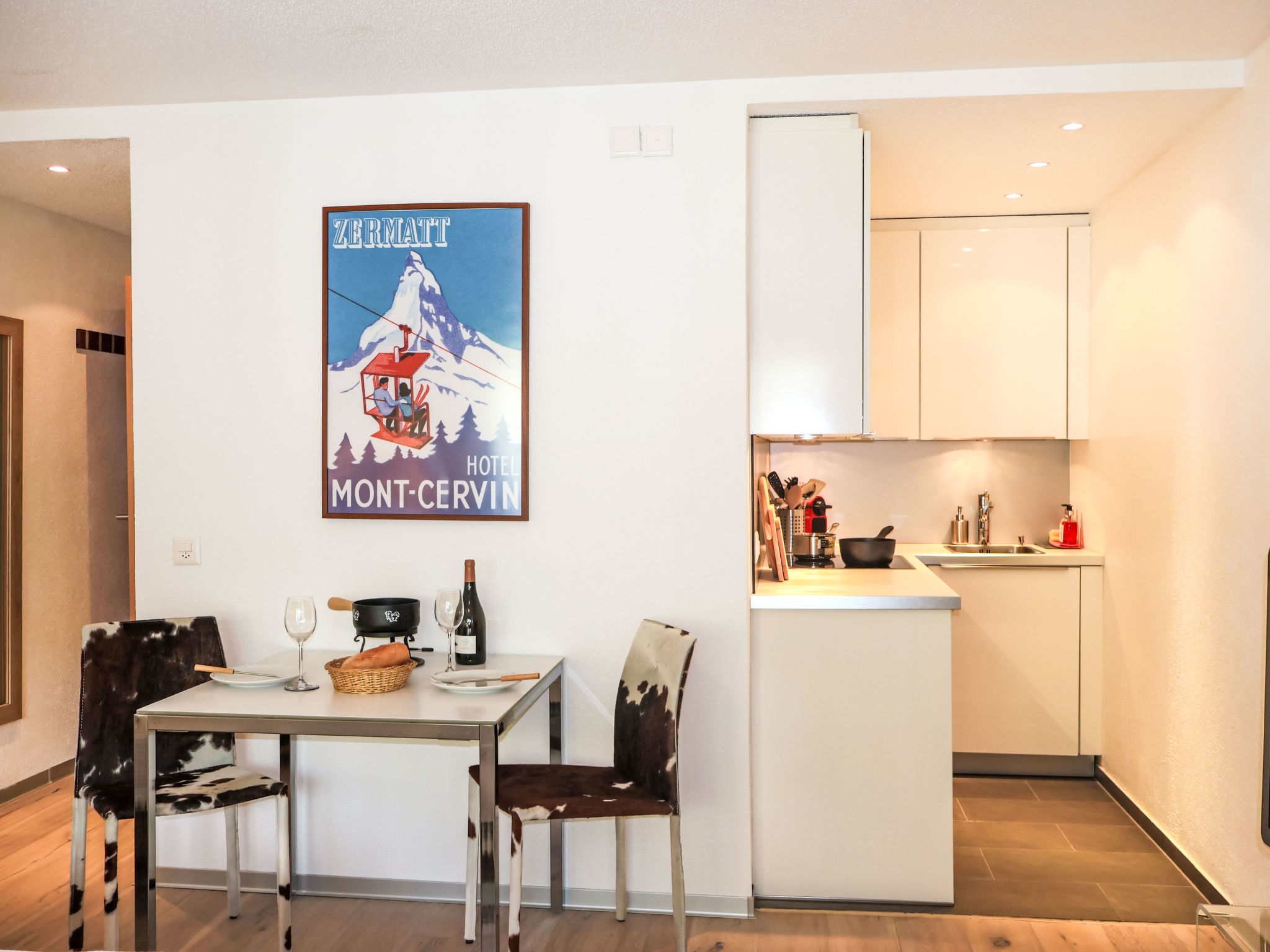 "Siesta", 1-room studio 30 m2 on 2nd floor. Bright, renovated in 2024, beautiful and cosy furnishings: open living/sleeping room with 1 double sofabed (160 cm, length 200 cm). Exit to the balcony. Open kitchen (oven, 4 ceramic glass hob hotplates, toaster, kettle, freezer, electric coffee machine) with dining table. Shower/WC. Parquet floors. Balcony. Balcony furniture. Very beautiful view of the mountains and the Matterhorn. Facilities: hair dryer. Internet (WiFi, free). Please note: non-smokers only.