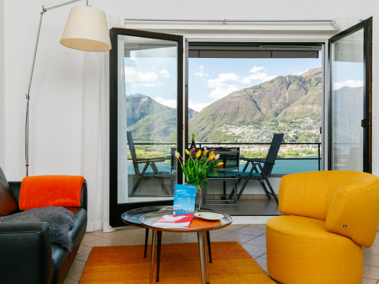 "Residenza Miralago Apt. A5", 3-room apartment 66 m2 on 1st floor, south facing position. Object suitable for 2 adults + 1 child. Spacious and bright, fully renovated in 2019, tasteful and cosy furnishings: open living/dining room with dining table and satellite TV (flat screen), radio and CD-player. Exit to the balcony. 1 double bedroom with 1 double bed (160 cm, length 200 cm). Exit to the balcony. 1 children's room with 1 bed (90 cm, length 200 cm). Open kitchen in the entrance (oven, dishwasher, 4 induction hot plates, electric coffee machine, Capsules for coffee machine (Nespresso) extra). Shower/WC. Heating. Balcony. Balcony furniture. Marvellous panoramic view of the lake, the mountains and the countryside. Please note: non-smokers only. NL-00003540