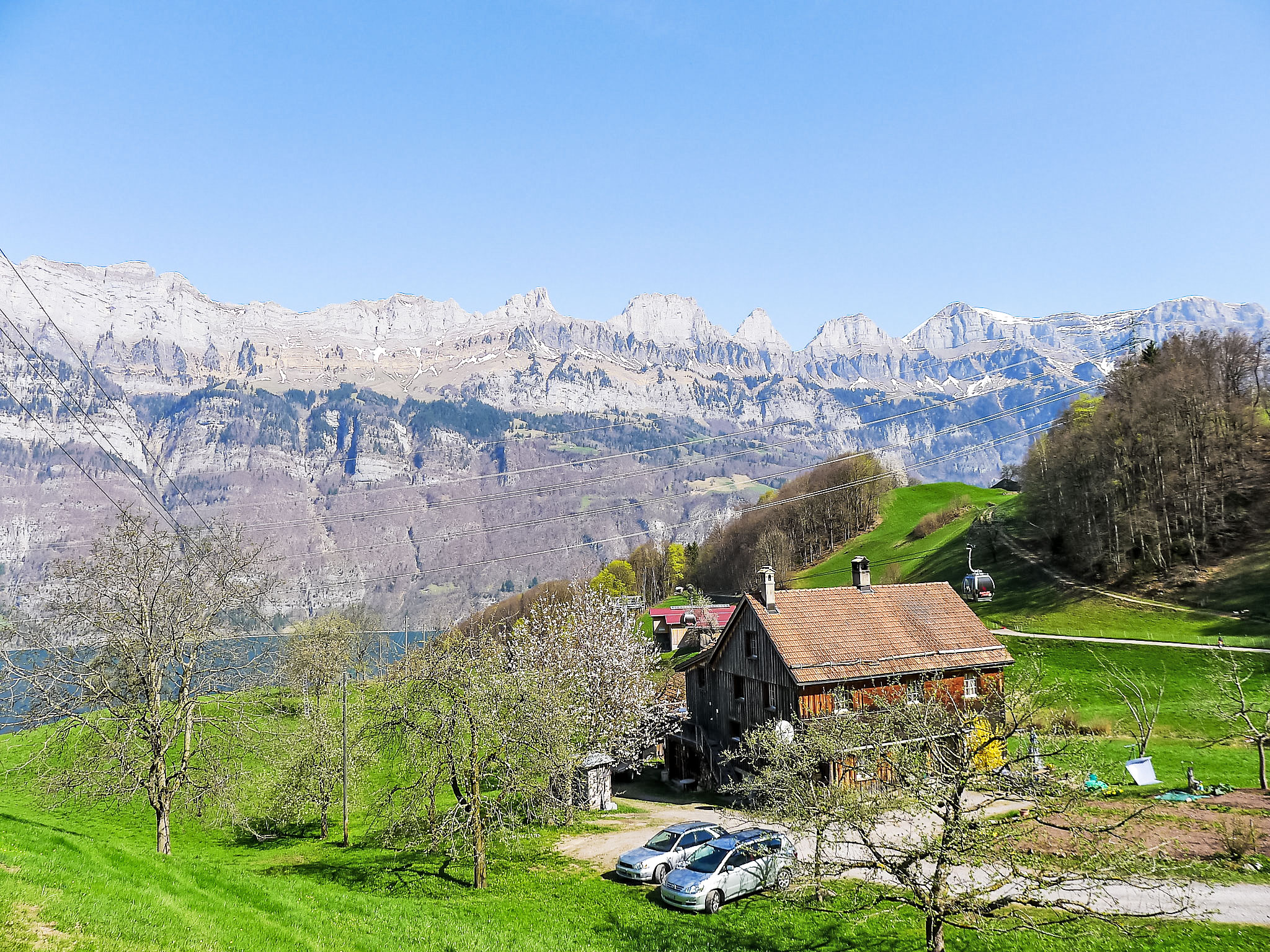 "Bünten", 3-room apartment 55 m2 on 2 levels on 1st floor. Simple and cosy furnishings: kitchen-/living room (oven, dishwasher, 4 ceramic glass hob hotplates, raclette grill, fondue Set (cheese)) with dining table. Upper floor: (steep stair) open living/sleeping room with curtain with 3 beds and satellite TV (flat screen). 1 room with 2 beds. Shower/WC. Large terrace. Terrace furniture. Beautiful view of the lake, the mountains and the countryside. Facilities: Internet (WiFi, free). Parking at the house. Please note: non-smokers only. Separate entrance. Kitchen/living accessible by stairs. Bedroom accessible by a steep staircase without bannister. Not recommended for the elderly or young children. Wooden floors.