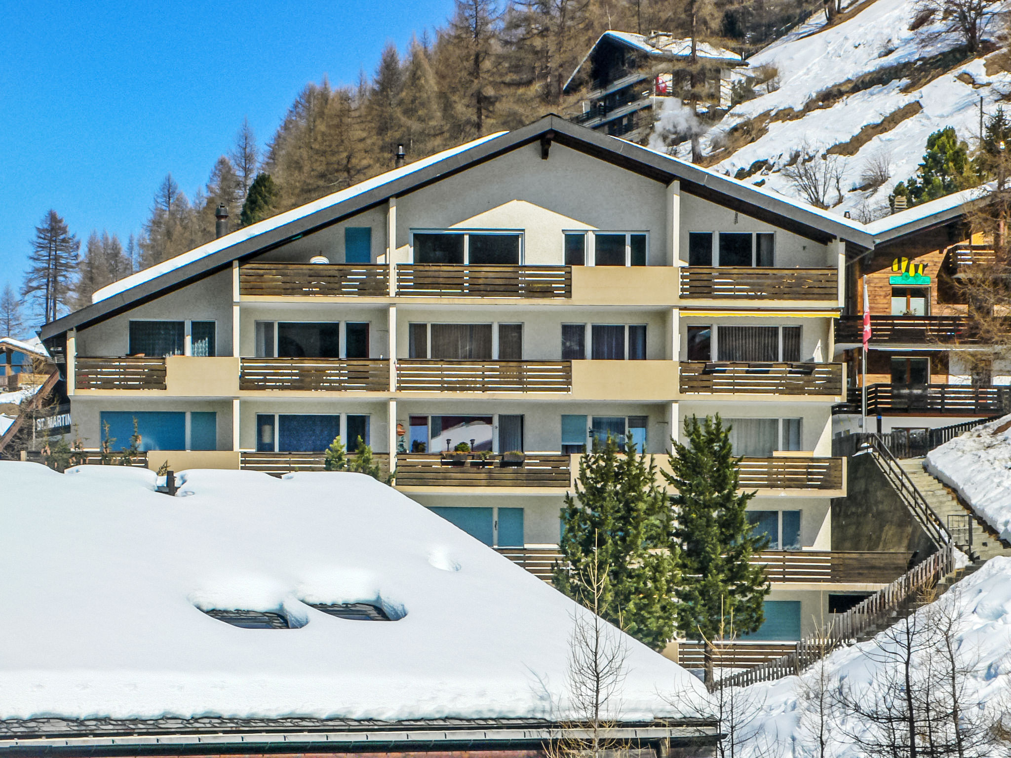 Large, simple apartment house "Kondor", 5 storeys. In the district of Gryfelblatte 600 m from the centre of Zermatt, in a quiet, sunny, elevated position on a slope. In the house: lift, storage room for skis, central heating system. Stepped path (96 steps) to the house. Supermarket 450 m, restaurant 70 m, bakery 600 m, 10 minute walk to the centre, bus stop "Wiestibrücke" 230 m, railway station "Bahnhof Zermatt" 600 m. Mountain railway, ski rental 450 m, ski bus stop 230 m, ski school 850 m, children's ski school. Cabs cannot stop right in front of the house. The keys‘ handover takes place by the agency Interhome in Zermatt.