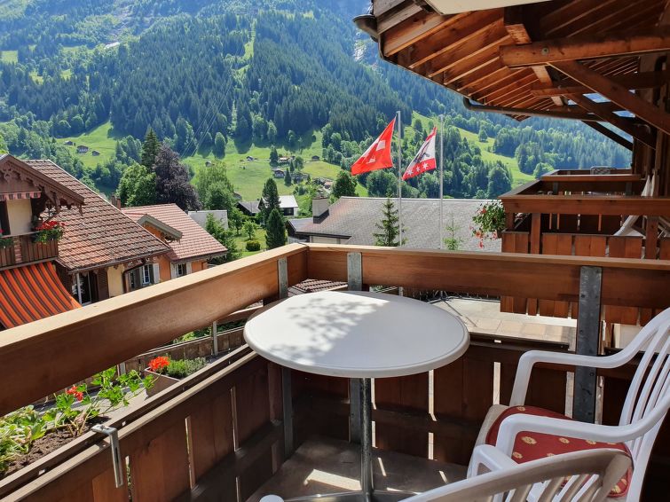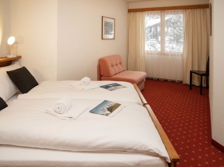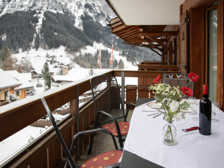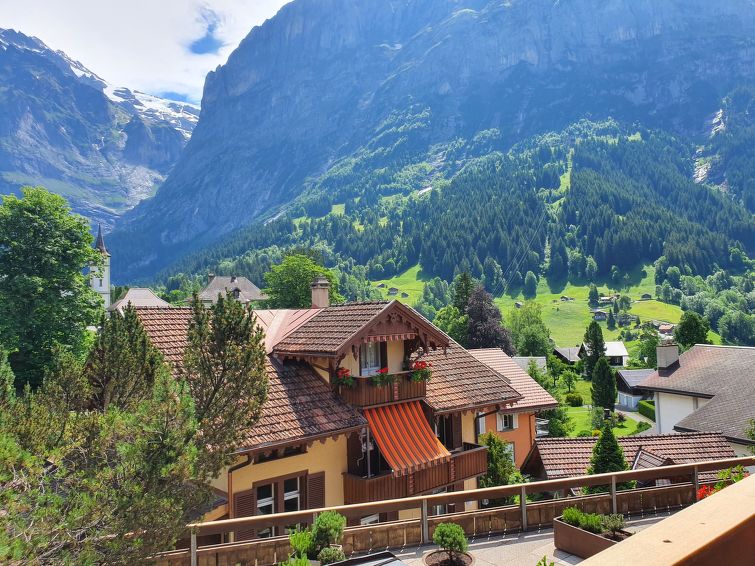 Residence "Chalet Abendrot apARTments". In the centre. In the house: reception, lounge, WiFi, table tennis, billiard table, playroom, lift, storage room for skis, central heating system. Pre-arrival grocery service. In Winter: please take snow chains. Communal covered parking (extra), public parking 200 m extra. Shop 400 m, restaurant 10 m, bus stop "Firstbahn" 80 m, railway station "Grindelwald Dorf" 800 m, outdoor swimming pool 2.5 km, indoor swimming pool 600 m. Golf course (9 hole) 2 km, tennis 1 km, minigolf 400 m, sports centre 600 m, mountain railway 800 m, gondola lift 80 m, ski rental 50 m, ski bus stop 80 m, cross country ski track 1 km, children's playground 600 m. Well-known lakes can easily be reached: Thuner-/Brienzersee 18 km. Please note: The owner does not accept any groups. Ski bus (free of charge). Neighbourhood highly sensitive to noise. Quietness and good behaviour expected. Indian restaurant "Golden India" in the house. The apartment house, built in chalet style, offers a youth room, a children's playroom, a garage (parking space CHF 98.00/week, reservation on arrival). Modern-rustic and cozy apartments, most with a spacious balcony or terrace and a wonderful view of the mountains. Please note: limited number of garage spaces. Pre-reservation not possible. Garage height and width: 12 parking spaces 2.09x2.06 m, 15 parking spaces 1.65x2.06 m. Max. 2000 kg.