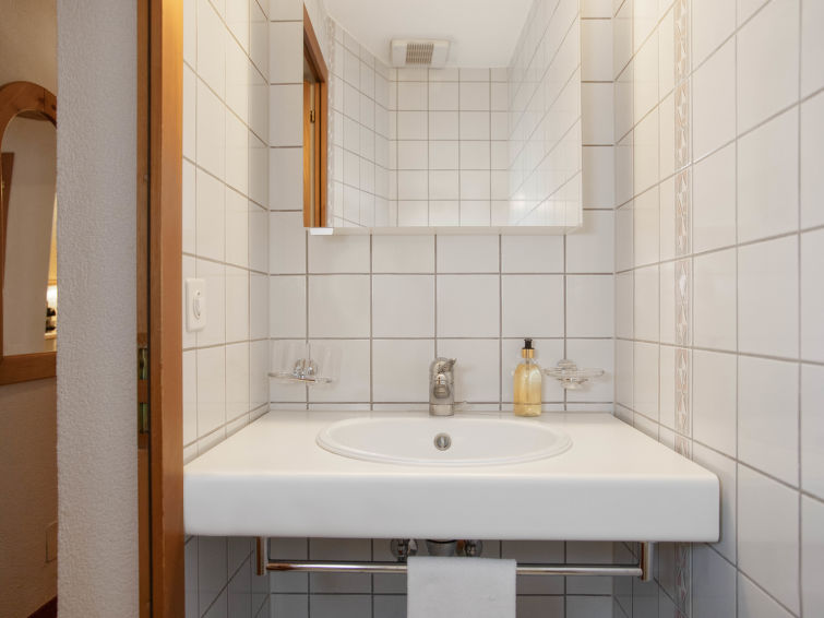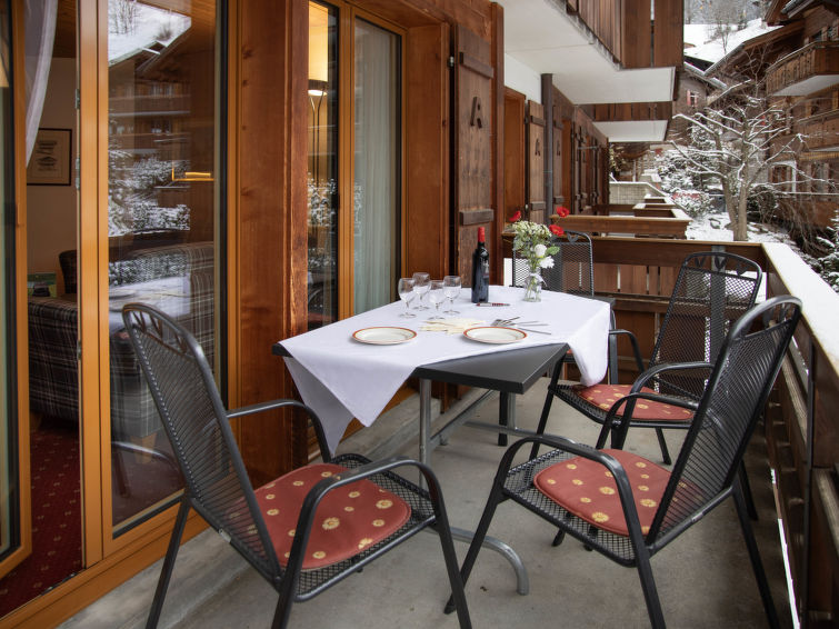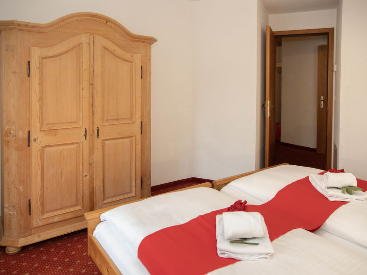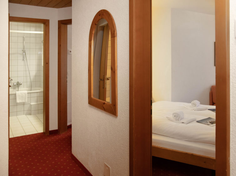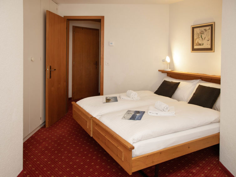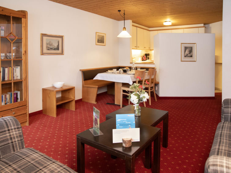 3-room apartment 64 m2 on 3rd floor, east facing position. Living/dining room with cable TV (flat screen). 2 double bedrooms. Open kitchen (oven, dishwasher, 4 ceramic glass hob hotplates, toaster, kettle, electric coffee machine). Bath/WC, sep. WC. 2 balconies, east facing position. Terrace furniture. View of the mountains. Facilities: hair dryer. Internet (WiFi, free). Please note: non-smokers only. Maximum 1 pet/ dog allowed. A fondue set (meat or cheese) and a raclette oven can be borrowed from reception.
