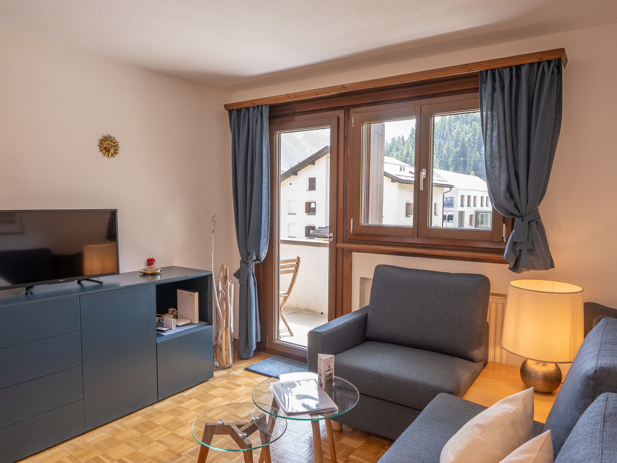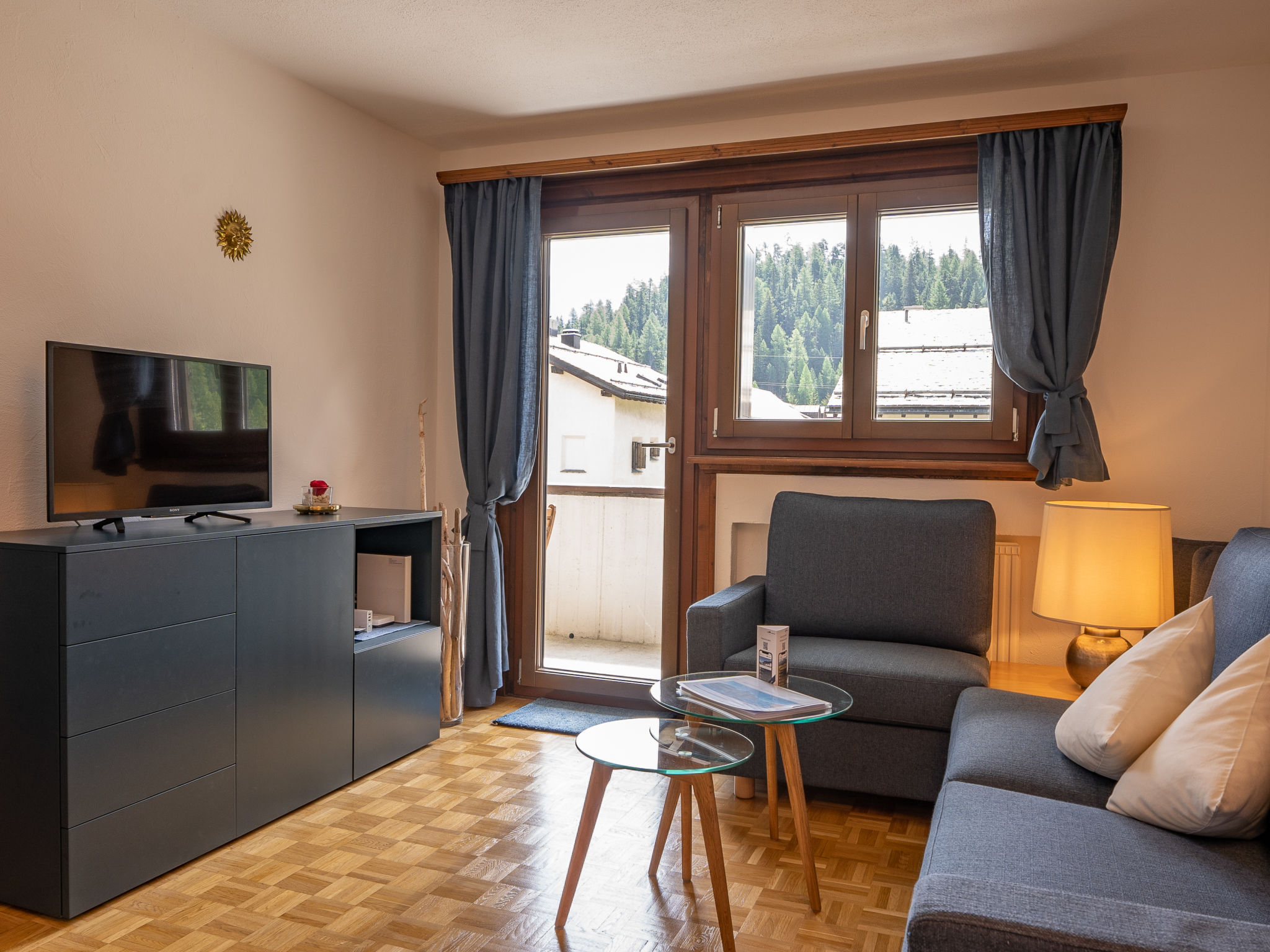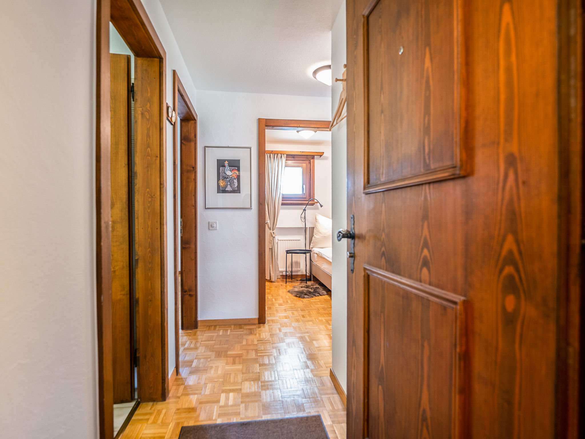"Chesa Palüdin 8 - Celerina", 3-room apartment 50 m2 on 2nd floor. Beautiful and cosy furnishings: open living/dining room with TV (flat screen). Exit to the balcony. 1 double bedroom with 1 french bed (1 x 160 cm, length 195 cm). 1 room with 1 bed (90 cm, length 195 cm). Small kitchen (4 hot plates, oven, dishwasher, toaster, kettle, electric coffee machine, Capsules for coffee machine (Nespresso) extra, raclette grill, fondue Set (chinoise, cheese)). Bath/bidet/WC. Heating. Parquet floors. Small balcony 9 m2. Balcony furniture. Very beautiful view of the mountains and the countryside. Facilities: iron, hair dryer. Internet (WiFi, free). Garage space n 8 (1 car), height 195 cm, width 230 cm. E-charging station. Please note: non-smokers only, non-smoking house. Maximum 1 pet/ dog allowed. No lift.