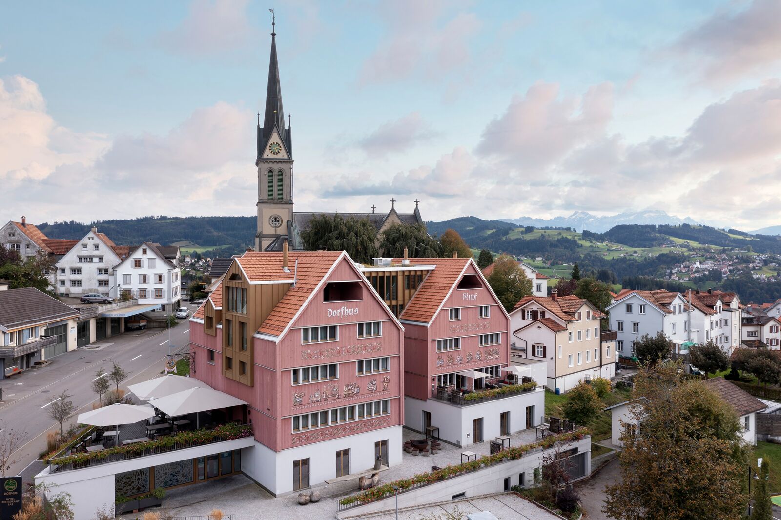Dorfhus Gupf is the latest project from visionary restaurateur Emil "Migg" Eberle. In 2020 - despite the pandemic - he opened another gem in the same village with the Dorfhus Gupf hotel and restaurant, which he created together with his wife Sila Zinsli. The regionally influenced interior design is visually inspired by the iconic rose hip. The trendy concept is aimed at the young and young at heart who enjoy good food such as grilled specialties, exceptional wines and a sophisticated ambience. Dorfhus Gupf has 16 beautiful rooms and four suites. The Event-Stickerstube and the two seminar rooms, all with ornate ceilings, are also unique. The restaurant is complemented by the Magnothek with over 420 wines from magnum bottles and the bar/fumoir "Miggs Ofastuba".