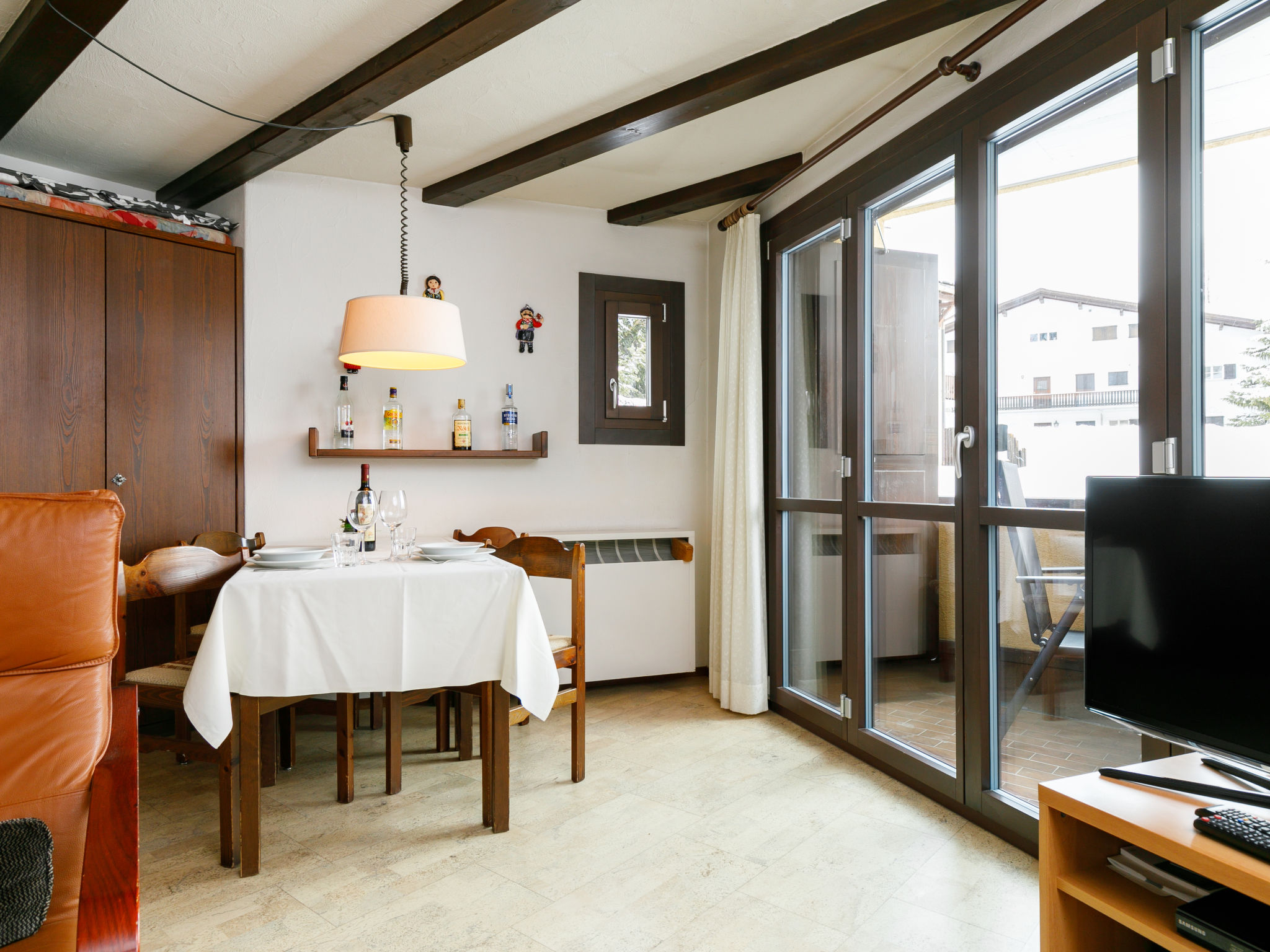 "Residenza Chesa Margun 34-7", 1-room apartment 38 m2 on 1st floor. Practical and cosy furnishings: living/dining room with 2 beds, dining table and satellite TV (flat screen), radio and electric heating. Exit to the balcony. Open kitchen in the entrance (4 hot plates, oven, dishwasher, electric coffee machine). Shower/WC. Balcony, south facing position. View of the mountains and the resort. Facilities: Internet (WiFi). Please note: non-smokers only.