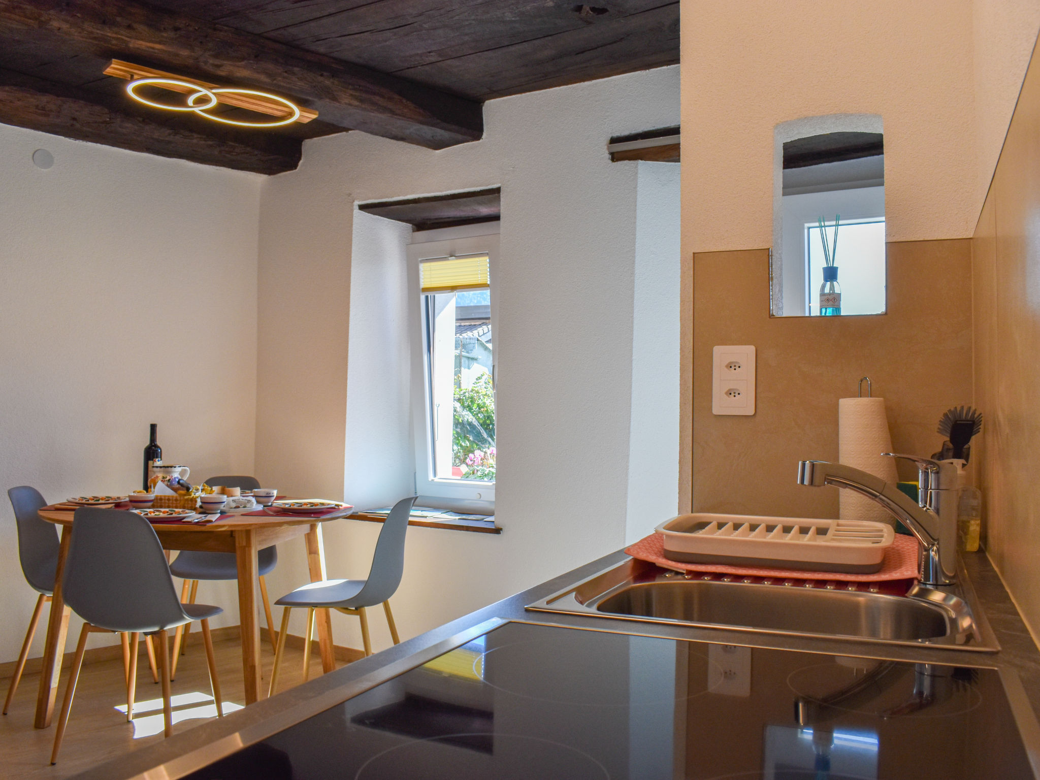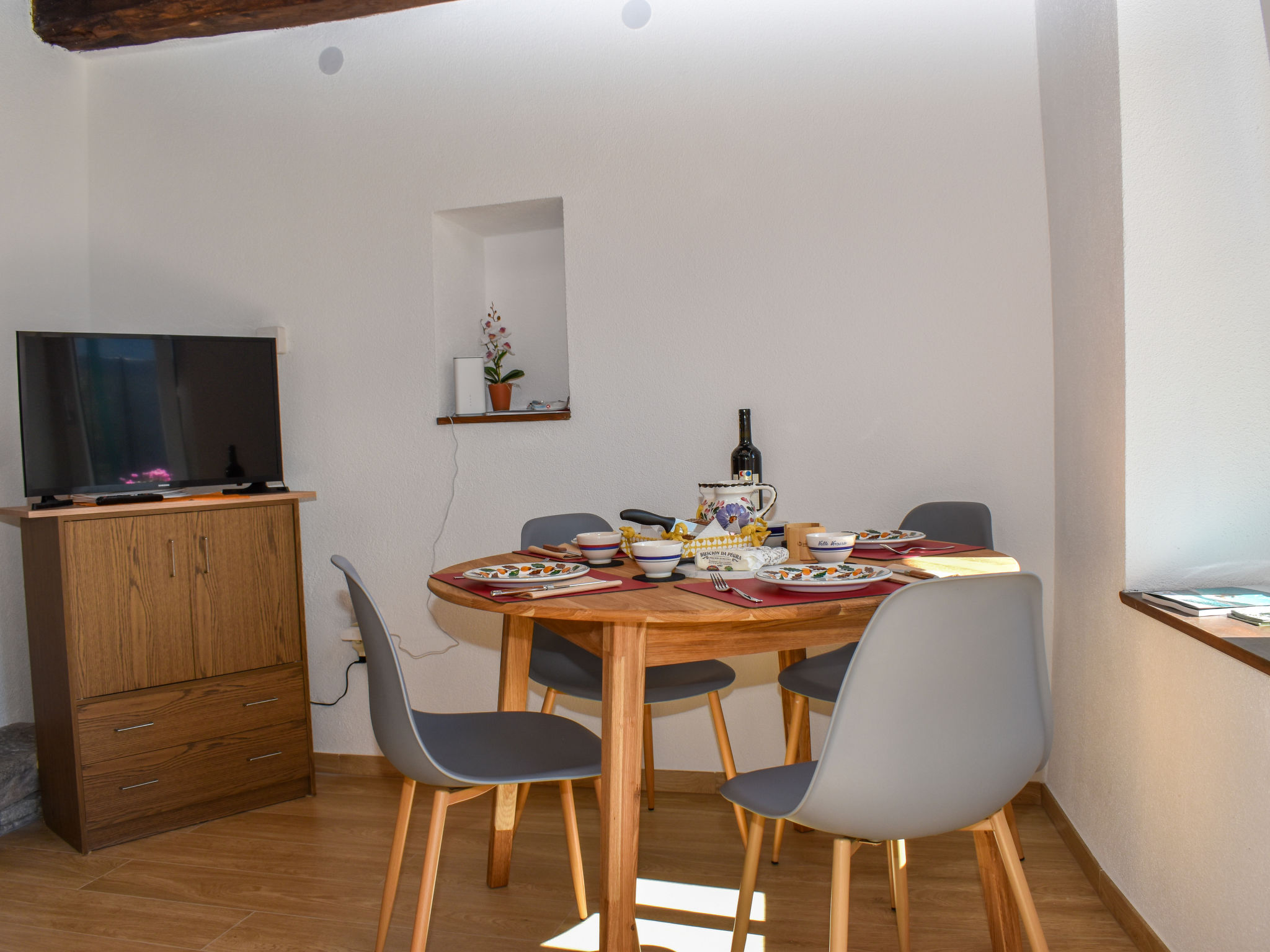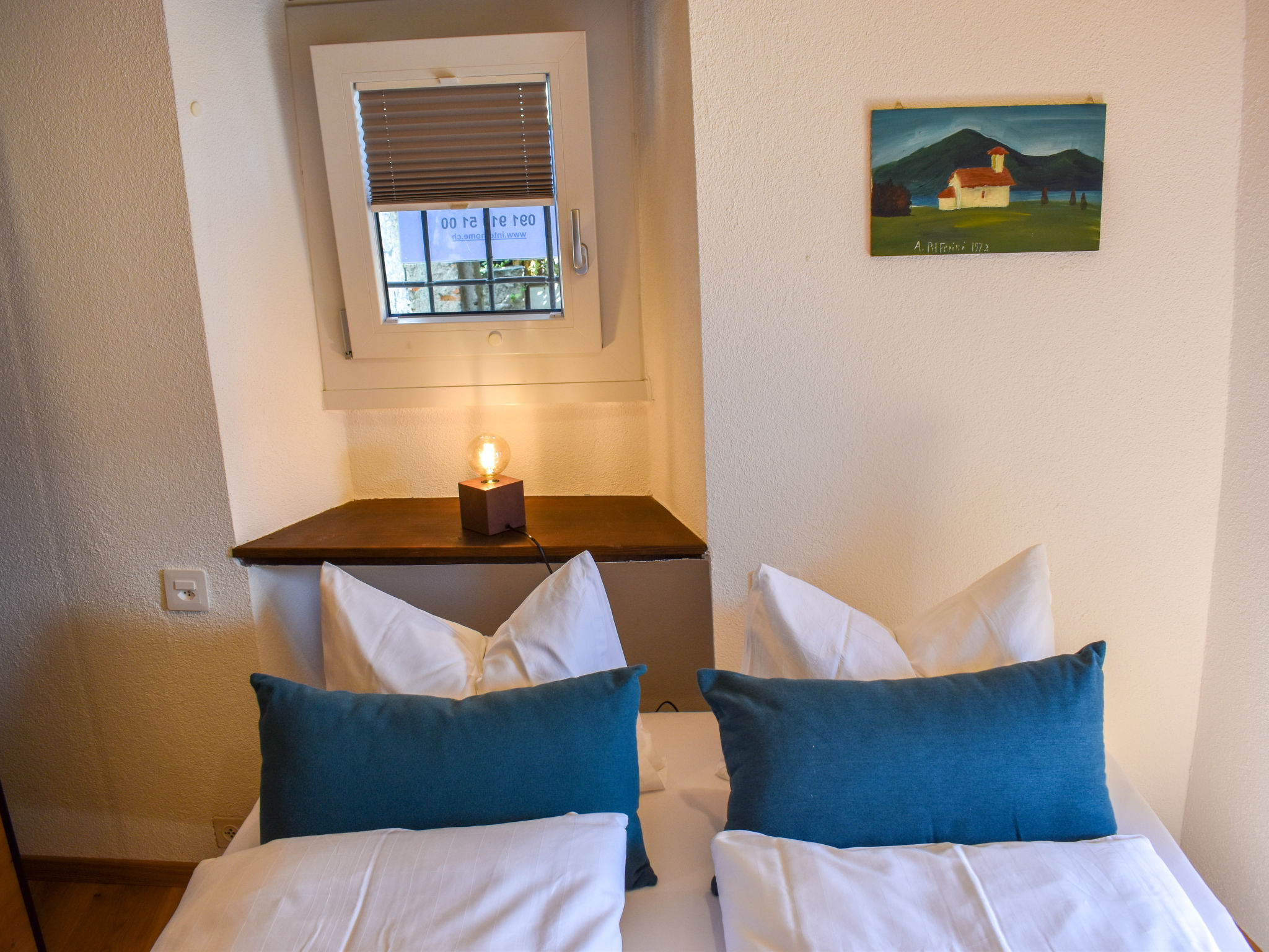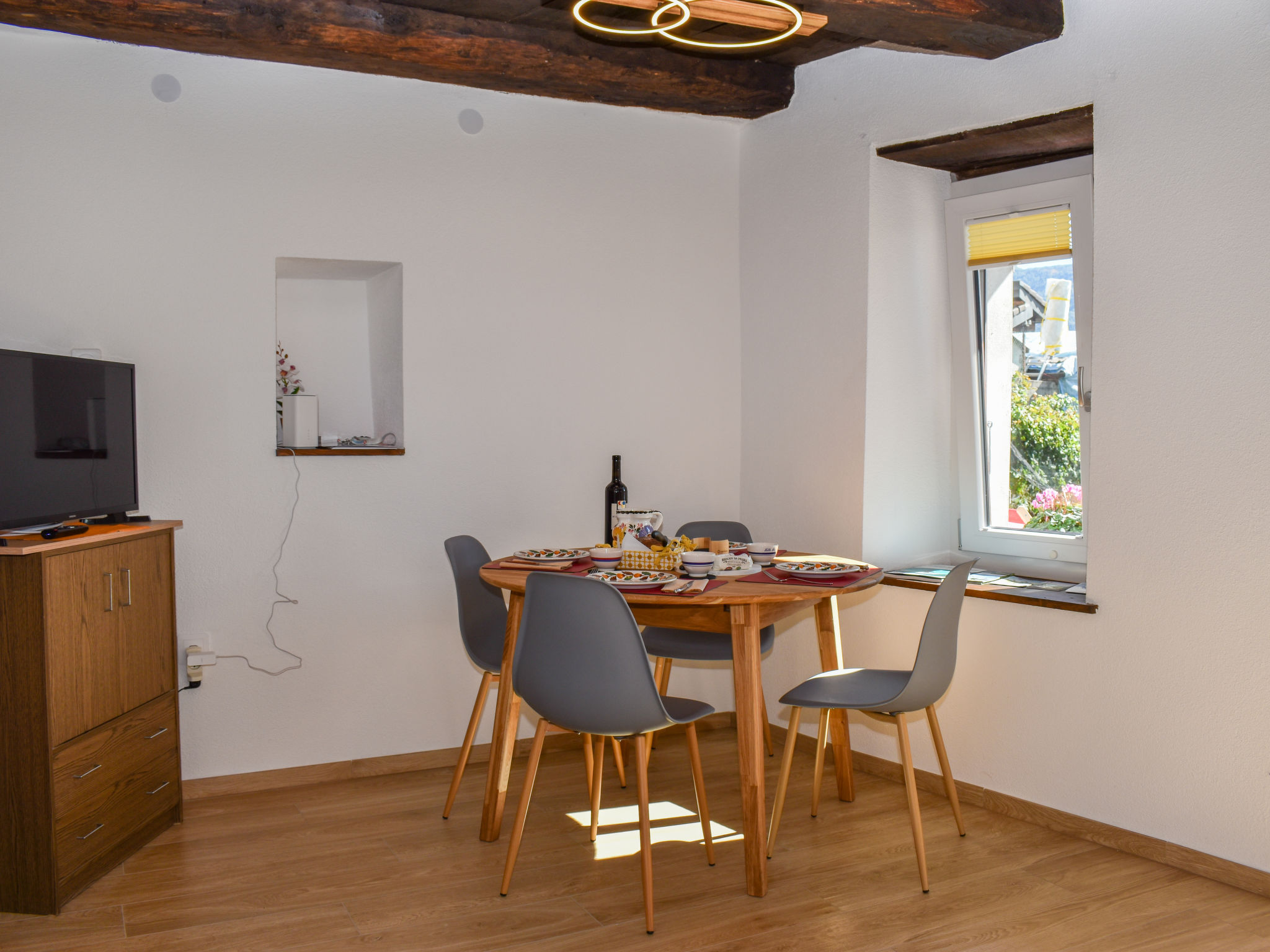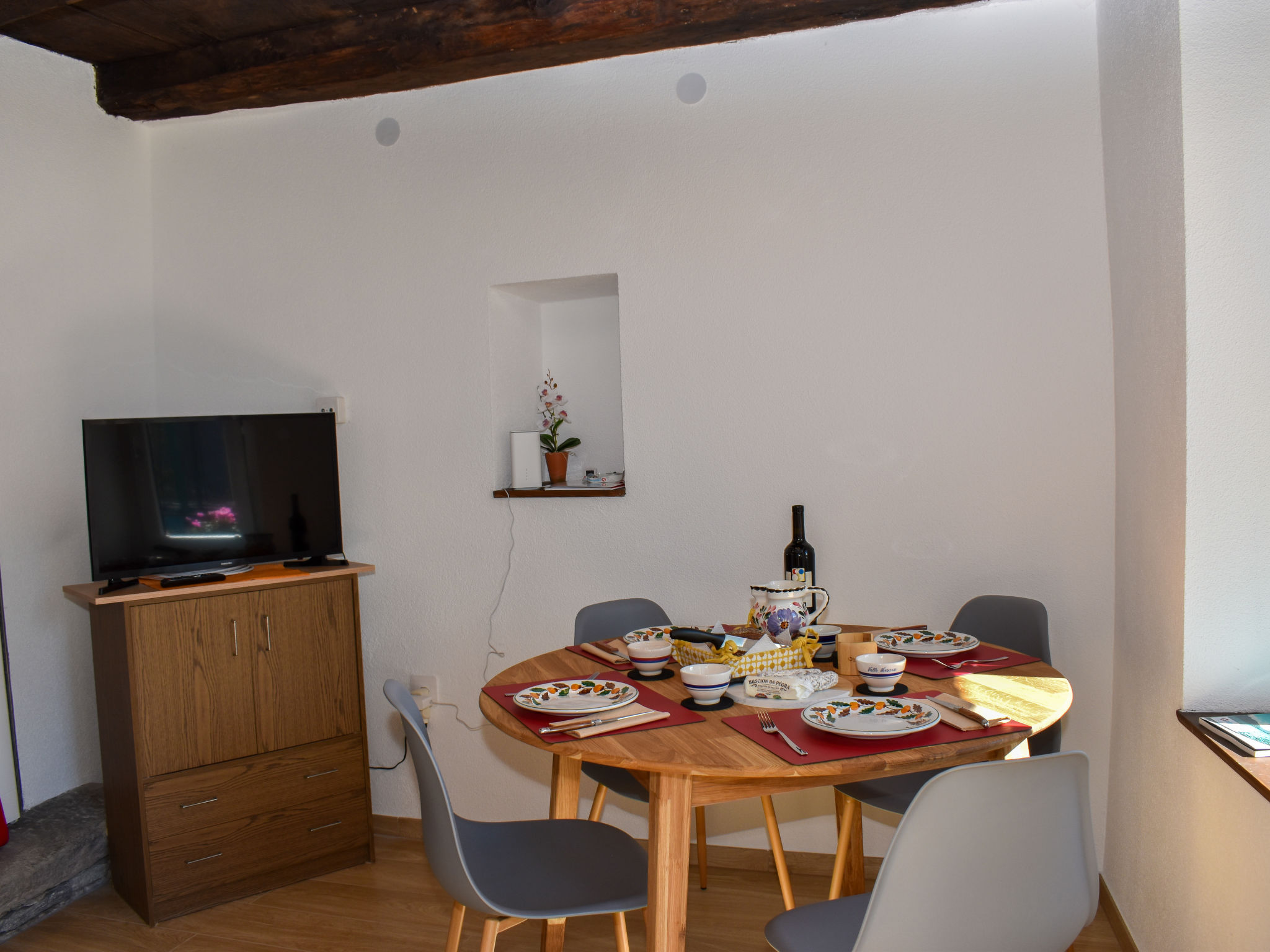 "Bertino 1892", 2-room house 30 m2 on 2 levels. Fully renovated in 2022, comfortable and modern furnishings: small kitchen-/living room (oven, 4 ceramic glass hob hotplates, toaster, kettle, electric coffee machine, Capsules for coffee machine (Dolce Gusto) extra, raclette grill) with dining table, satellite TV, flat screen, electric heating and wood-burning stove. Exit to the patio. Upper floor: 1 small double bedroom with 1 double bed (1 x 160 cm, length 200 cm). Exit to the balcony. Shower/WC. Electric heating. Patio partly roofed. Balcony furniture, barbecue. Very beautiful distant view of the lake, the mountains, the valley and the resort. Facilities: hair dryer. Internet (WiFi, free). Please note: non-smokers only. Maximum 1 pet/ dog allowed. NL-00003335