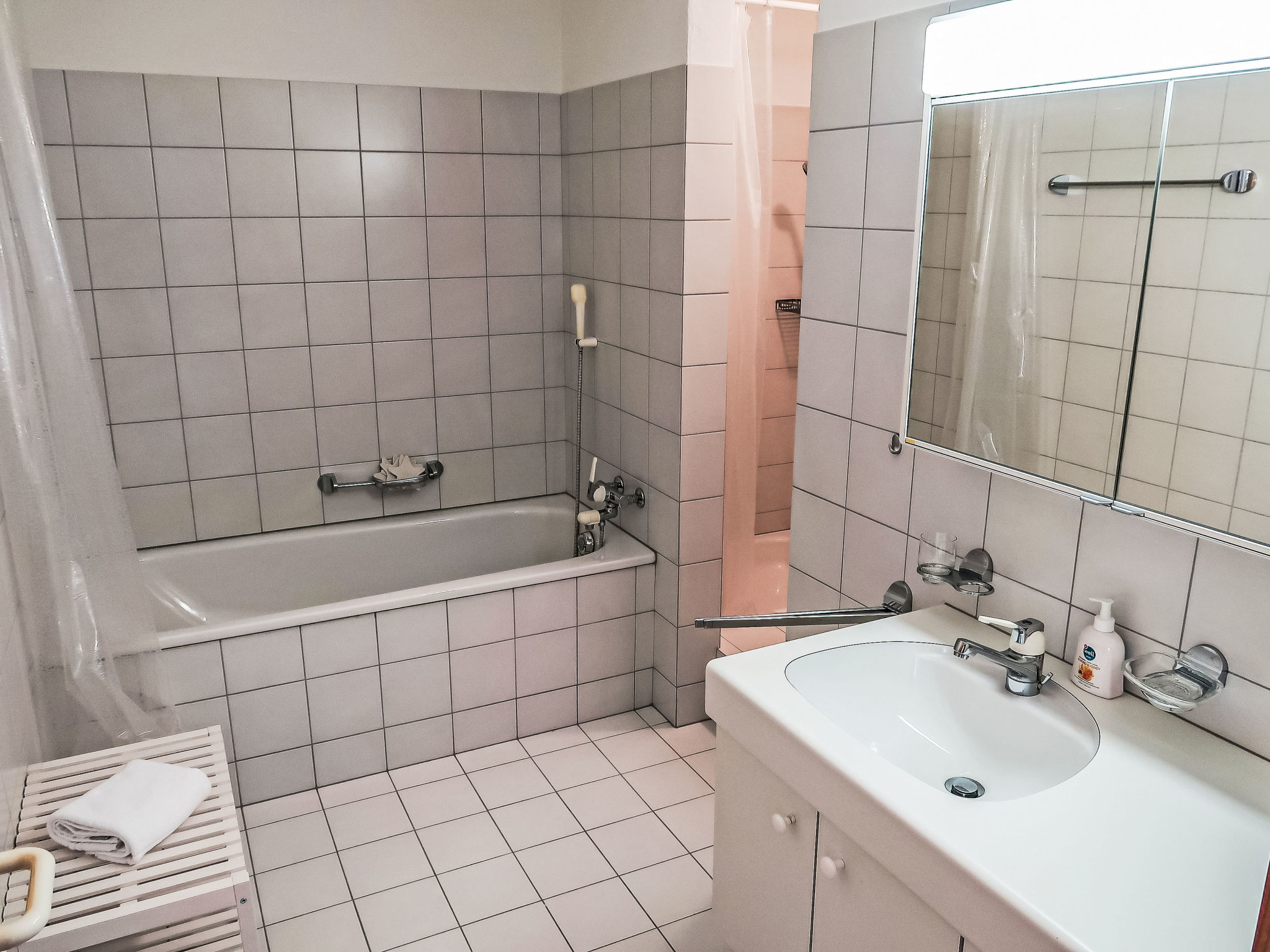 "Apt D 031", 2-room apartment 82 m2 on 3rd floor. Comfortable and cosy furnishings: living/dining room with 1 double sofabed and satellite TV (flat screen), radio and hi-fi system. Exit to the balcony. 1 room with 1 double bed. Open kitchen (oven, dishwasher, 4 ceramic glass hob hotplates) with dining table. Bath/shower, sep. WC. Balcony 8 m2, south facing position. Balcony furniture. Beautiful view of the mountains, the valley and the countryside. Facilities: children's high chair, baby cot. Internet (WiFi, free). Garage at the house, height 195 cm. Please note: non-smokers only.