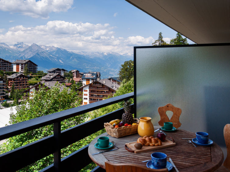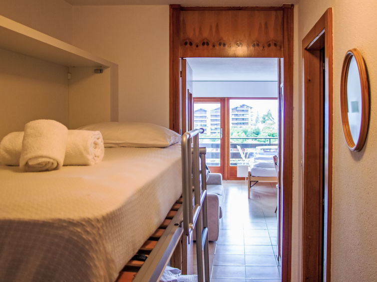 "Christiania 2 O1", 1-room apartment 38 m2 on 1st floor. Entrance hall with 1 x 2 bunk beds (80 cm, length 180 cm). Living/dining room with 1 pull-out bed (2 pers. 2 x 90 cm, length 200 cm), cable TV (flat screen). Kitchenette (3 hot plates, oven, kettle, microwave, electric coffee machine, raclette grill, fondue Set (cheese)). Bath/WC. Balcony, north facing position and west facing position. Beautiful view of the mountains and the valley. Facilities: hair dryer. Internet (WiFi, free). Please note: non-smokers only, no parking. 1 small pet/ dog allowed. Instead of an enclosed bedroom, some sleeping areas are located in an open-plan area (gallery, alcove, etc.).