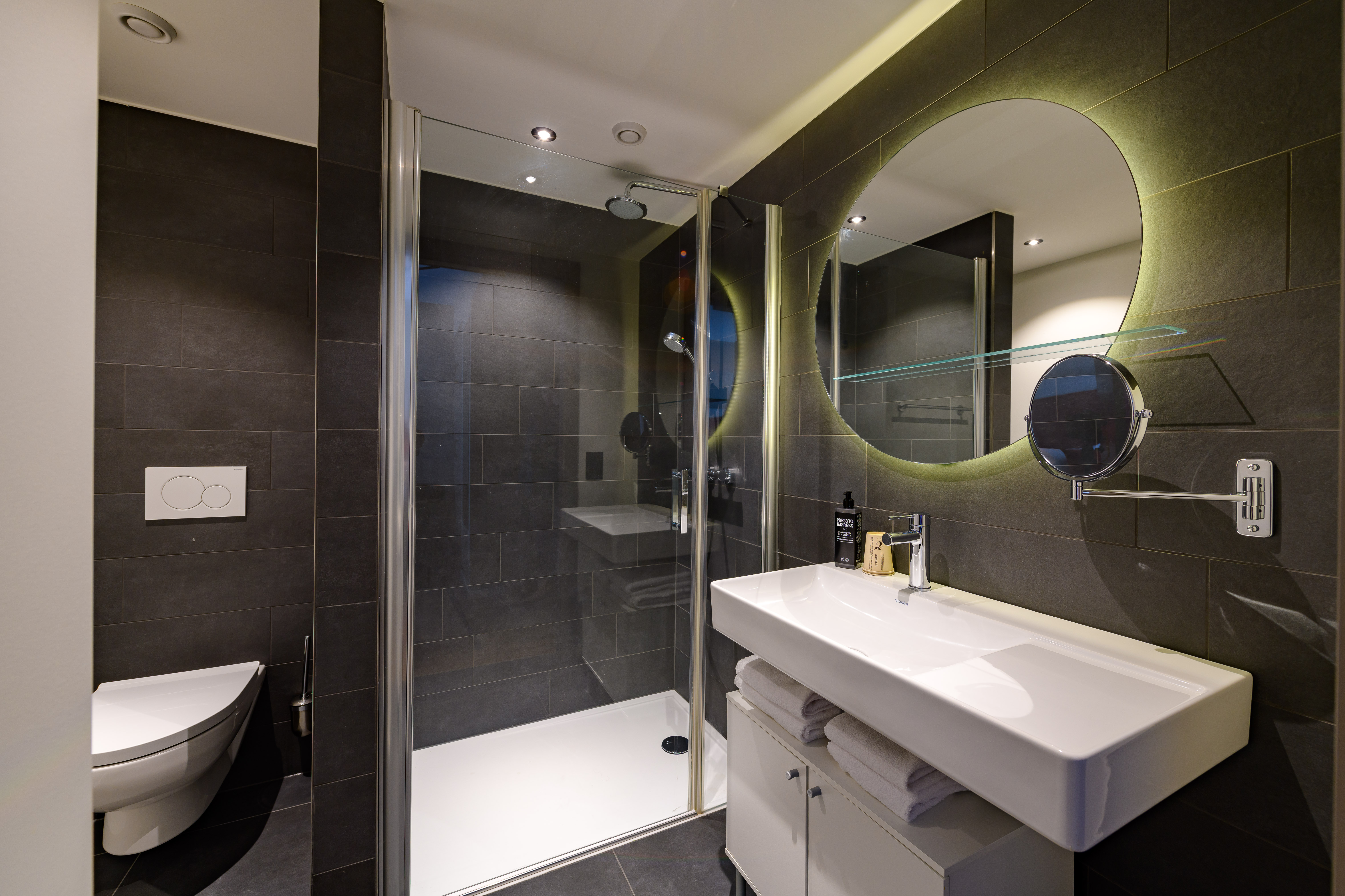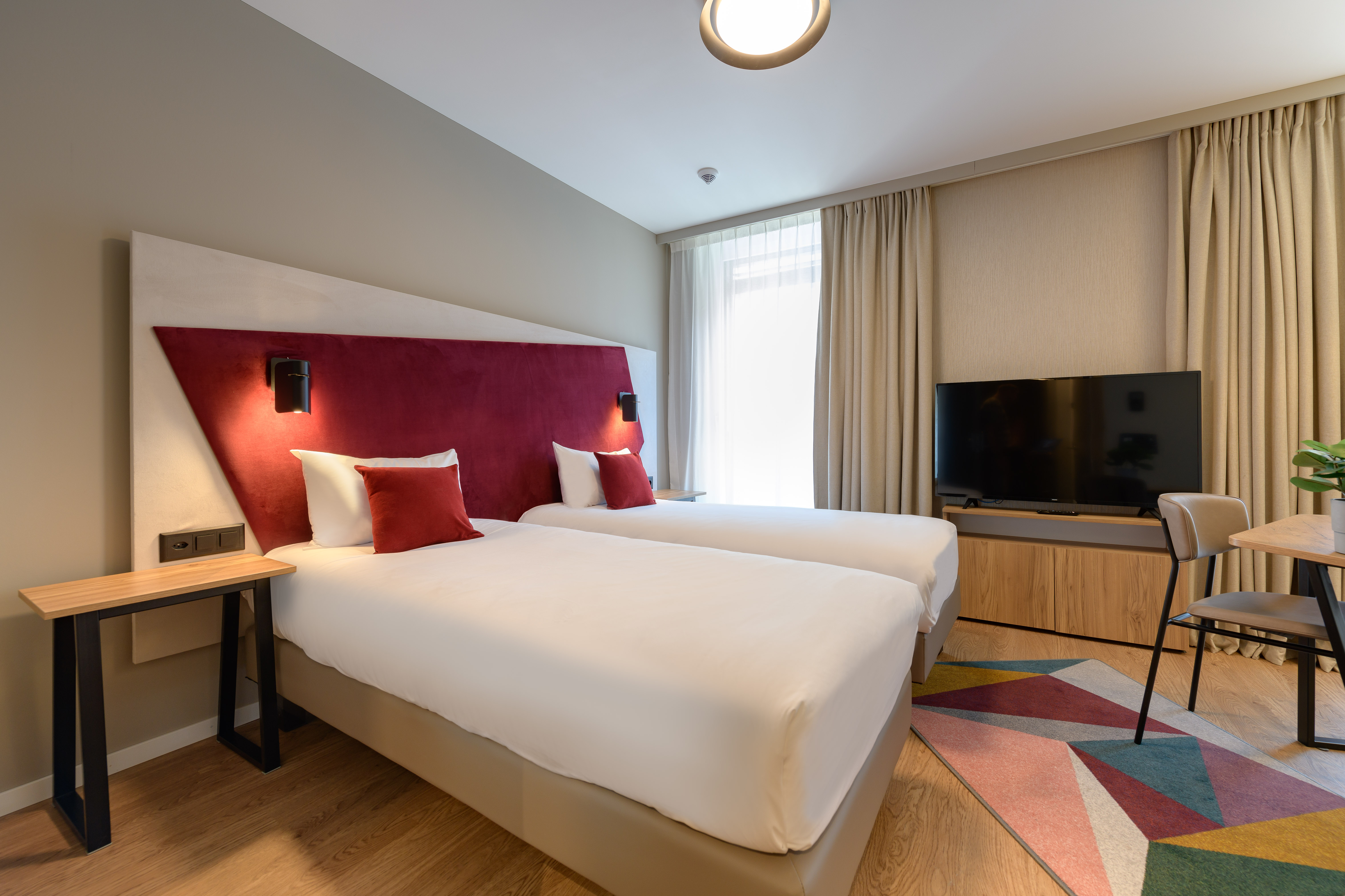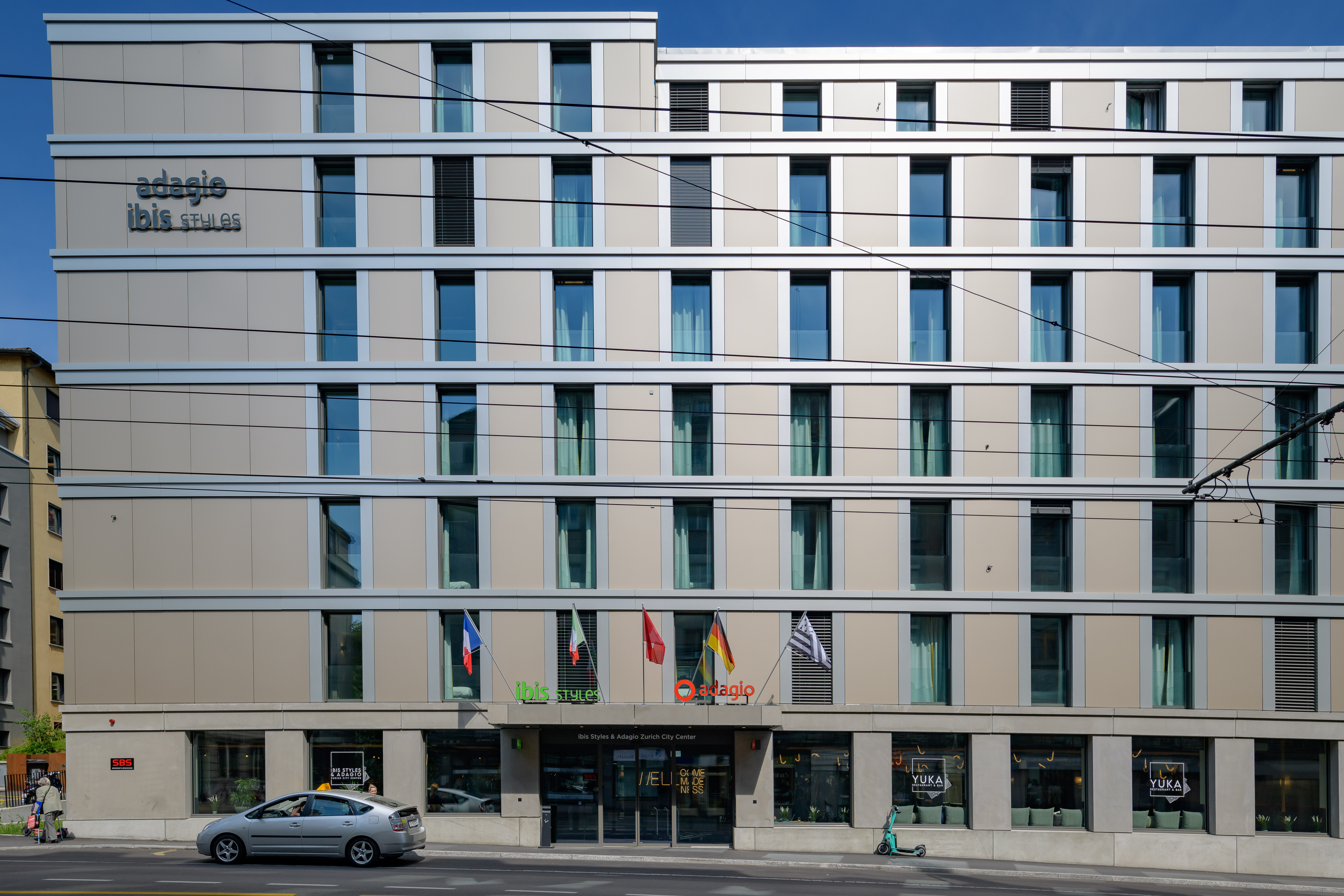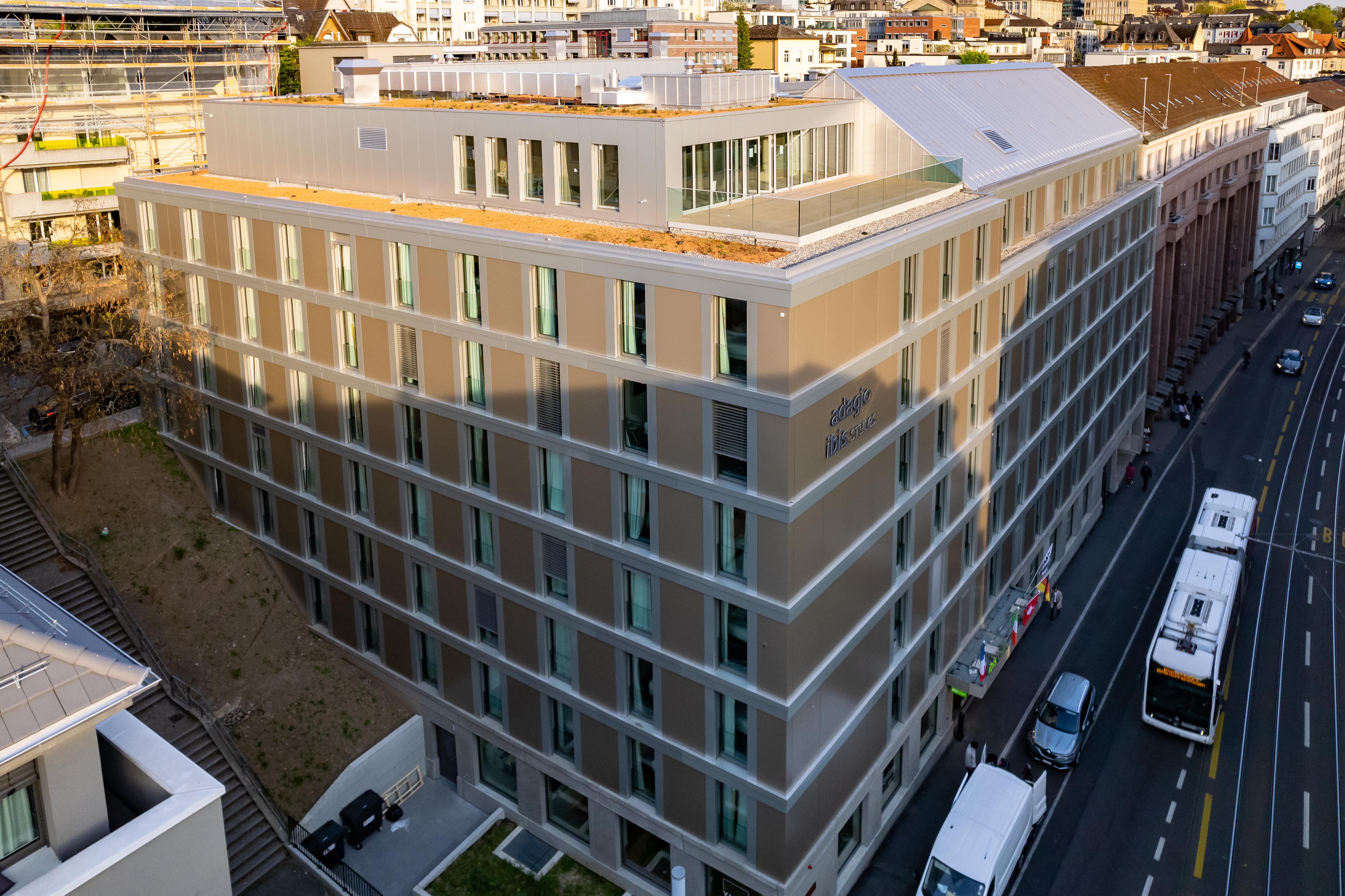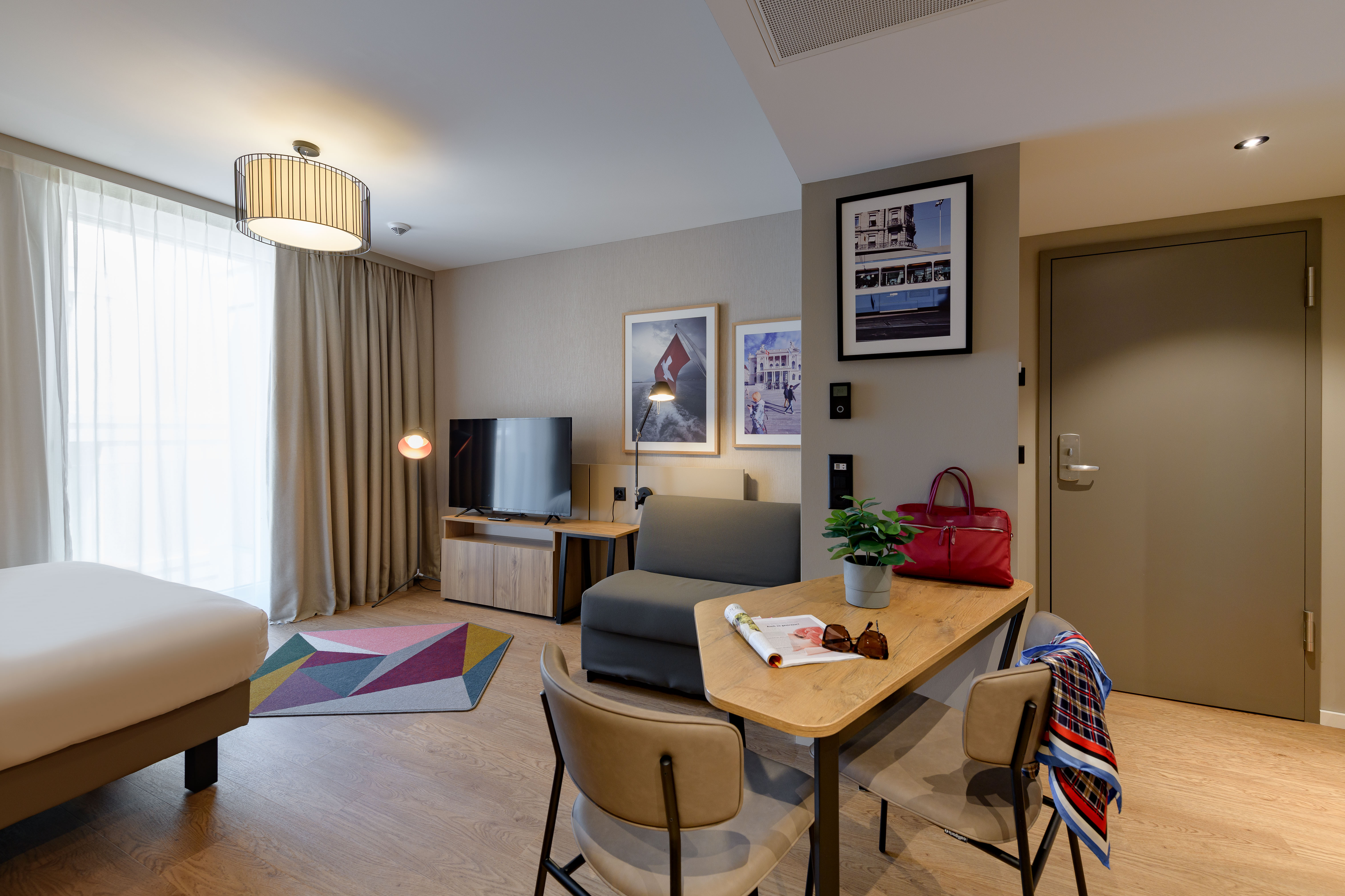 The Aparthotel in the heart of Zurich is characterized by ultramodern amenities, top-level comfort, and a prime location. It comprises 64 apartments of various sizes, ranging from studios for two people to twin studios and two-room apartments for four people. Each apartment has a separate bedroom, a kitchen, a work area, and a living room with a sofa bed.