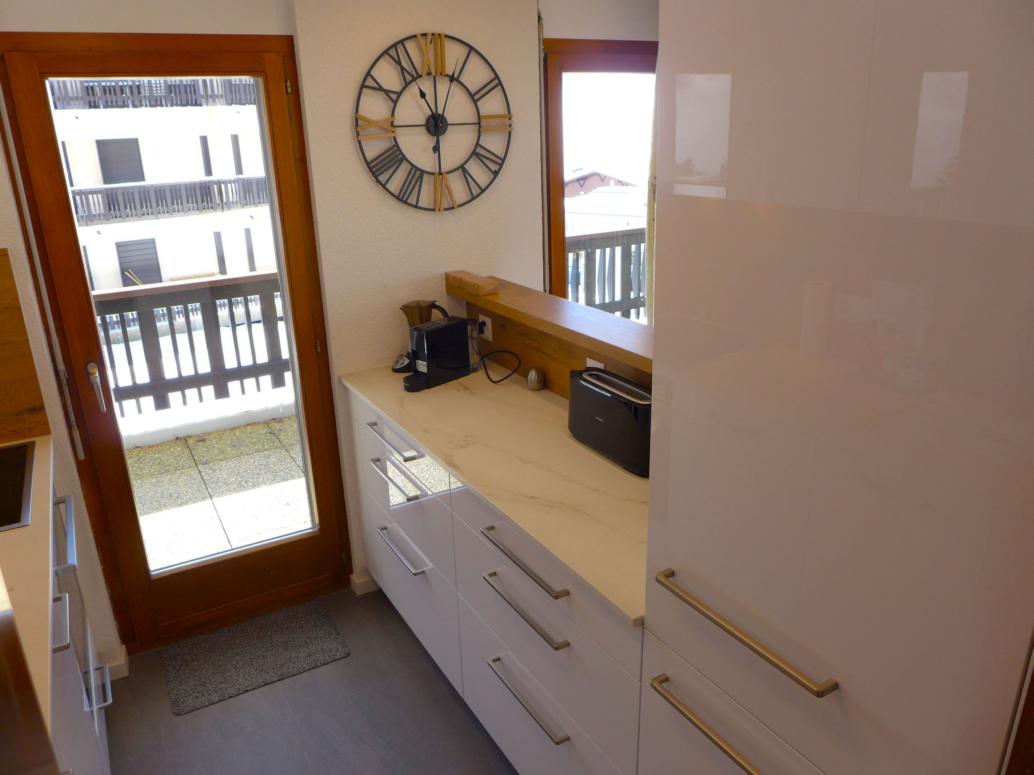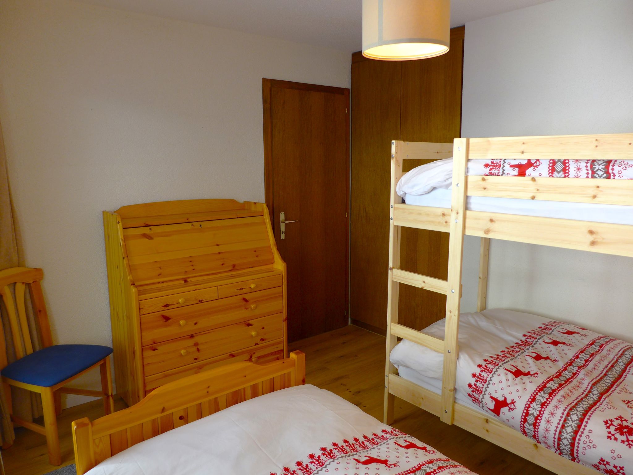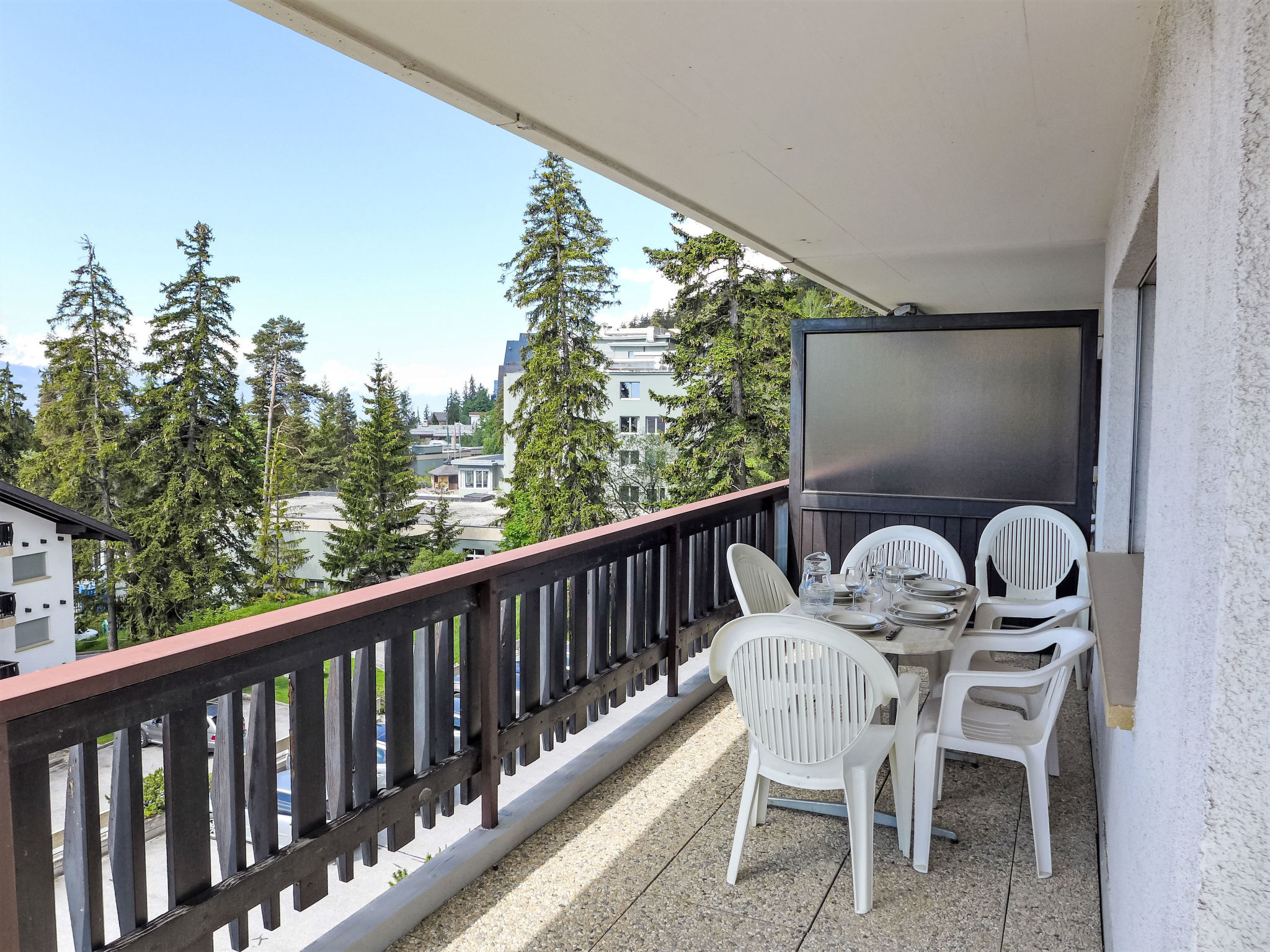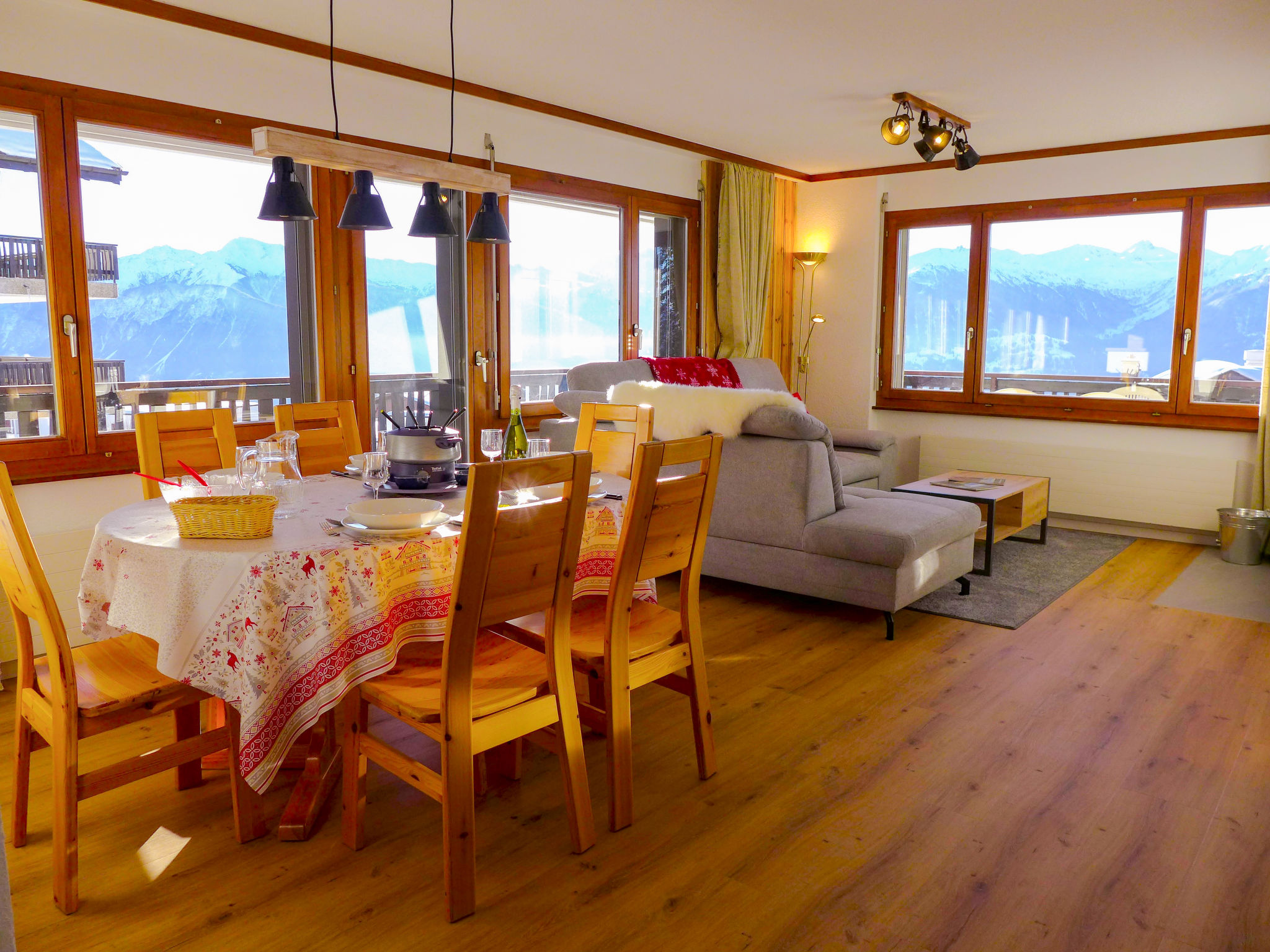 "Mandarin B 19", 3-room apartment 80 m2 on 2nd floor. Bright, fully renovated in 2023, comfortable and tasteful furnishings: living/dining room with open-hearth fireplace, shower/WC, cable TV and flat screen. Exit to the balcony, south facing position and east facing position. 1 room with 1 french bed (160 cm, length 200 cm) with bath/WC. 1 room with 1 bed (90 cm, length 200 cm), 1 x 2 bunk beds (90 cm, length 200 cm). Exit to the balcony, north facing position. Open kitchen (oven, dishwasher, 4 ceramic glass hob hotplates, toaster, kettle, microwave, freezer, electric coffee machine, Capsules for coffee machine (NESPRESSO) extra, raclette grill, fondue Set (chinoise, cheese)). Large balcony 30 m2, south facing position and, east facing position. Balcony furniture. Very beautiful view of the mountains and the countryside. Facilities: children's high chair, baby cot for up to 2 year olds, hair dryer. Internet (WiFi, free). Garage space n 10 (1 car), height 189 cm, width 235 cm. Please note: non-smokers only. Smoke alarm. Foldable baby cot without bedlinen and without covers.