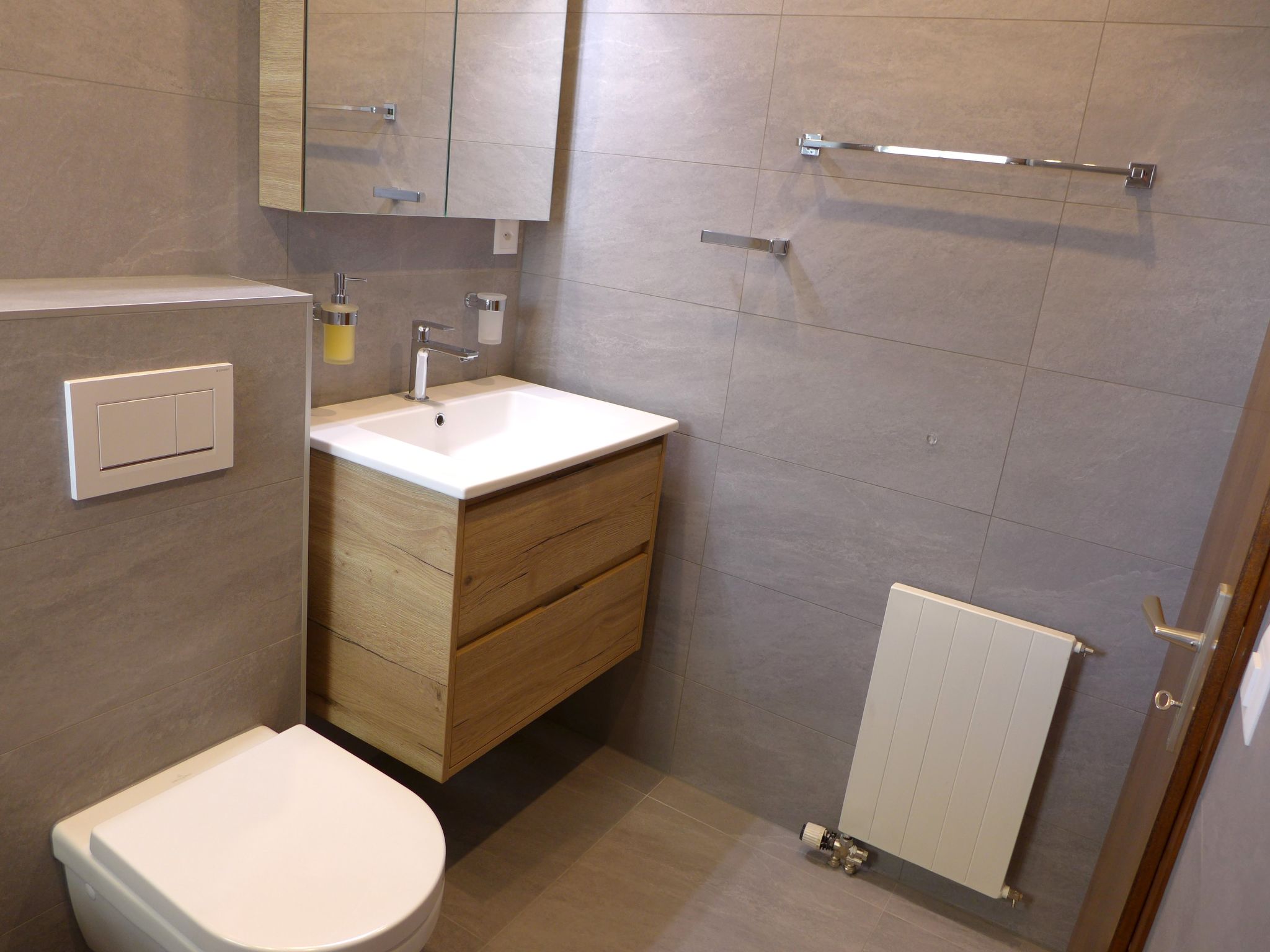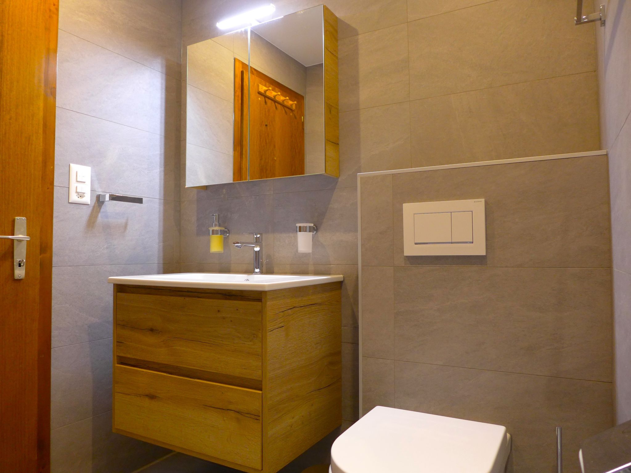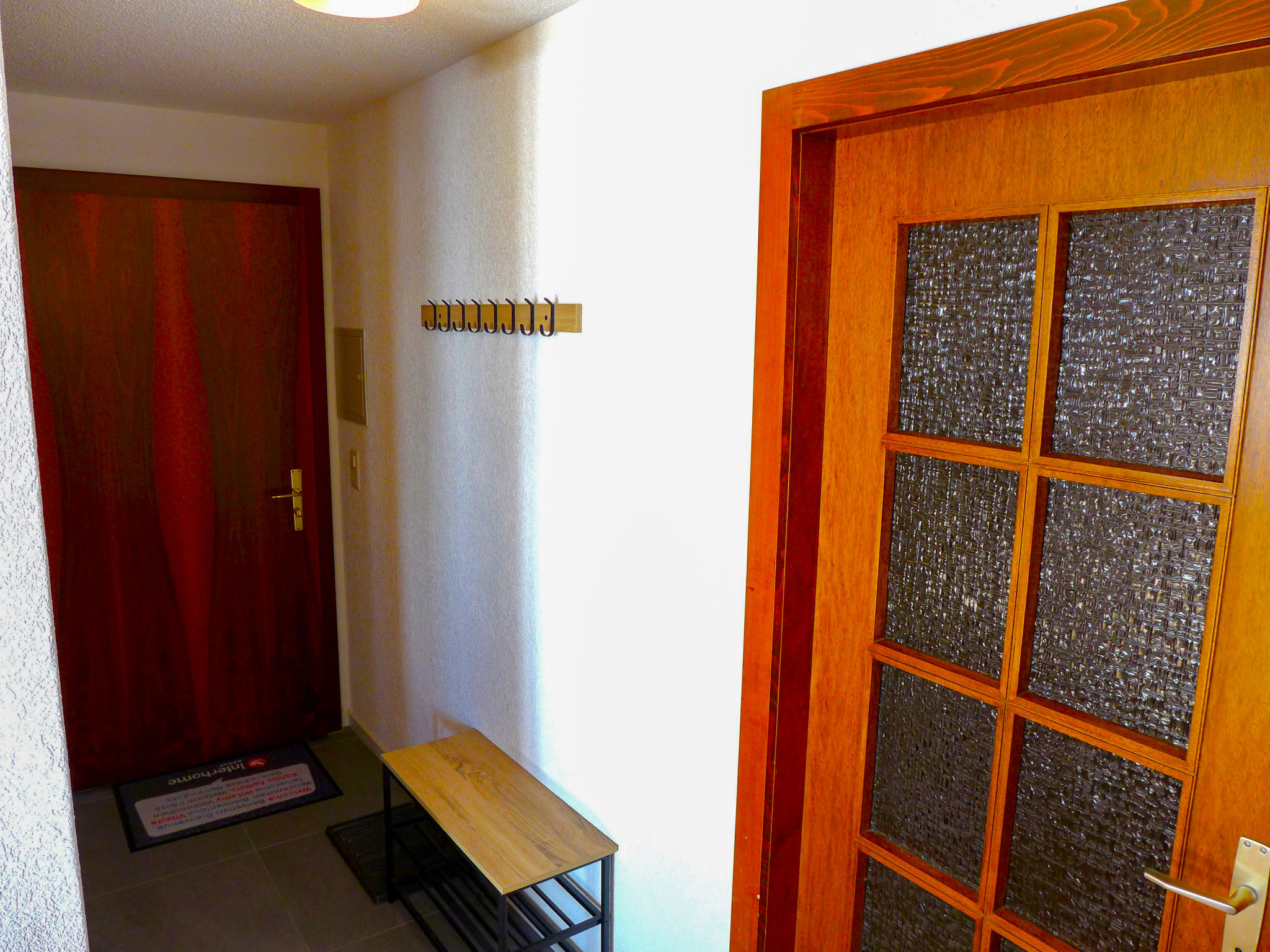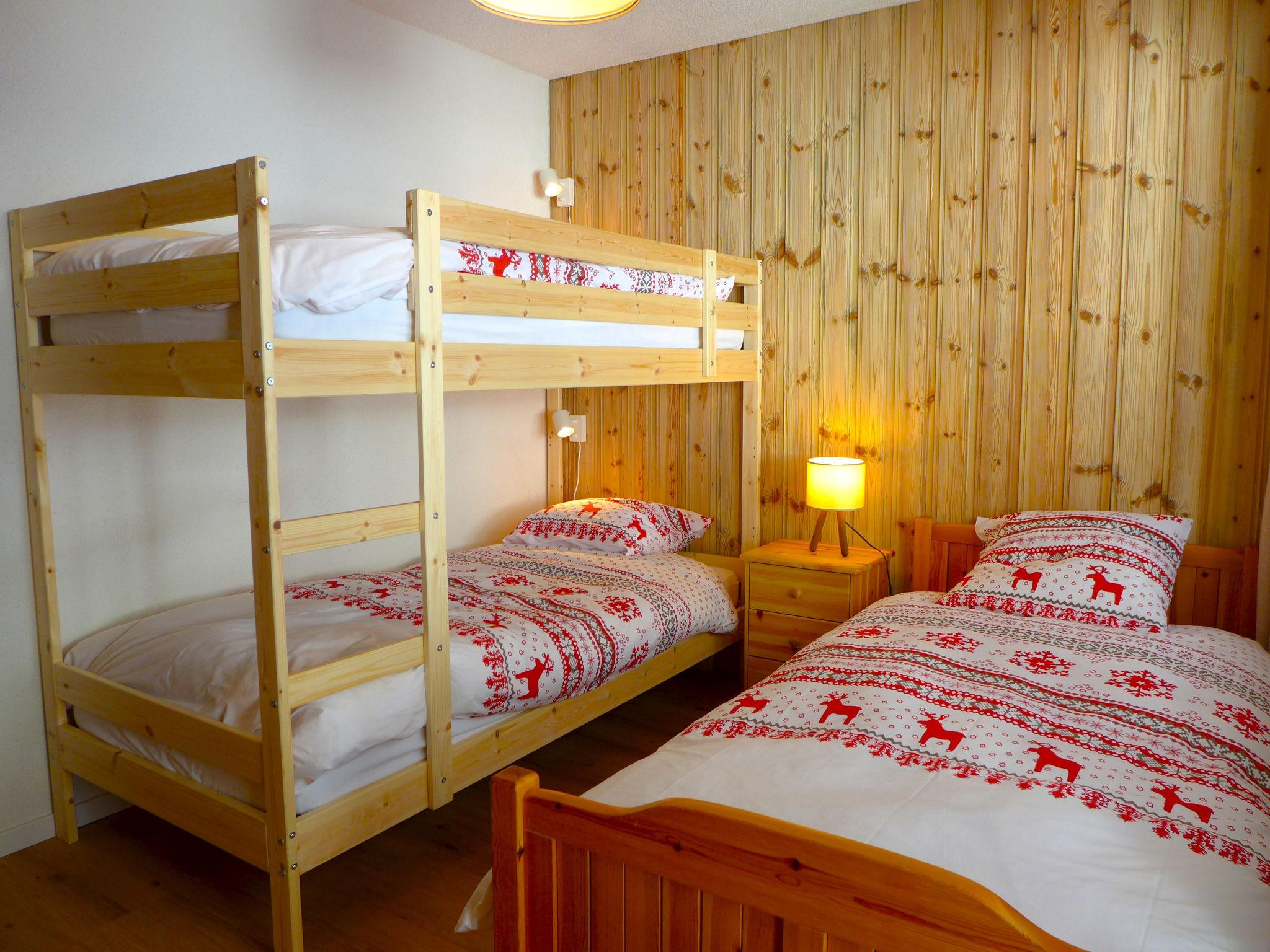 "Mandarin B 19", 3-room apartment 80 m2 on 2nd floor. Bright, fully renovated in 2023, comfortable and tasteful furnishings: living/dining room with open-hearth fireplace, shower/WC, cable TV and flat screen. Exit to the balcony, south facing position and east facing position. 1 room with 1 french bed (160 cm, length 200 cm) with bath/WC. 1 room with 1 bed (90 cm, length 200 cm), 1 x 2 bunk beds (90 cm, length 200 cm). Exit to the balcony, north facing position. Open kitchen (oven, dishwasher, 4 ceramic glass hob hotplates, toaster, kettle, microwave, freezer, electric coffee machine, Capsules for coffee machine (NESPRESSO) extra, raclette grill, fondue Set (chinoise, cheese)). Large balcony 30 m2, south facing position and, east facing position. Balcony furniture. Very beautiful view of the mountains and the countryside. Facilities: children's high chair, baby cot for up to 2 year olds, hair dryer. Internet (WiFi, free). Garage space n 10 (1 car), height 189 cm, width 235 cm. Please note: non-smokers only. Smoke alarm. Foldable baby cot without bedlinen and without covers.