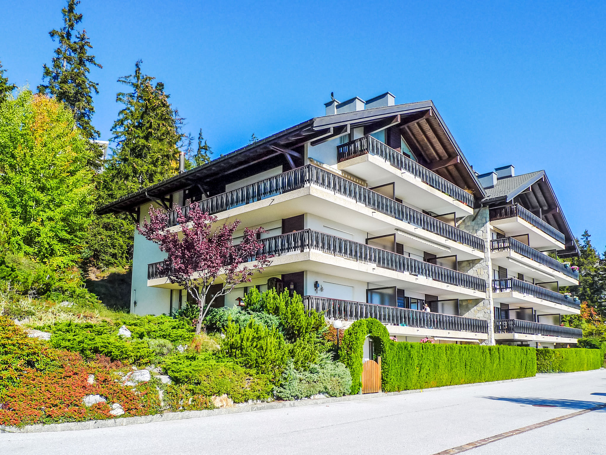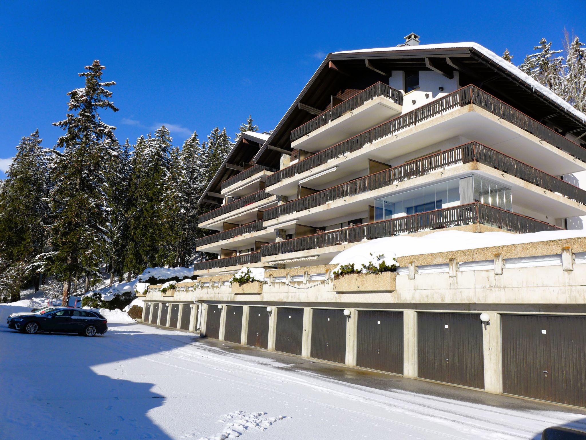 Cosy residence "Mandarin", 4 storeys. In the district of Les Arolles 300 m from the centre of Montana, in a quiet, sunny position, 650 m from the lake, 850 m from the skiing area, south facing position. In the complex: lift, storage room for skis, central heating system, washing machine, tumble dryer (for shared use, extra), drying room. Parking (limited number of spaces). Shop, supermarket, restaurant, bakery 350 m, 4 minute walk to the centre, bus stop "Ycoor" 350 m, railway station "Funiculaire Montana Gare" 1.1 km, bathing lake "Moubra" 1.9 km, lake Grenon 650 m. Golf course (18 hole) 2 km, tennis 1.8 km, indoor tennis centre 1.8 km, riding stable 1.4 km, skisport facilities 450 m, ski bus stop, ski school, ice rink 400 m. Nearby attractions: Casino 400 m. Please note: ski bus (free of charge).