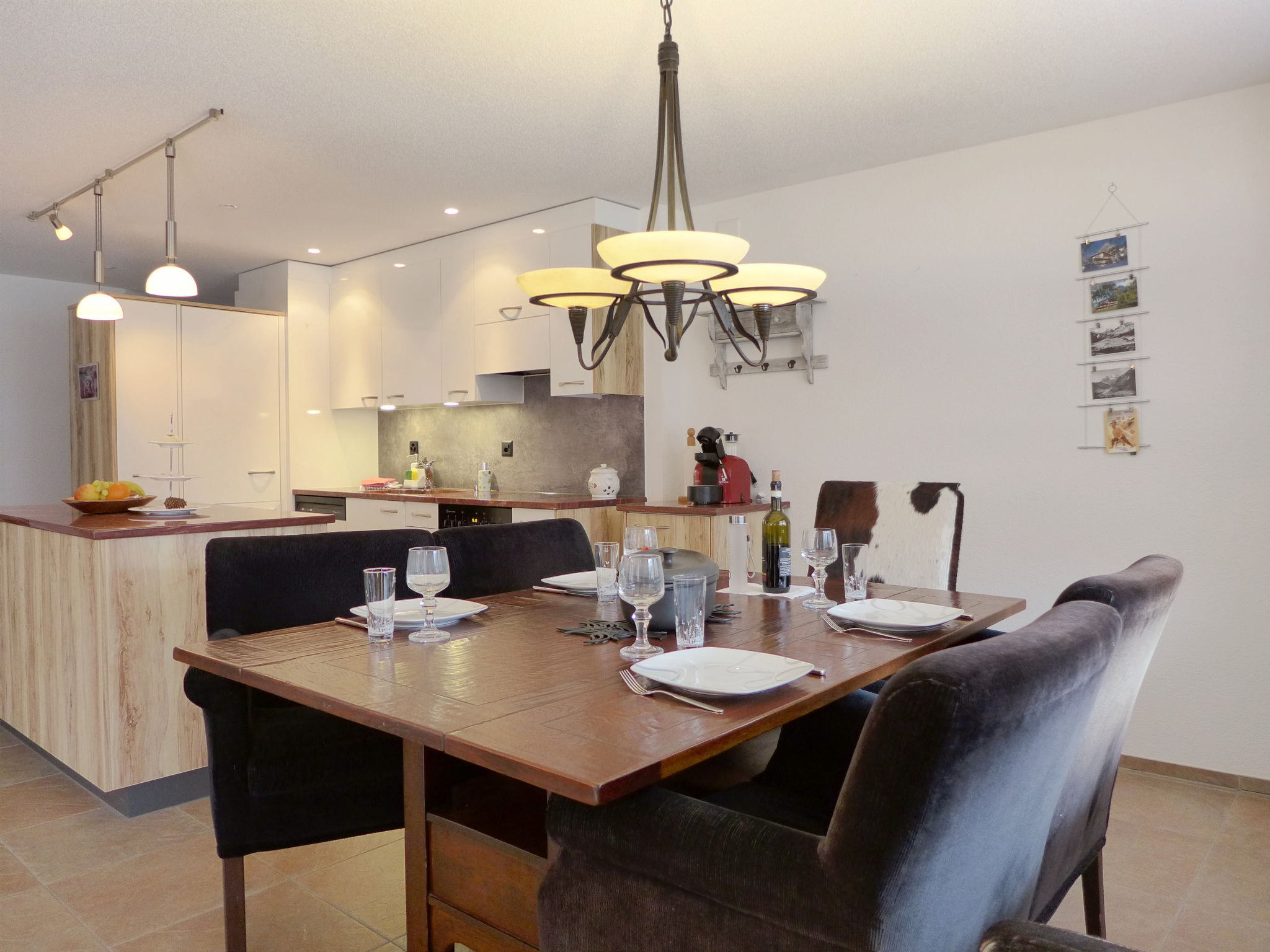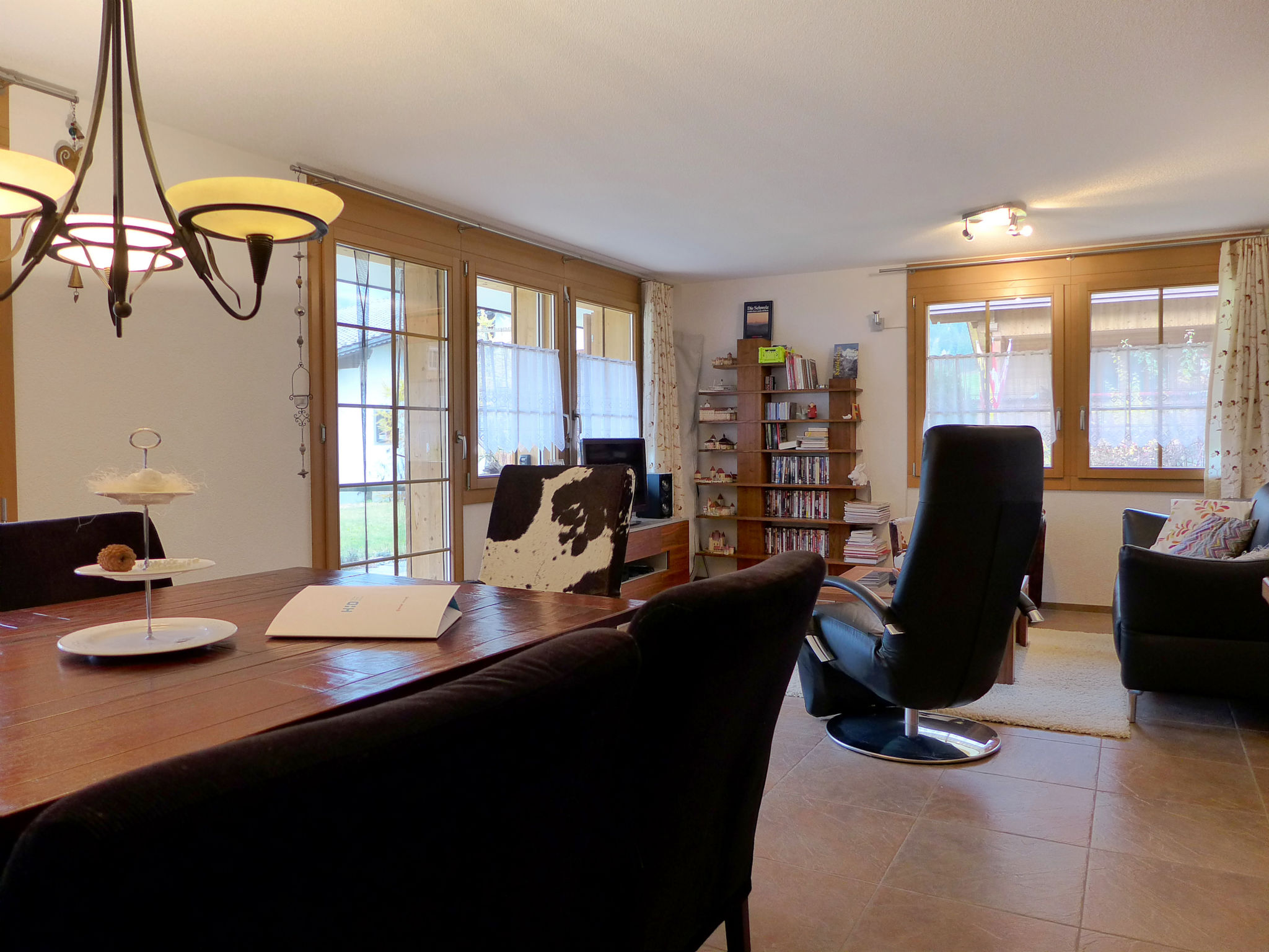 "Laerchehus West", 3-room apartment 80 m2, on the ground floor, south-west facing position. Spacious and bright, comfortable and tasteful furnishings: open living/dining room with dining table, digital TV, radio, CD-player, DVD and DVD collection available. Exit to the terrace. 1 room with 1 double bed (180 cm, length 200 cm). 1 room with 2 beds (90 cm, length 200 cm). Large, open kitchen (oven, dishwasher, 4 ceramic glass hob hotplates, toaster, kettle, microwave, freezer, electric coffee machine, Capsules for coffee machine (Nespresso) extra, raclette grill, fondue Set (cheese)) with kitchen corner. Shower/WC. Underfloor heating. Large terrace 30 m2, south facing position and west facing position. Terrace furniture. Marvellous view of the mountains and the countryside. Facilities: iron, mosquito net, hair dryer. Internet (WiFi, free). Parking (roofed). Please note: non-smokers only.