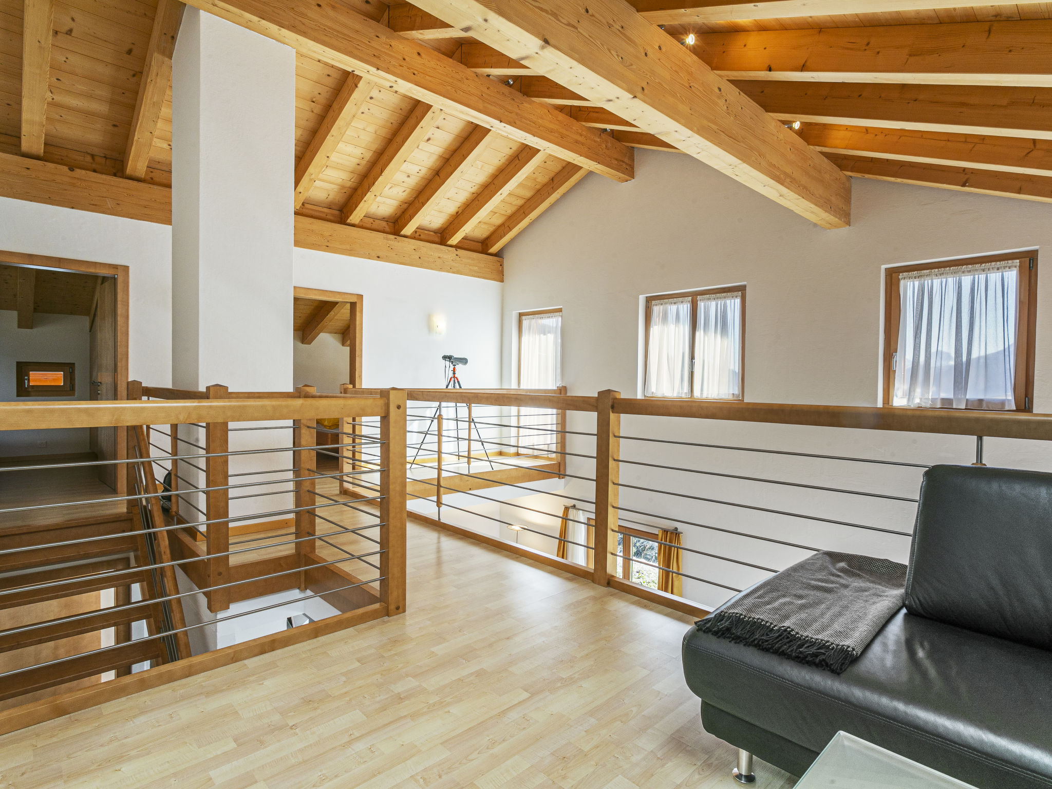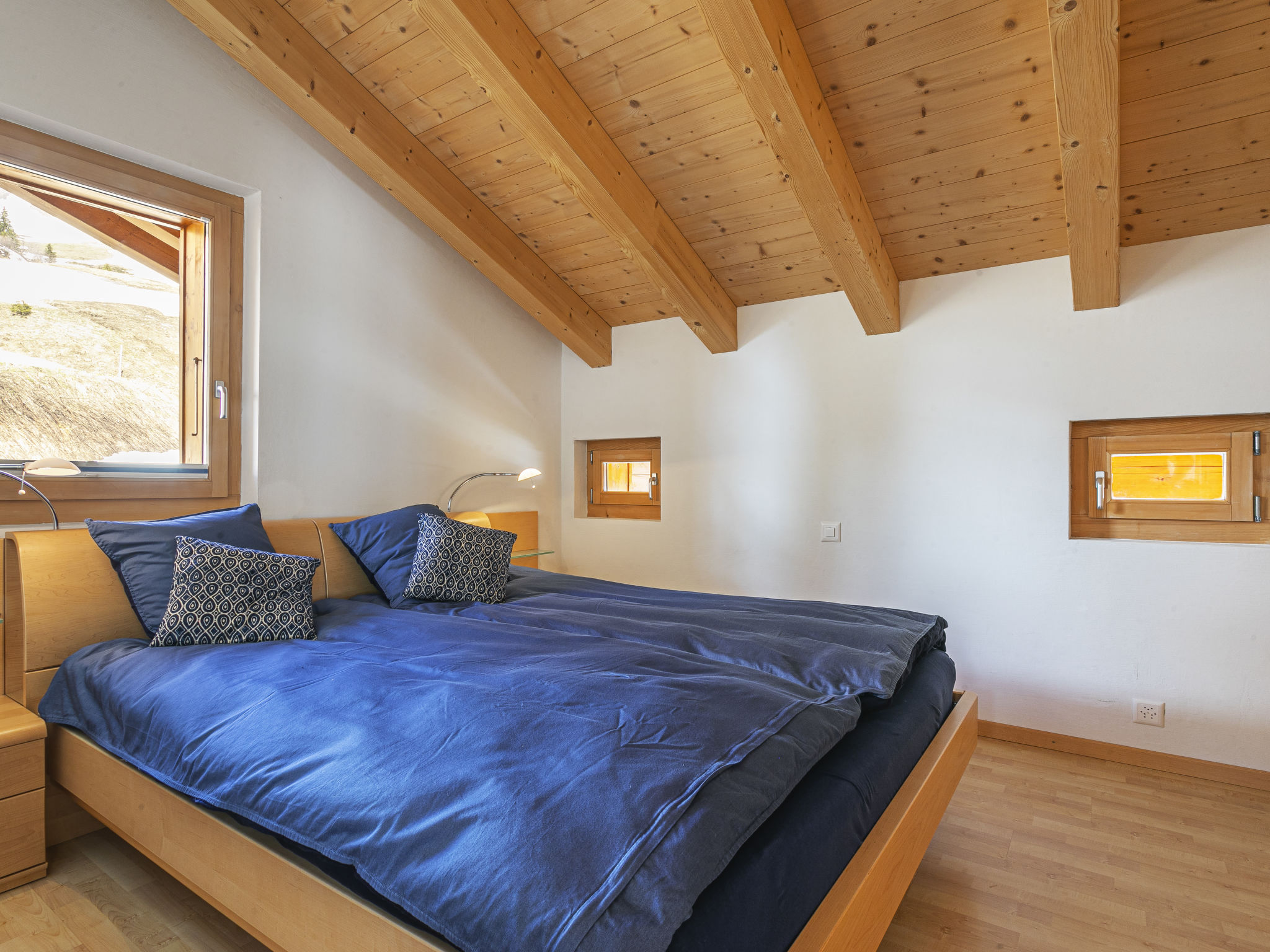 "Martens", 4-room chalet 150 m2 on 2 levels, south-west facing position. Luxurious and tasteful furnishings: living/dining room with panoramic window with open-hearth fireplace and TV. Exit to the terrace. 1 room with 1 double bed (160 cm, length 200 cm), bath/WC. Exit to the terrace. Open kitchen (oven, dishwasher, 4 ceramic glass hob hotplates, toaster, kettle, microwave, electric coffee machine, Capsules for coffee machine (Nespresso) extra, raclette grill, fondue Set (chinoise, cheese)). Sep. WC. Upper floor: 1 room with 1 double bed (160 cm, length 200 cm). 1 room with 1 double bed (160 cm, length 200 cm). Gallery. Shower/WC. Very beautiful view of the mountains, the ski run, the countryside and the resort. Facilities: hair dryer. Internet (WiFi, free). Please note: non-smokers only. In winter the access road to the chalt is closed due to snow. Multipass is included.