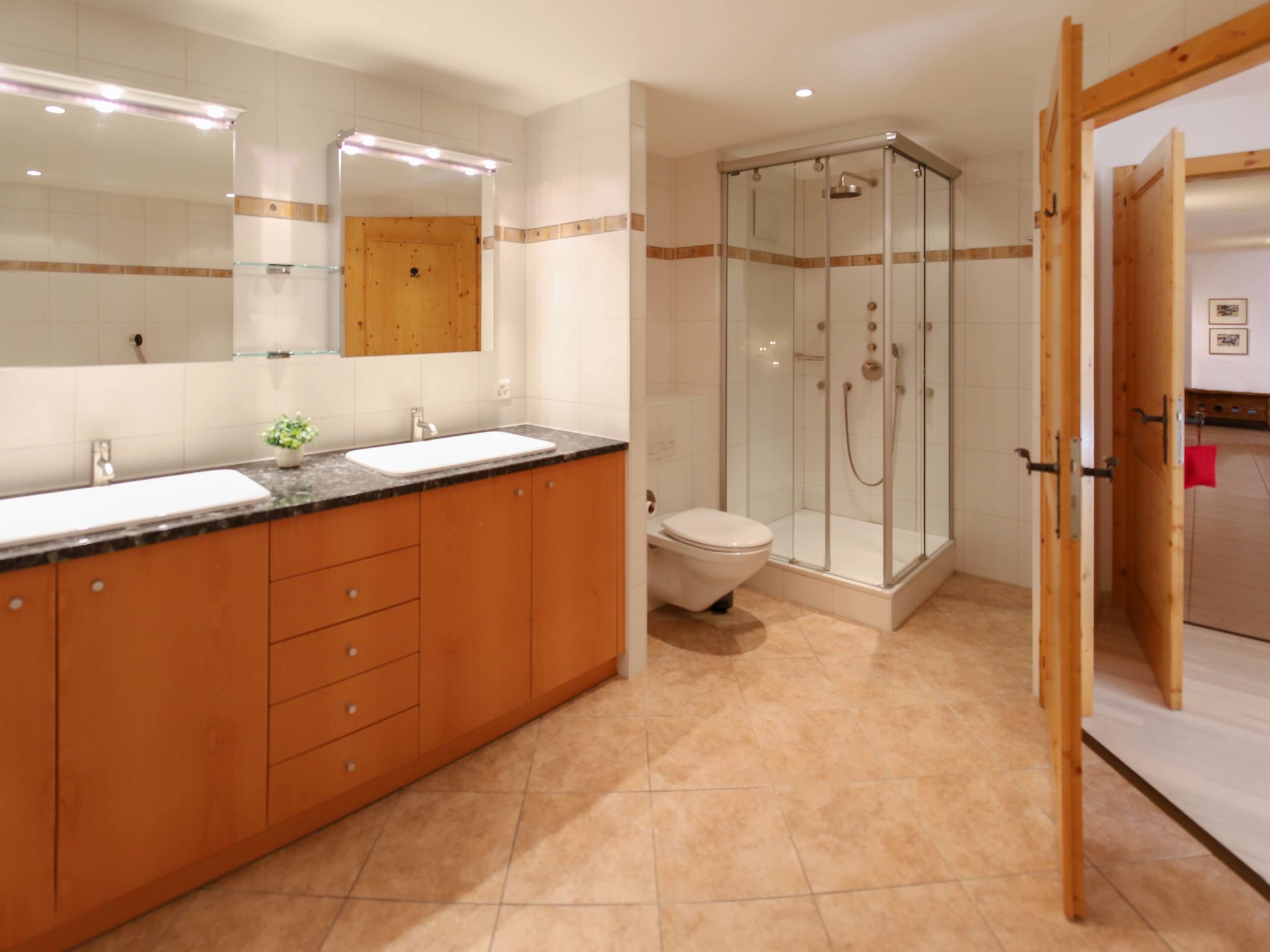 "Les Cîmes 8", 4-room apartment 164 m2 on 2nd floor, south-west facing position. Very comfortable and beautiful furnishings: large living/dining room with open-hearth fireplace, dining table and TV (flat screen). Exit to the balcony, south facing position and west facing position. 1 room with 2 beds (90 cm, length 200 cm). Exit to the balcony. 1 room with 1 double bed (2 x 90 cm, length 200 cm), bath/shower/WC and double hand-basin. Exit to the balcony, west facing position. 1 room with 1 double bed (2 x 90 cm, length 200 cm), bath/WC and double hand-basin. Exit to the balcony. Open kitchen (oven, dishwasher, 4 ceramic glass hob hotplates, toaster, kettle, microwave, freezer, electric coffee machine, Capsules for coffee machine (Nespresso) extra, raclette grill, fondue Set (cheese)). Shower/WC. Large balcony 38 m2, south facing position and west facing position, small balcony 1 m2, west facing position. Balcony furniture, barbecue, deck chairs (2). Very beautiful panoramic view of the mountains. Facilities: iron, hair dryer. Internet (WiFi). Garage space n 64. Please note: non-smokers only.