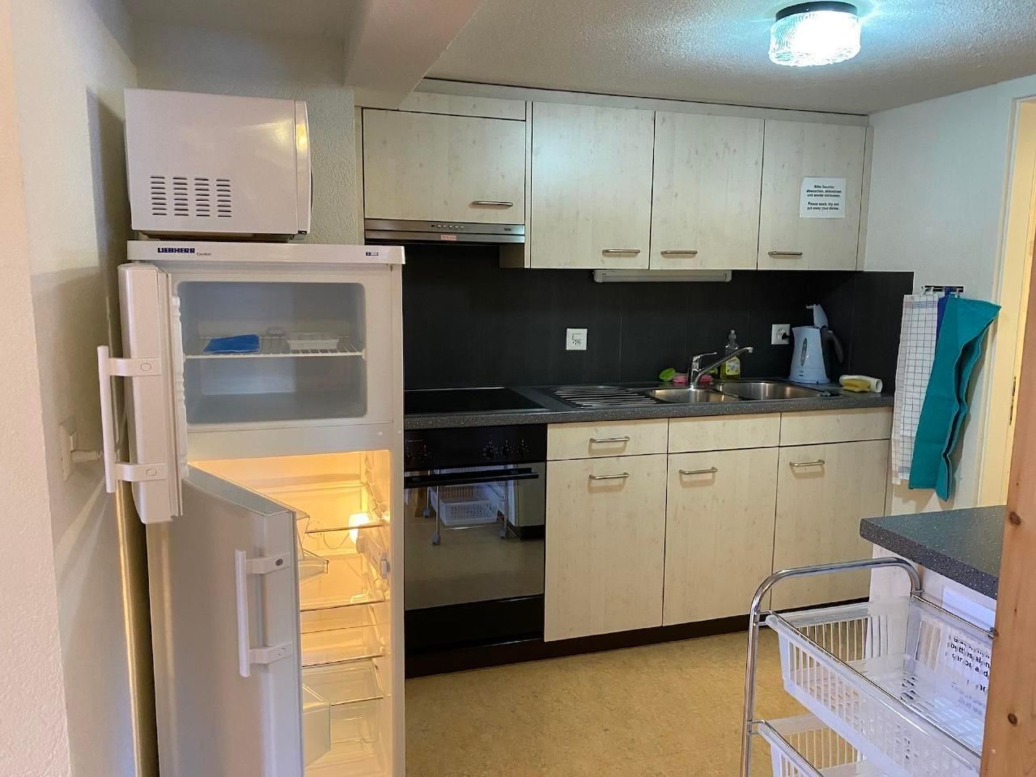 The flat has a separate bedroom and a living room. With three single beds in the bedroom and a comfortable sofa bed for two people. The flat has a kitchen and is fully equipped, including a fondue set, oven and a basic supply of oil, vinegar, sugar, salt and pepper. The bathroom has a large shower, including shower gel and towels.