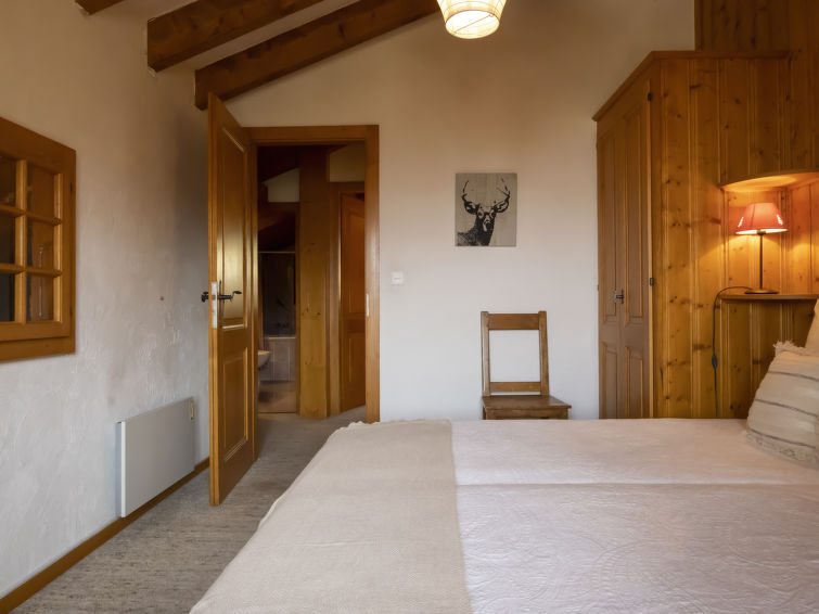 "Licorne 13", 4-room apartment 100 m2 on 2 levels on 2nd floor. Spacious and bright, comfortable and beautiful furnishings: large living/dining room with open-hearth fireplace and electric heating. 1 room with 2 beds (90 cm, length 200 cm). Open kitchen (4 hot plates, oven, dishwasher, toaster, kettle, electric coffee machine, Capsules for coffee machine (Nespresso) extra, raclette grill, combination microwave, fondue Set (cheese)) with bar. Shower/WC. Upper floor: open gallery with sloping ceilings with cable TV, radio and CD-player. 1 room with 1 x 2 bunk beds (90 cm, length 200 cm). 1 room with 1 double bed (2 x 90 cm, length 200 cm). Bathroom. Large balcony, south facing position. Terrace furniture. Panoramic view. Facilities: Internet (WiFi, free). Parking space n 13. Please note: non-smoking house.