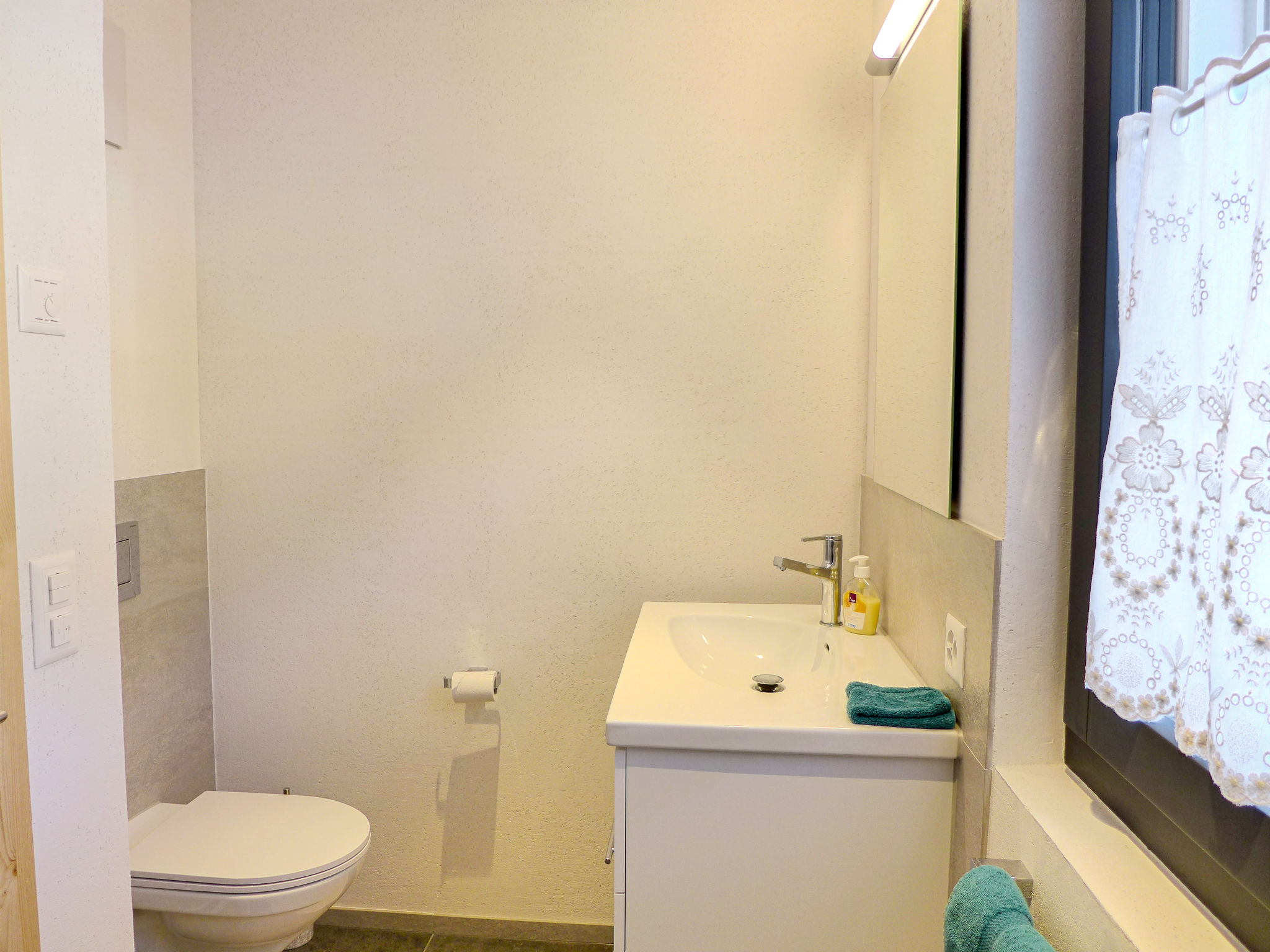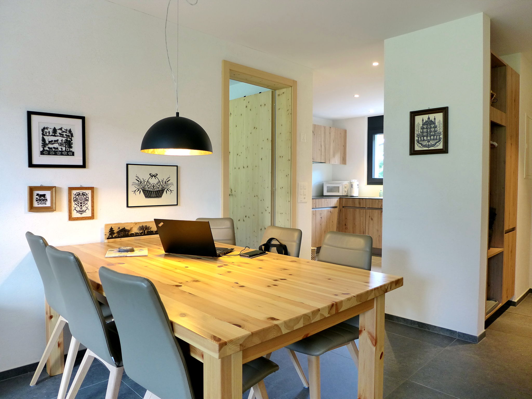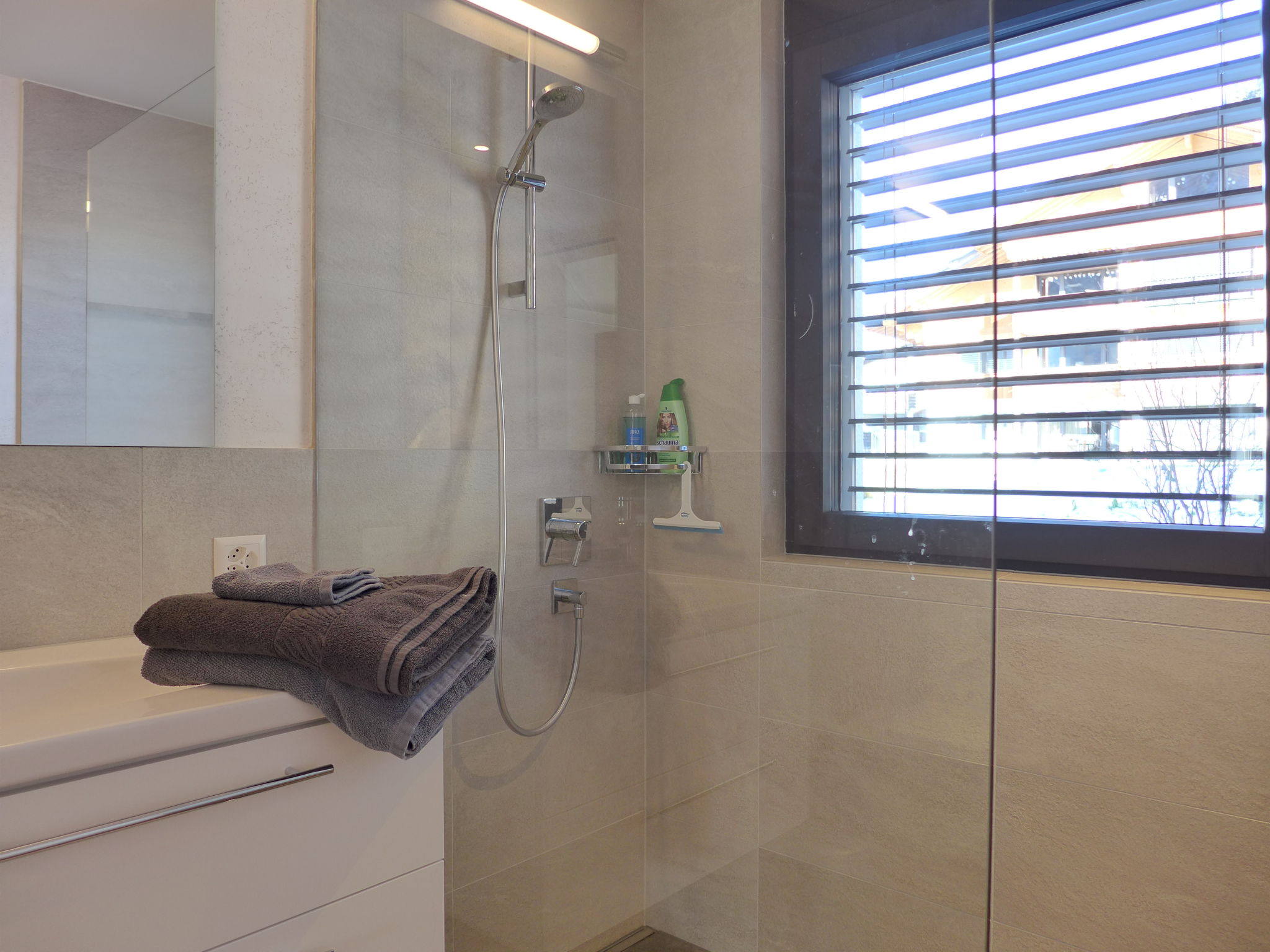 "Greenview", 2-room apartment 62 m2, on the ground floor, south-west facing position. Spacious and bright, very comfortable and cosy furnishings: open living/sleeping room with 1 sofabed, dining table and cable TV. Exit to the terrace. 1 room with 1 double bed (2 x 90 cm, length 200 cm), shower/WC. Exit to the terrace. Open kitchen (oven, dishwasher, 4 induction hot plates, toaster, kettle, microwave, electric coffee machine, Capsules for coffee machine (Nespresso) extra, raclette grill, fondue Set (cheese)). Shower/WC. Solar energy heating, underfloor heating. Solar power. Large terrace. Terrace furniture. Marvellous view of the mountains and the countryside. Facilities: Internet (WiFi, free). Parking (roofed, 1 car). E-charging station. Please note: non-smokers only. 1 small pet/ dog allowed.