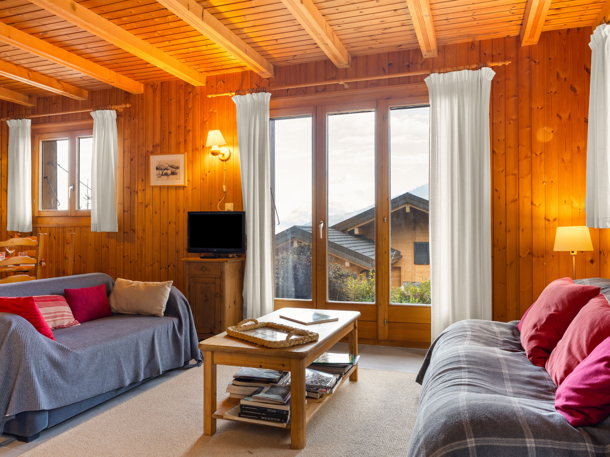 Les Flats 6 km from Val d'Illiez: Cosy, rustic chalet "Seravalle", 1'450 m a.s.l., surrounded by meadows. Outside the resort, 6 km from the centre of Val d'Illiez, in a quiet, sunny position on a slope, in a cul-de-sac. 500 m long narrow motor access to the house. 4x4 car recommended in winter. Single garage, public parking 100 m. Grocery 6 km, supermarket 9 km, shopping centre 15 km, restaurant 6 km, bakery 6 km, bus stop "Les Ayers" 1 km, railway station "Val d'Illiez" 6 km, outdoor swimming pool 9 km, indoor swimming pool 9 km. Sports centre 9 km, gondola lift 9 km, slopes 4.5 km, ski rental 4.5 km, cross country ski track 10 km, ice rink 9 km. Well-known ski regions can easily be reached: Portes du Soleil. Please note: car recommended.