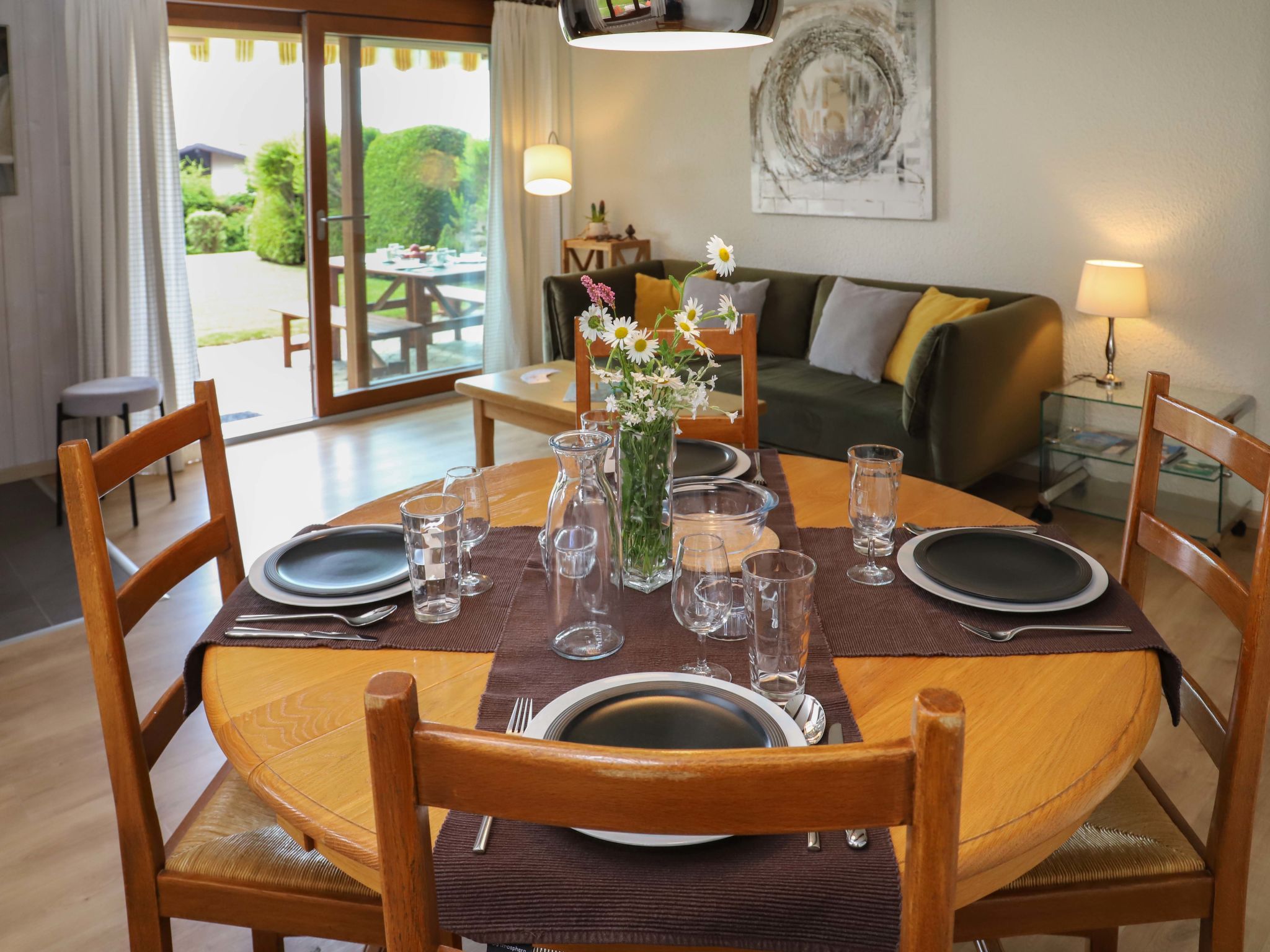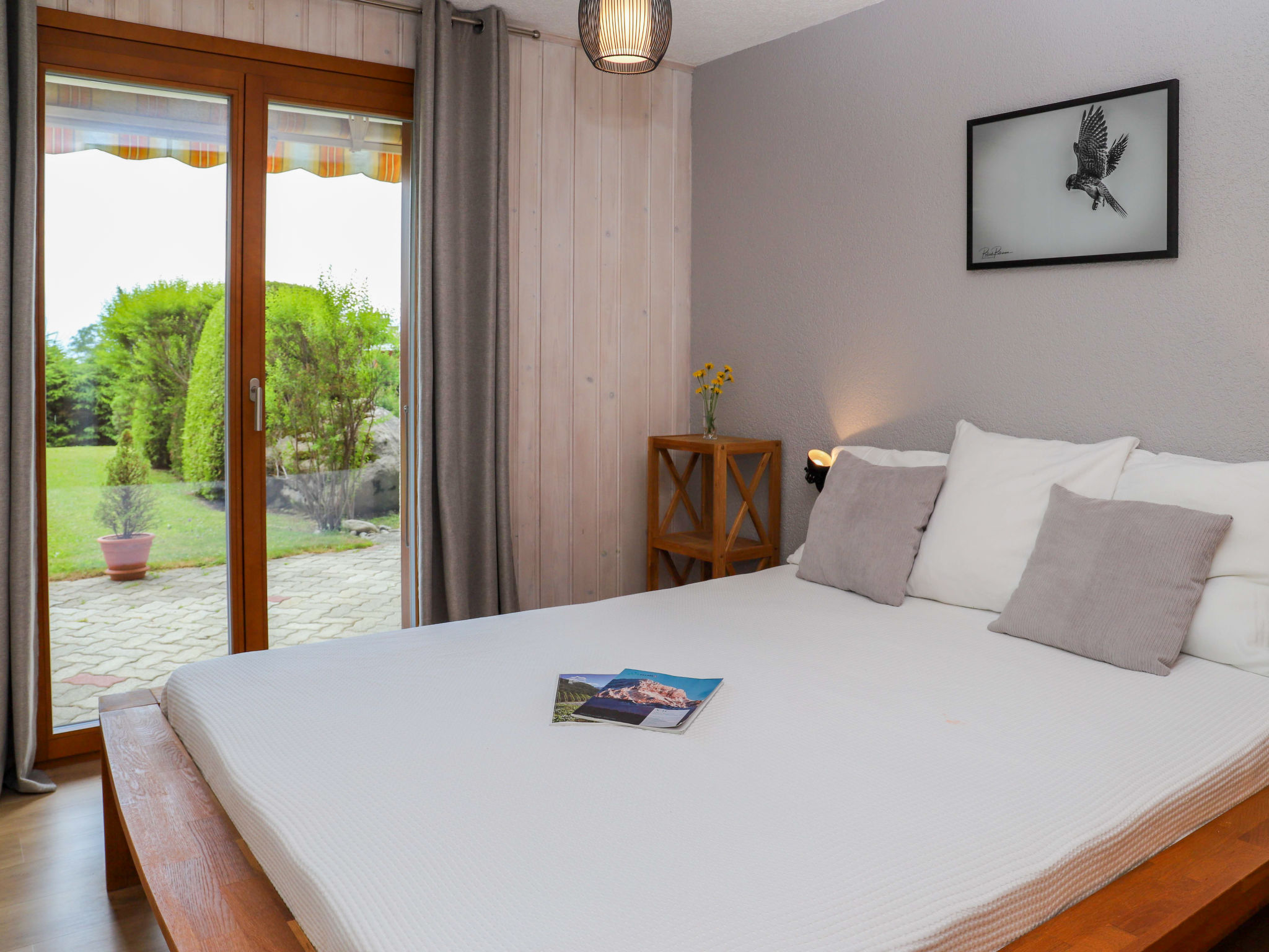 "Chantebrise A1", 3-room apartment 78 m2, on the ground floor, south facing position. Bright, practical and comfortable furnishings: living/dining room with Scandinavian wood stove, dining table and TV (flat screen). Exit to the garden, south facing position. 1 room with 1 french bed (1 x 160 cm). Exit to the garden, south facing position. 1 room with 1 x 2 bunk beds (120 cm). Open kitchen (oven, dishwasher, 4 ceramic glass hob hotplates, microwave, freezer, electric coffee machine, Capsules for coffee machine (Nespresso) extra, raclette grill, fondue Set (chinoise, cheese)). Exit to the garden, east facing position. Bath/WC, shower/WC. Large garden, south facing position and, east facing position. Terrace furniture, barbecue. Beautiful view of the mountains. Facilities: hair dryer. Internet (WiFi, free). Garage space n 1. Please note: non-smokers only.