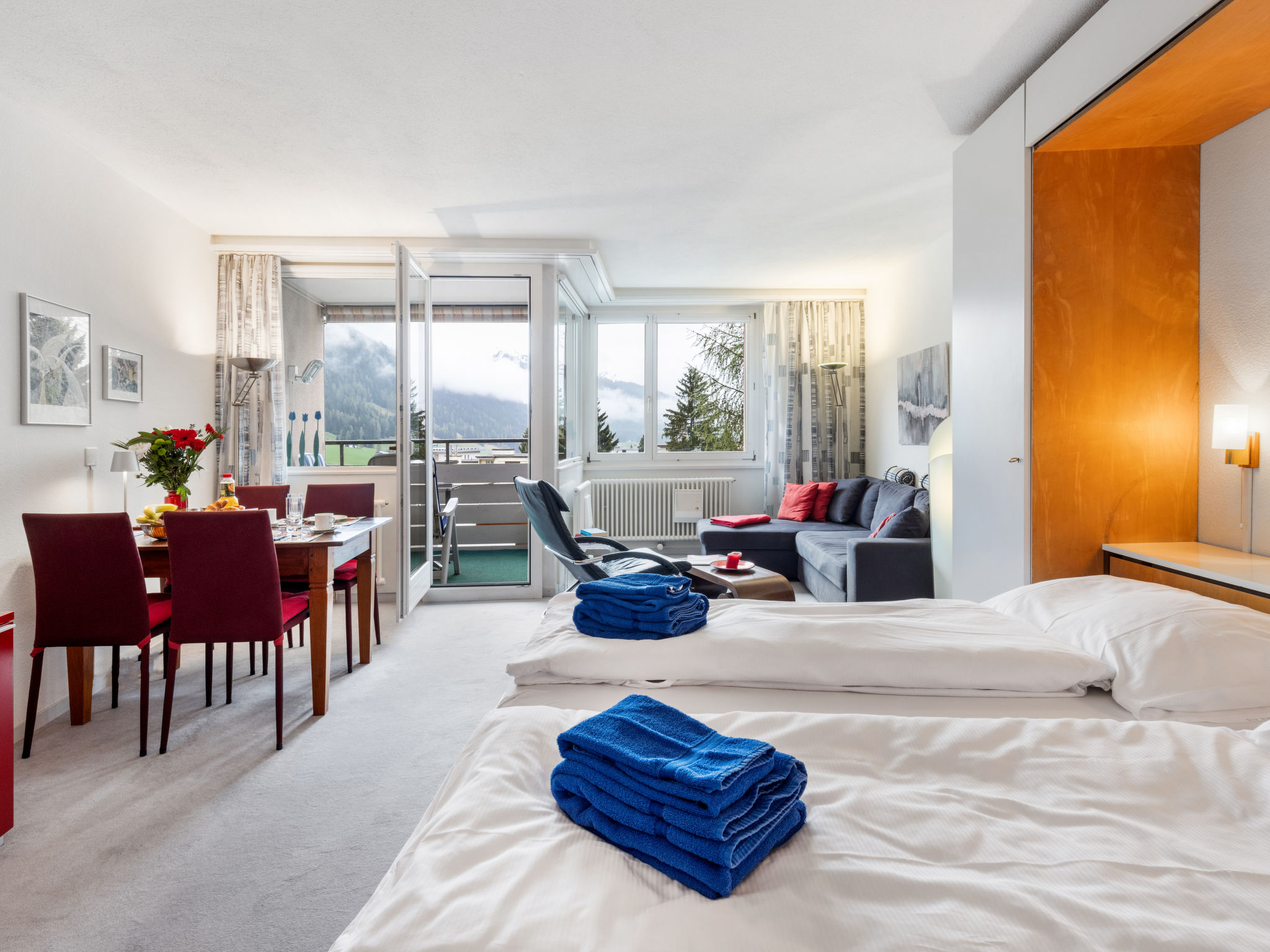 Davos Platz: Beautiful apartment block "Parkareal (Utoring)", built in 1966. 300 m from the centre, in a quiet, sunny, elevated position on a slope, 500 m from the skiing area, in a cul-de-sac, in the countryside. In the house: reception, lounge, sauna (extra). Solarium (extra). Table tennis, playroom, lift, storage room for skis, central heating system. Parking at the house, communal covered parking. Shop, grocery 300 m, supermarket, restaurant, bus stop, railway station 300 m, outdoor swimming pool 2.5 km, indoor swimming pool 2.5 km. Cable car, mountain railway, ski lift, ski bus stop 300 m, ski school 500 m, sled run 700 m, cross country ski track 500 m, ice rink 1.5 km. Hiking paths: Rienerhorn, Jakobshorn. Die Wohnungen mit Südlage ab dem 4. Stockwerk verfügen über eine herrliche Bergsicht. Parkplatz: im Sommer CHF 3.00/Tag, im Winter CHF 5.00/Tag. Einstellhalle: im Sommer CHF 5.00/Tag, im Winter CHF 8.00/Tag. Reservierung bei Ankunft.