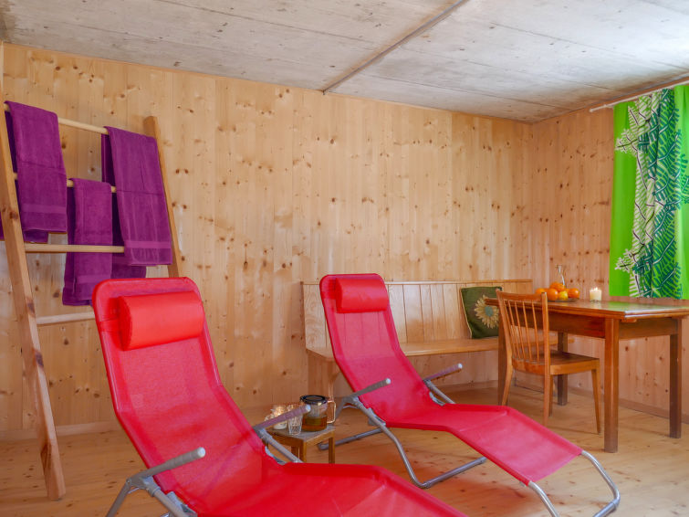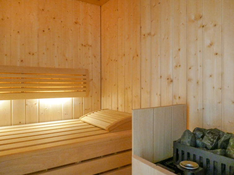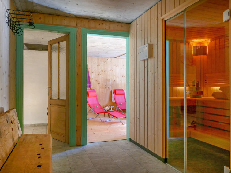 "Al Noce", 4-room house 130 m2 on 2 levels. Spacious and bright, practical and comfortable furnishings: open living/dining room with panoramic window south facing position with open-hearth fireplace, cable TV, DVD, DVD collection available and electric heating. Exit to the balcony. 1 double bedroom with 1 double bed (2 x 90 cm, length 190 cm). 1 double bedroom with 1 double bed (1 x 160 cm, length 190 cm). Open kitchen (3 hot plates, oven, freezer, electric coffee machine, Capsules for coffee machine (Nespresso) extra, raclette grill, fondue Set (cheese)). Bath/bidet/WC. On the lower ground floor: (ladder) with dining nook, hi-fi system and wood-burning stove. Shower/WC, Sauna. Large balcony. Balcony furniture, deck chairs (2). Beautiful view of the mountains and the valley. Facilities: washing machine, dryer, iron, children's high chair, baby cot for up to 3 year olds (extra), hair dryer, logs (free). Internet (WiFi, free). Please note: suitable for families. Non-smoking house. Fire extinguisher. NL-00002077