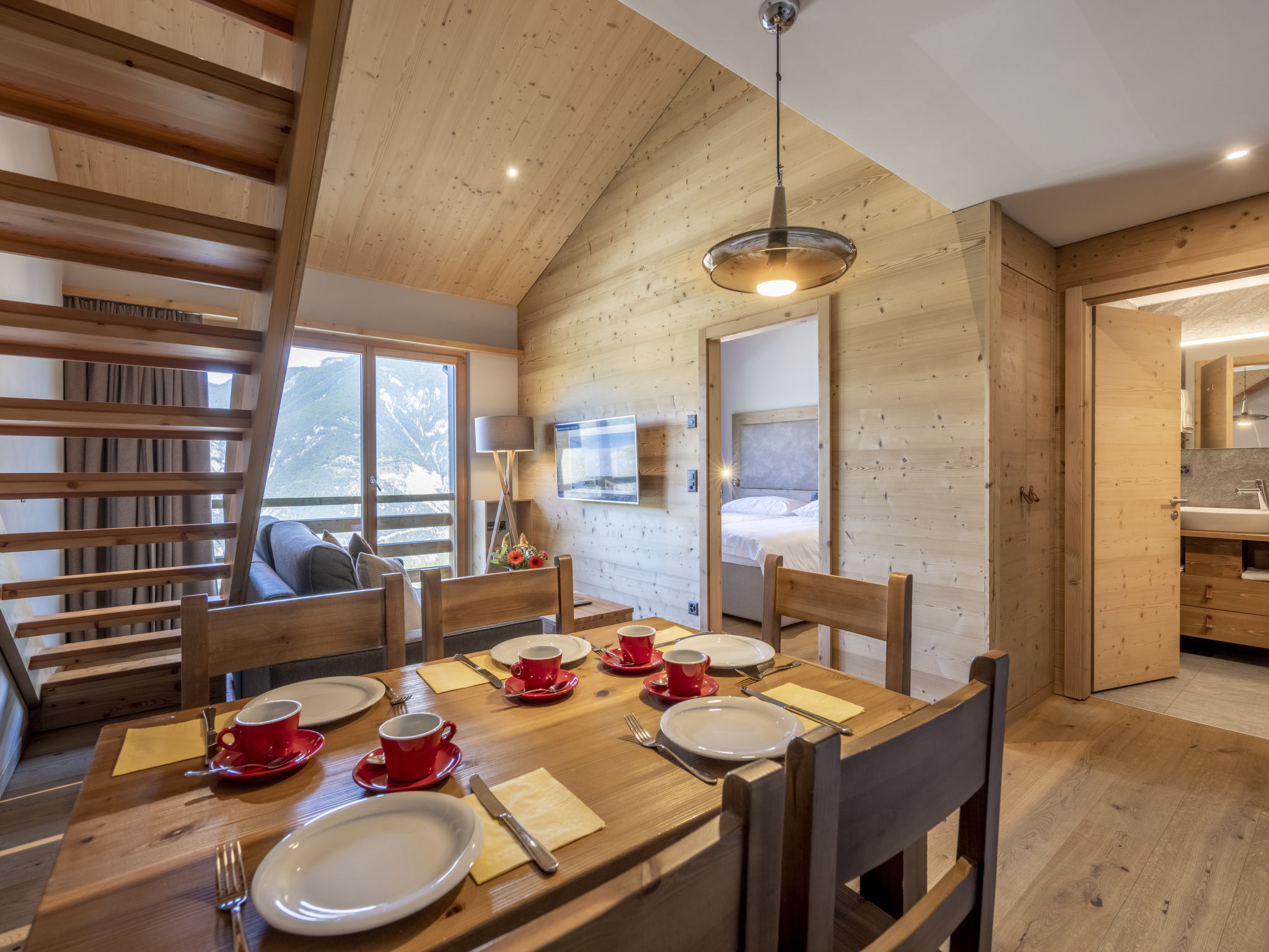 "3 room apartment DUPLEX", 3-room apartment 55 m2 on 2 levels. Tasteful and cosy furnishings: living/dining room with dining table, digital TV, international TV channels and flat screen. 1 room with 1 double bed (2 x 90 cm, length 200 cm). Open kitchen (oven, dishwasher, 4 ceramic glass hob hotplates, electric coffee machine, Capsules for coffee machine (Nespresso) extra). Shower/WC. Underfloor heating. Upper floor: 1 room with 1 bed (90 cm, length 200 cm), 1 x 2 bunk beds (90 cm, length 200 cm). Bath/WC. Underfloor heating. Parquet floors. Facilities: hair dryer. Internet (WiFi, free). Please note: non-smoking house. 1 pet/ dog allowed. Smoke alarm. The property is one of a type of property or apartment. A fondue set (meet or cheese) as well as a raclette grill can be borrowed at the reception against a deposit.