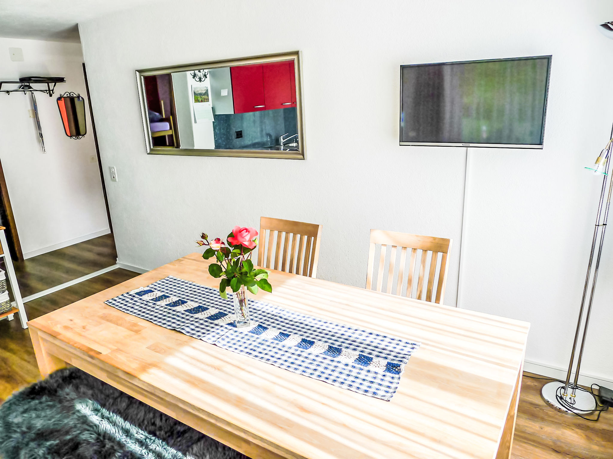 3-room apartment 60 m2, on the ground floor, south facing position. Renovated in 2019, tasteful and cosy furnishings: living/dining room with satellite TV (flat screen). Exit to the patio. 1 double bedroom. 1 room with 1 bed and 1 x 2 bunk beds. Open kitchen (oven, 4 ceramic glass hob hotplates). Shower/WC. Patio. Terrace furniture. Beautiful view of the mountains, the countryside and the resort. Facilities: Internet (WiFi, free). Parking at the house. Please note: non-smokers only. Maximum 1 pet/ dog allowed.