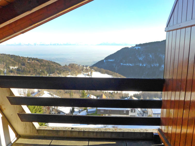 3-room apartment 105 m2 on 2 levels on 3rd floor, south facing position. Comfortable and cosy furnishings: living/dining room with open-hearth fireplace and dining table. Exit to the balcony. 1 double bedroom with 1 double bed. Open kitchen (oven, dishwasher, 4 induction hot plates, toaster, kettle, microwave, electric coffee machine). Bathroom, sep. WC. Upper floor: 1 room with sloping ceilings with 3 beds. Open gallery with sloping ceilings with 1 bed. Exit to the balcony. Bathroom, sep. WC. Balcony, small balcony. Balcony furniture. Marvellous view of the mountains, the valley and the countryside. Facilities: hair dryer. Internet (WiFi, free). Parking at the house. Please note: suitable for families. Non-smokers only. Maximum 1 small pet/ dog allowed. Instead of an enclosed bedroom, some sleeping areas are located in an open-plan area (gallery, alcove, etc.).