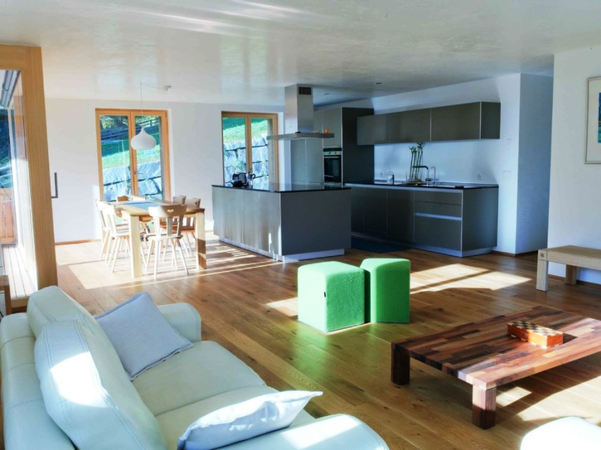 110 m2. More information by the provider: The 4.5 room apartment was newly built in 2011 and is luxurious and comfortably furnished. The kitchen is opened to the dining and living room, the Bullhaup b3 kitchen leaves nothing to be desired when it comes to equipment. 3 double bed rooms (double and single beds), one of them equipped with a rain shower, toilet and sink. Another bathroom with bathtub with possibilty to shower and toilet. Living room with fireplace, high speed internet, WIFI, internet radio, MP2 and digital LED TV, as well as Apple tv. Bath and kitchen towels included. Flooring: wood