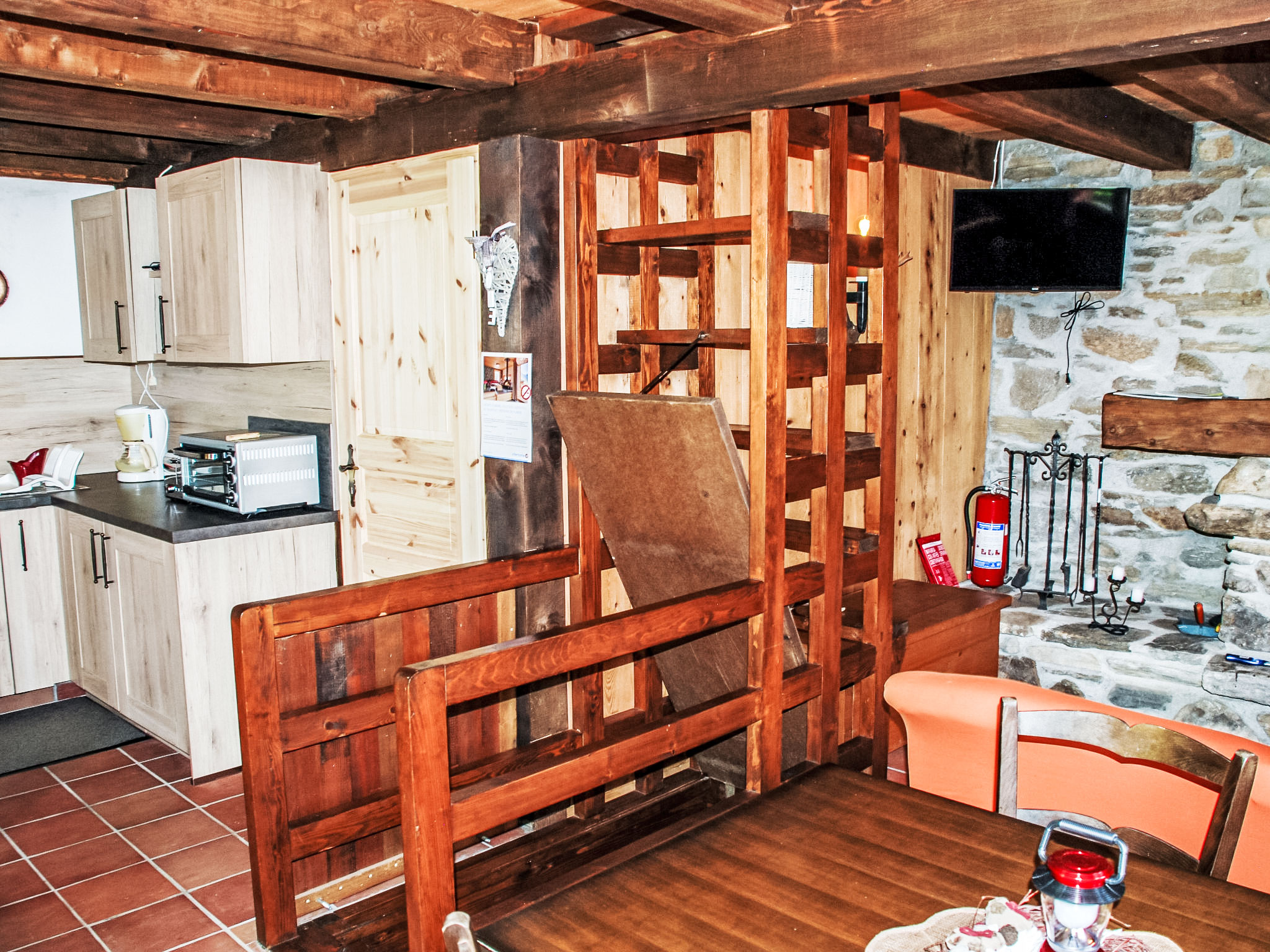 "Rustico Fey", 2-room cottage 50 m2 on 2 levels, south facing position. Comfortable and cosy furnishings: open living/dining room with open-hearth fireplace, dining table and TV (flat screen), radio. 1 room with 2 beds (90 cm, length 200 cm). Open kitchen (mini-oven, Gas stove, 3 gas rings, toaster, electric coffee machine) with bar and wood-burning stove. Exit to the patio. On the lower ground floor: (steep stair). Shower/WC. Terrace furniture, barbecue (portable), deck chairs (2). Marvellous panoramic view of the mountains, the valley and the countryside. Facilities: children's high chair, baby cot for up to 2 year olds (extra), hair dryer. Please note: non-smoking house. Maximum 1 small pet/ dog allowed. Fire extinguisher. NL-00003747