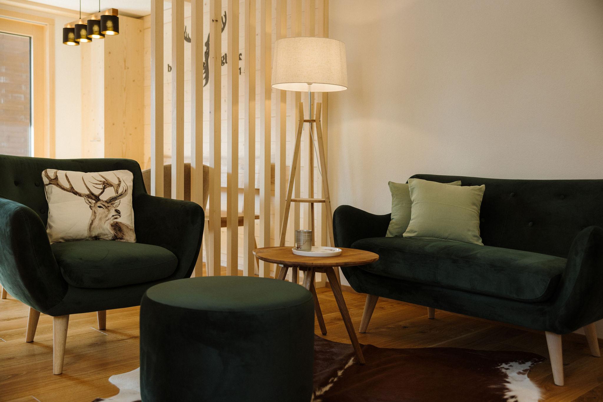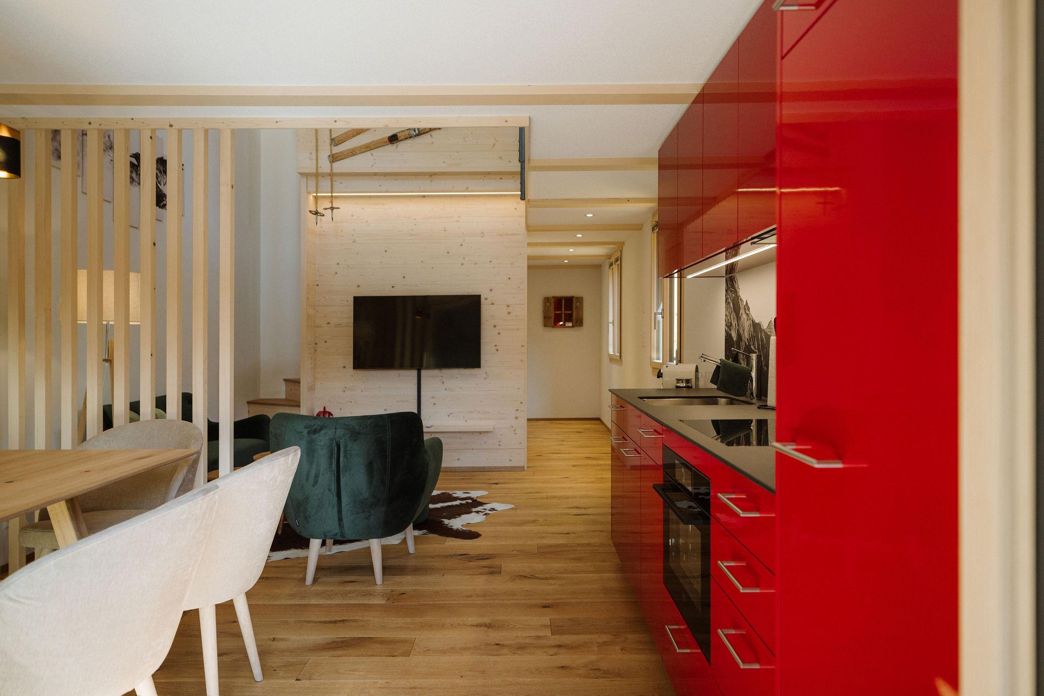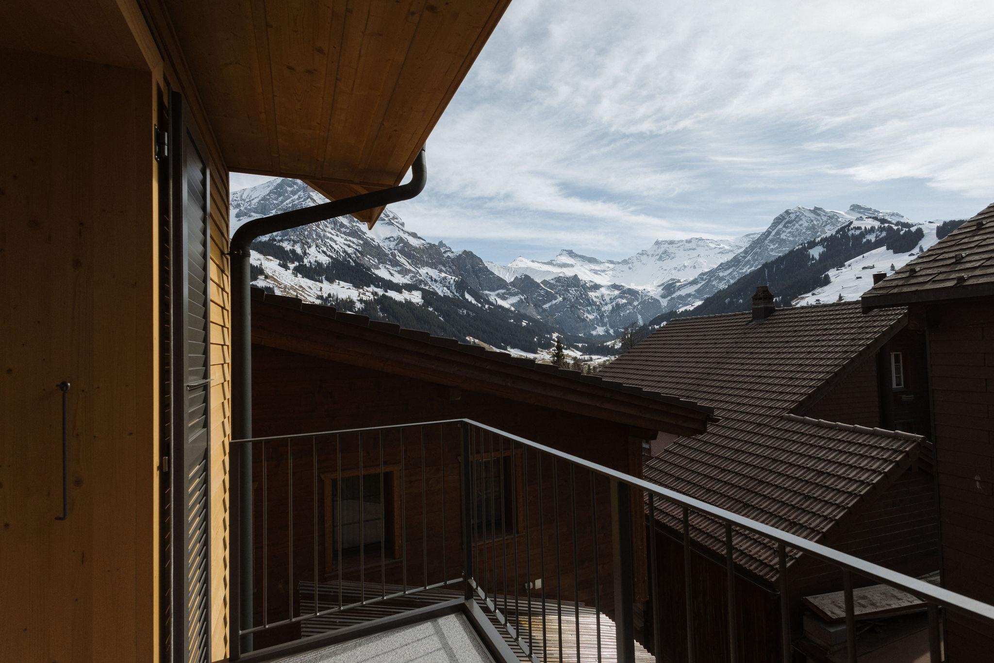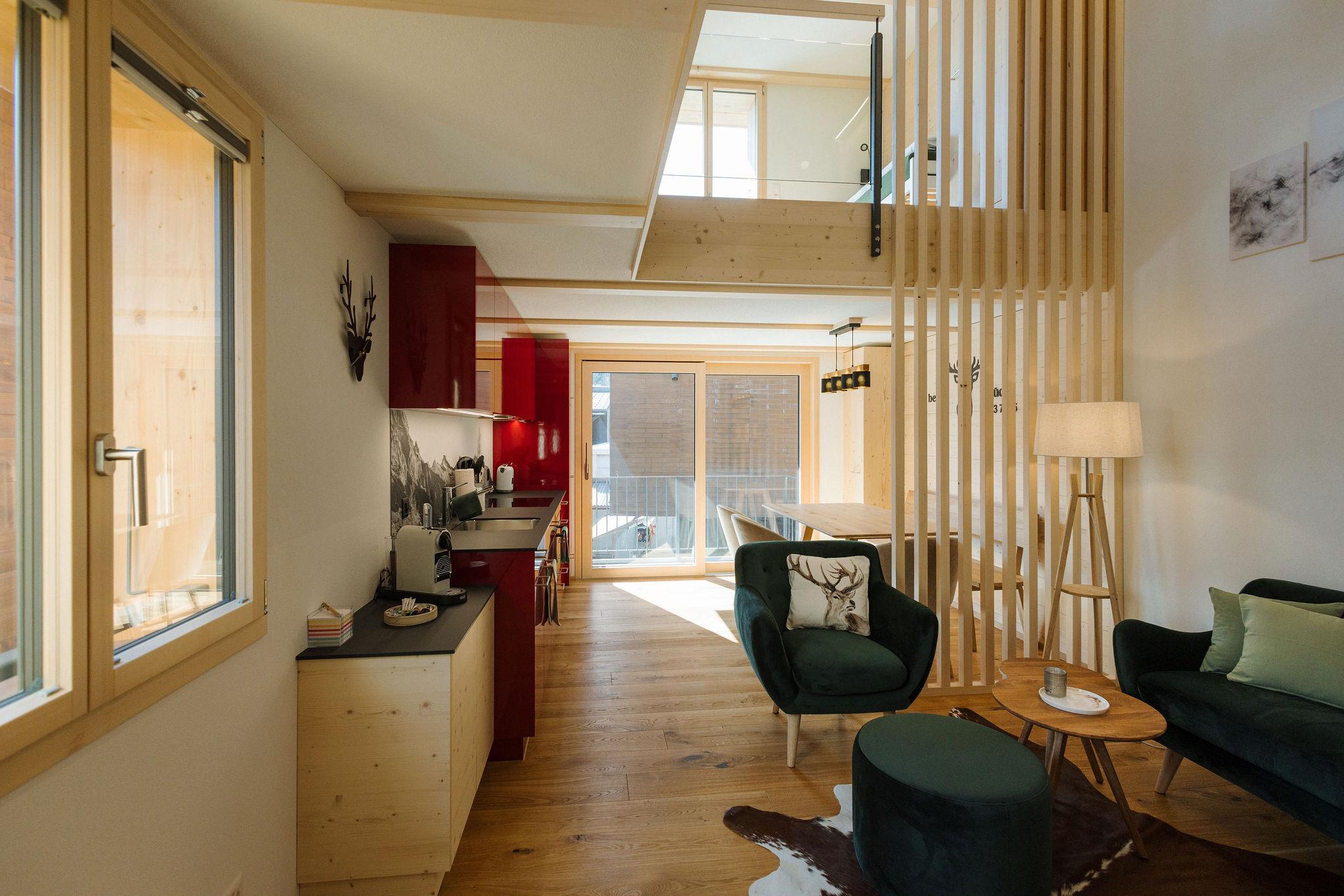 Le salon stylé avec canapé et fauteuil lounge jouxte directement la cuisine spacieuse avec un coin repas confortable. Le balcon supérieur, équipé d'une table d'appoint et de deux chaises, offre une vue magnifique sur le majestueux Wildstrubel et sur le légendaire Chuenisbärgli. Dans ce décor, il est agréable de déguster un café le matin ou un petit verre de vin le soir.