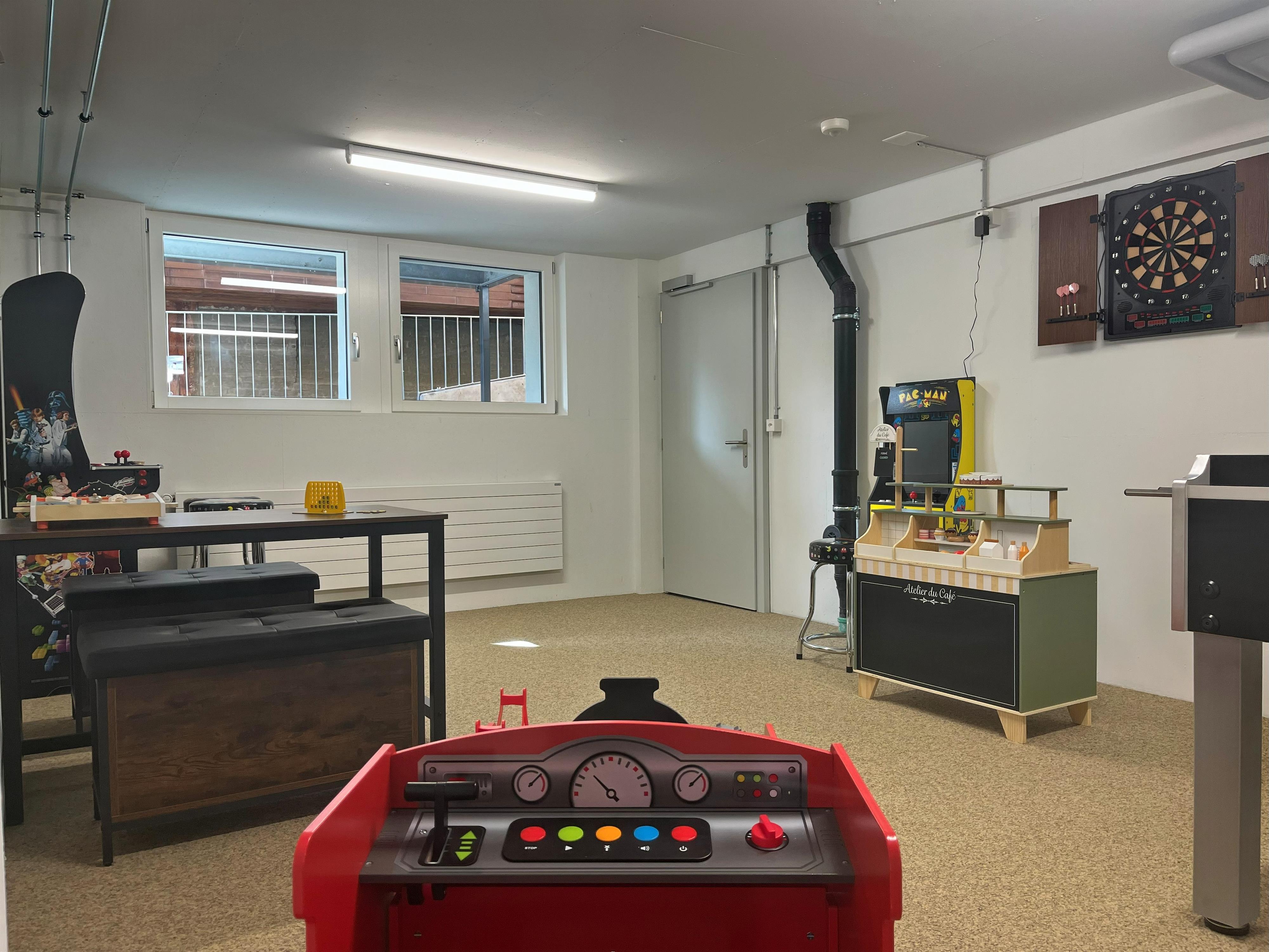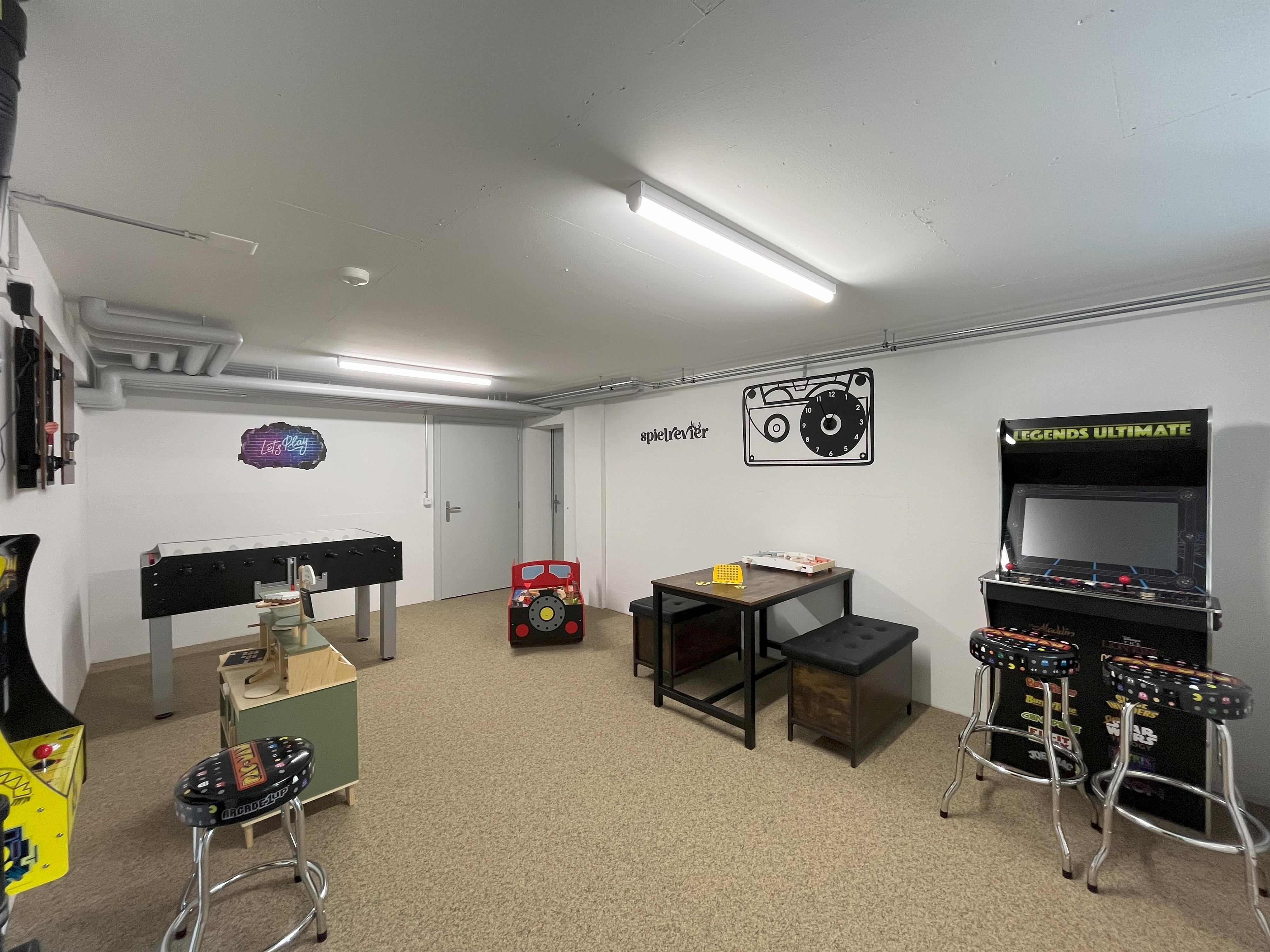 Au sous-sol de l'hébergement se trouve notre « SpielRevier » - une salle de jeux pour petits et grands avec des machines à sous rétro, une partycade Pac Man, des fléchettes, un baby-foot, un coin jeux pour les enfants avec une table de train, un bar à espresso en bois, un flipper de table duo et des jeux de société. Un paradis du jeu rien que pour vous et votre famille ou vos amis.