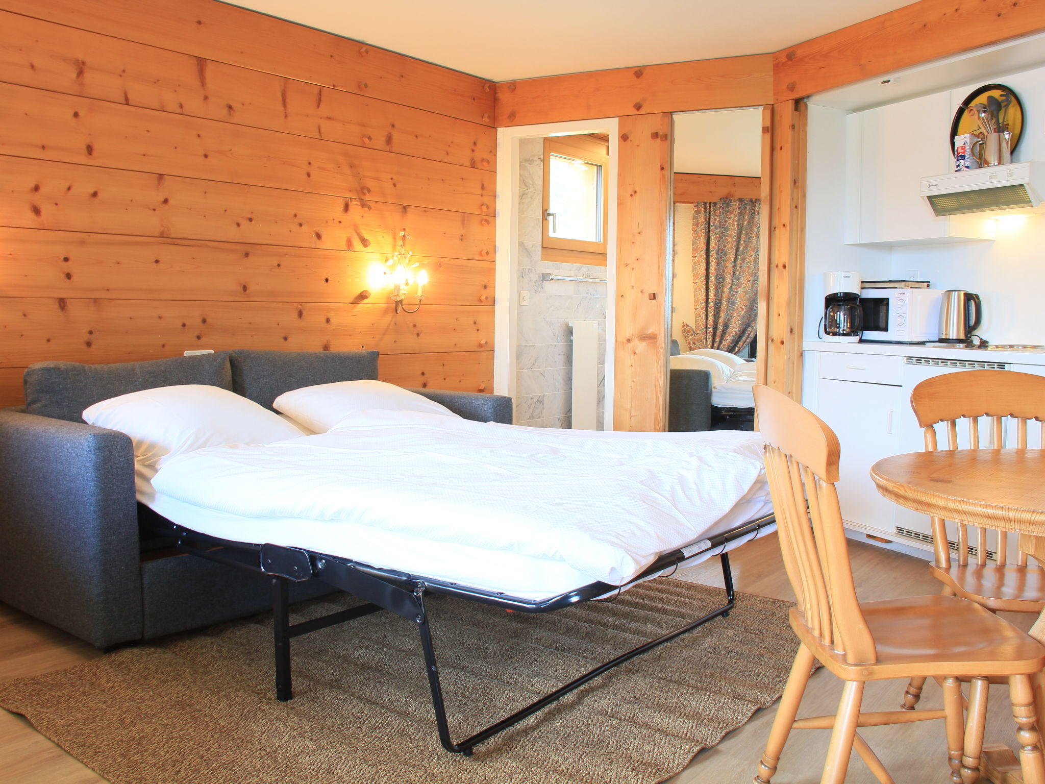 "Le Bristol A46", apt 2 pièces 55 m2 au 4ème étage. Clair, aménagement confortable et agréable: grand séjour/chambre à coucher avec 1 divan-lit double (1 x 140 cm, longueur 200 cm), douche/WC et TV (écran plat). Sortie sur le balcon, orientée ouest et orientée nord. 1 chambre double avec 2 lits (90 cm), bain/WC. Sortie sur le balcon, orientée nord et orientée est. Coin cuisine (2 plaques de cuisson, grille-pain, bouilloire électrique, micro-ondes, appareil à raclette, service à fondue (fondue au fromage)). 2 petits balcons 10 m2. Mobilier de balcon. Belle vue panoramique sur les montagnes et la vallée. A disposition: sèche-cheveux. Internet (Connexion WIFI, gratuit). Veuillez noter: logement non-fumeur. Maximum 1 animal/ chien autorisé.